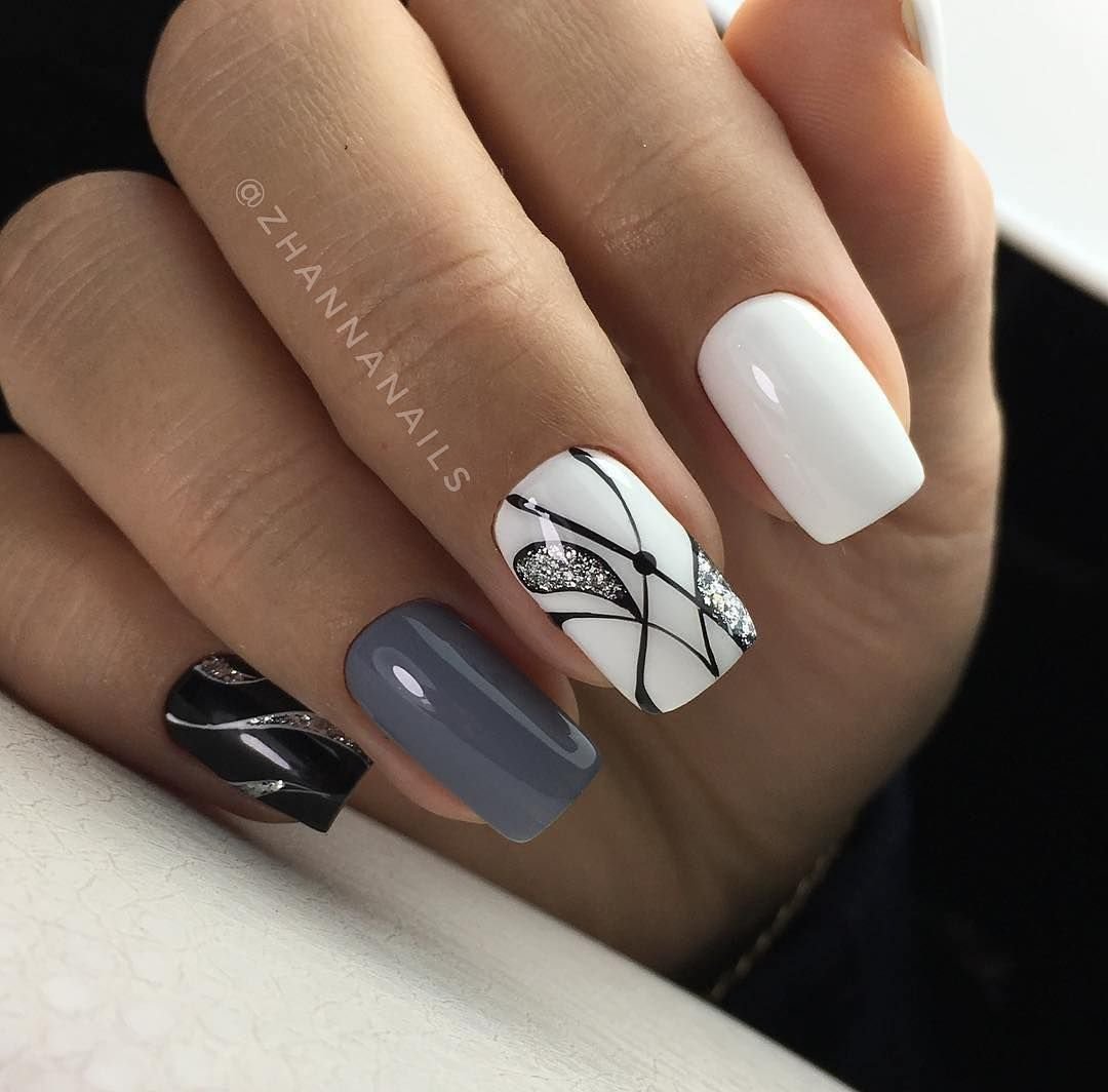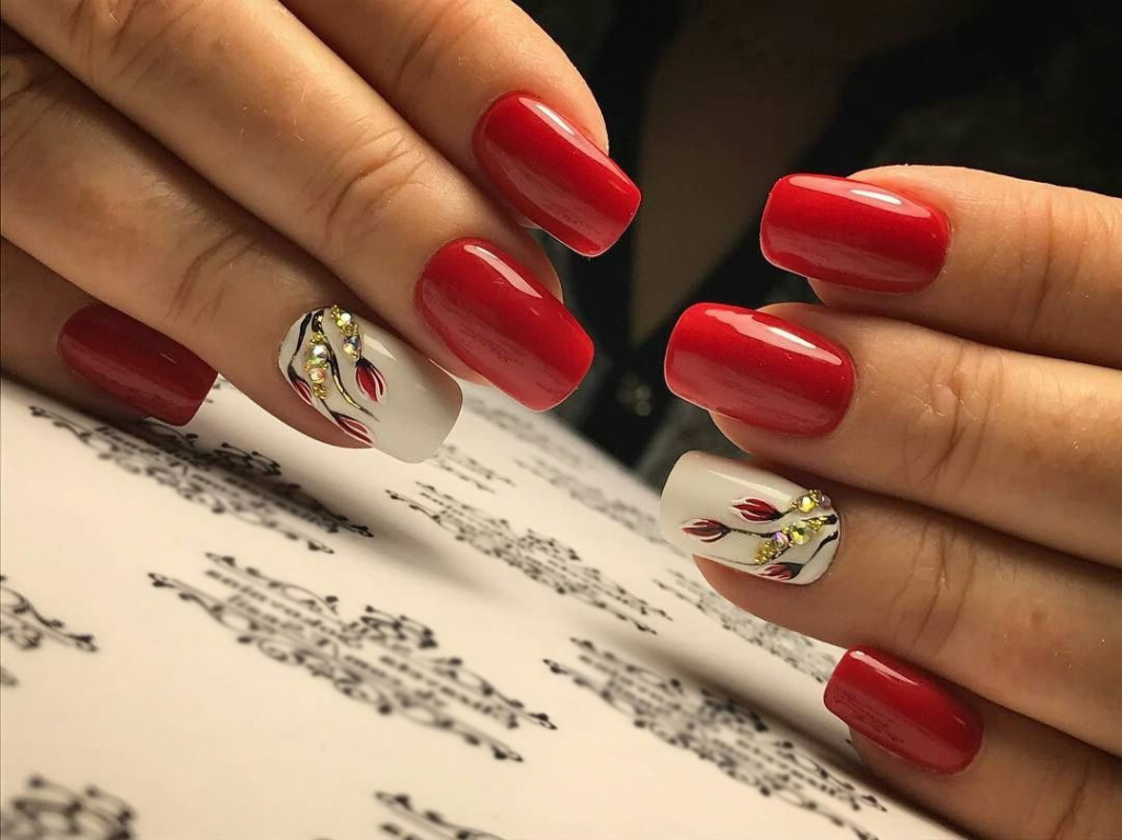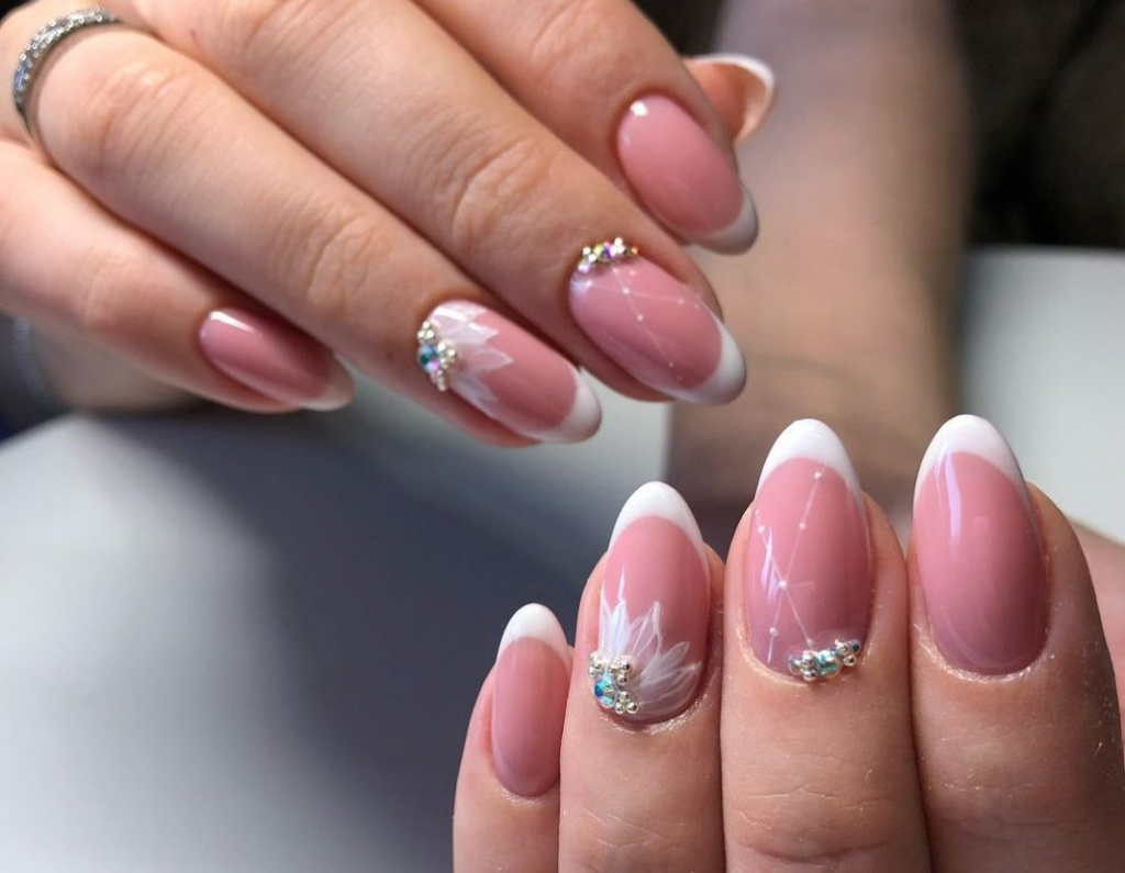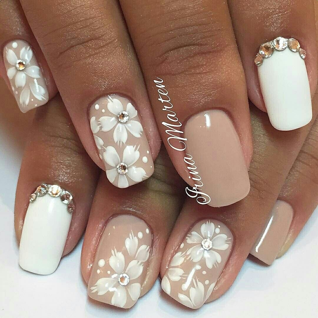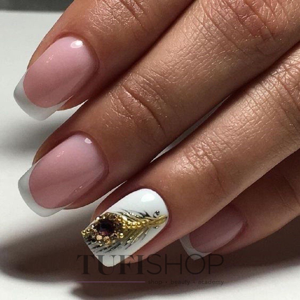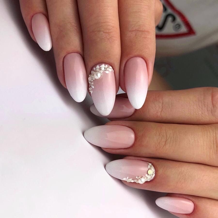 Еще один беспроигрышный вариант маникюра. Белый — это чистая база, на которой узор из камней смотрится свежо и интересно. И не стоит отдавать предпочтение только серебристым камням, выбирайте любой оттенок.