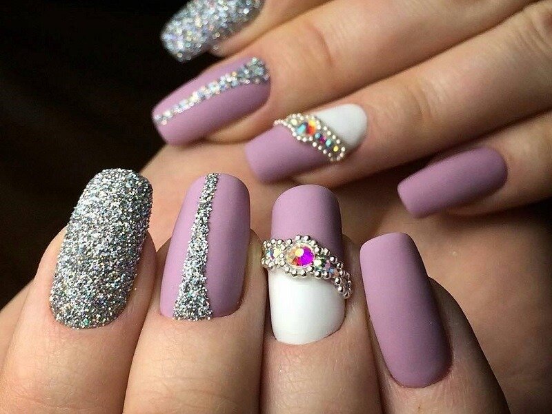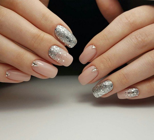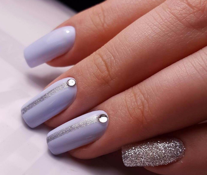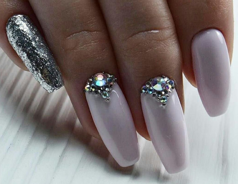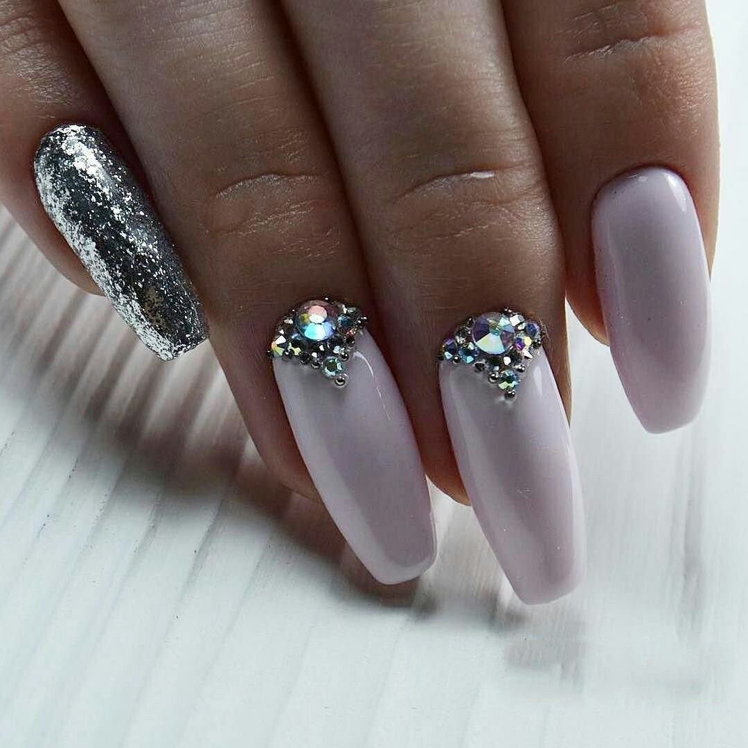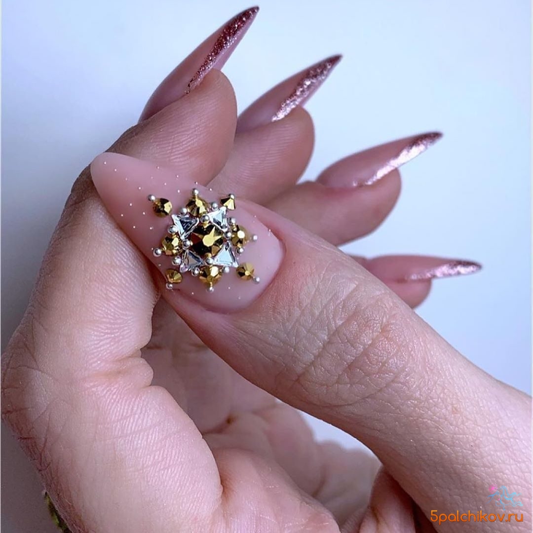 Блестки и стразы — неразлучная пара в маникюре. С их помощью можно создать минималистичный или активный праздничный дизайн ногтей. Чтобы не переборщить с блеском, рекомендуем оформлять стразами один ноготь на руке, а другой полностью покрывать блестками. Остальные ногти лучше оставить без дополнительного декора. такой маникюр будет выглядеть стильно и эффектно, а не пошло и чрезмерно.