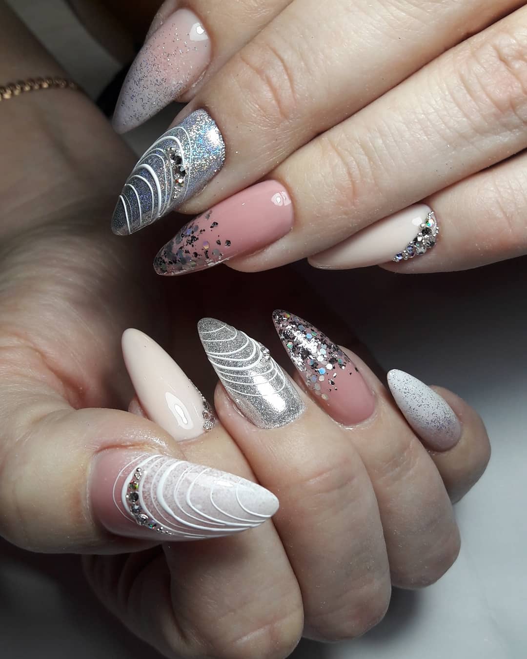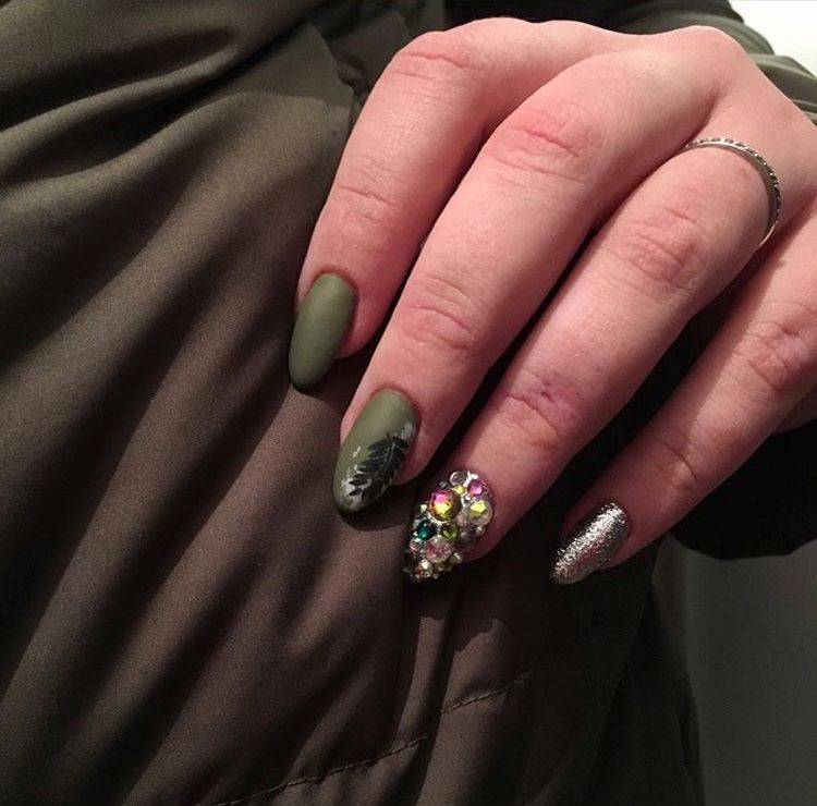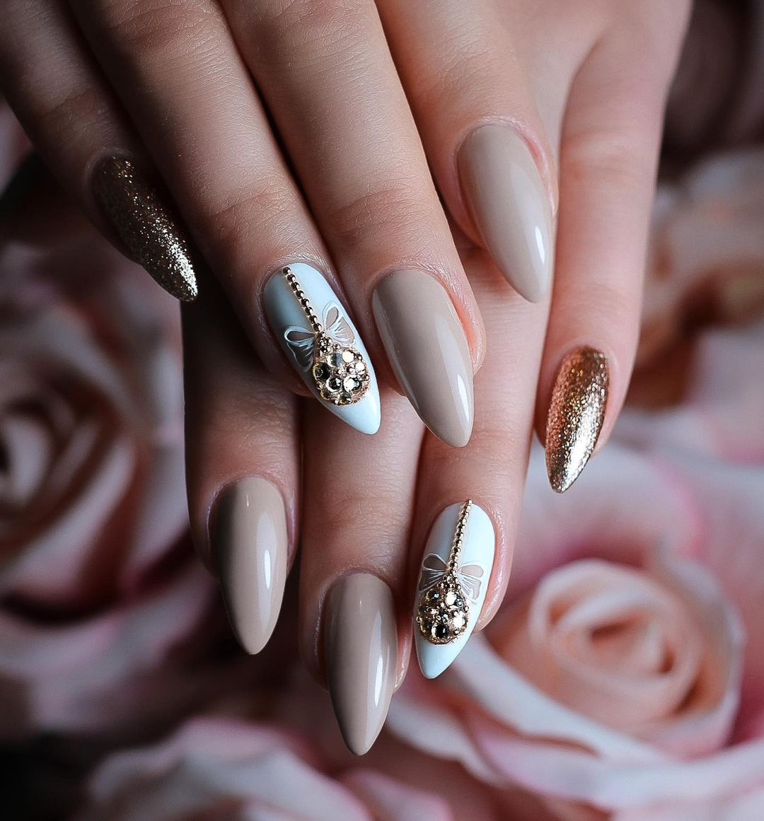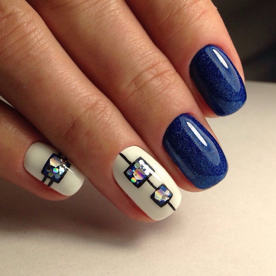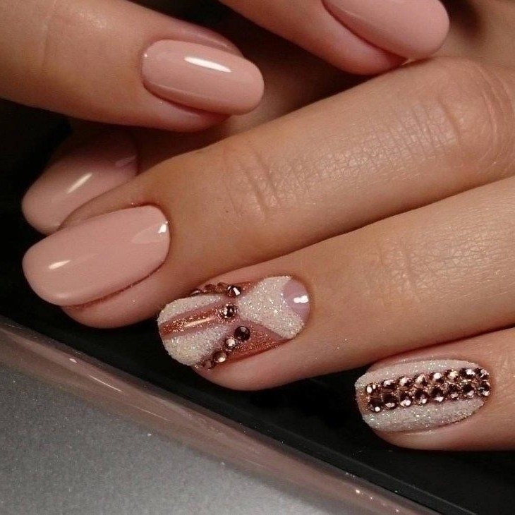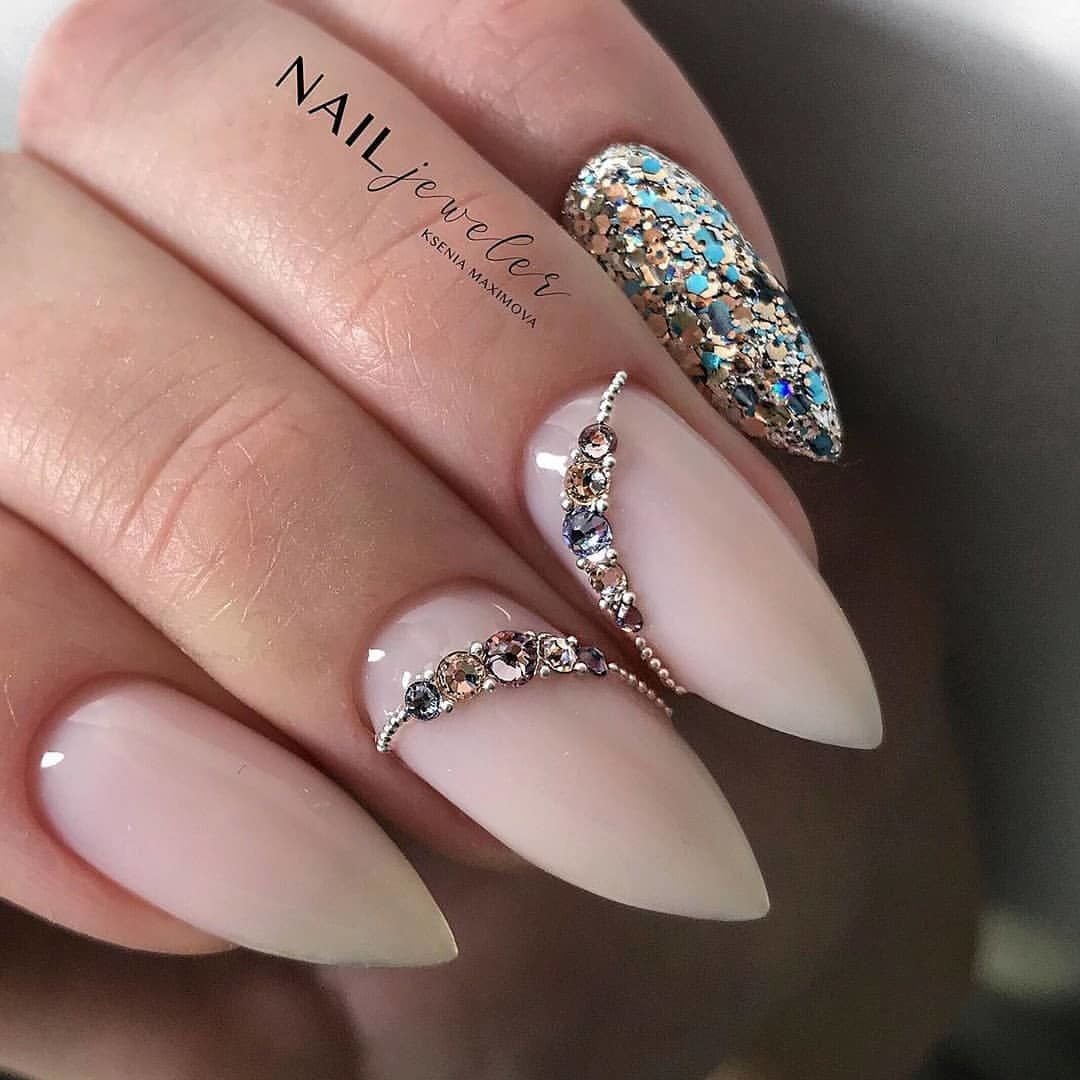 Блестки и стразы — неразлучная пара в маникюре. С их помощью можно создать минималистичный или активный праздничный дизайн ногтей. Чтобы не переборщить с блеском, рекомендуем оформлять стразами один ноготь на руке, а другой полностью покрывать блестками. Остальные ногти лучше оставить без дополнительного декора. такой маникюр будет выглядеть стильно и эффектно, а не пошло и чрезмерно.