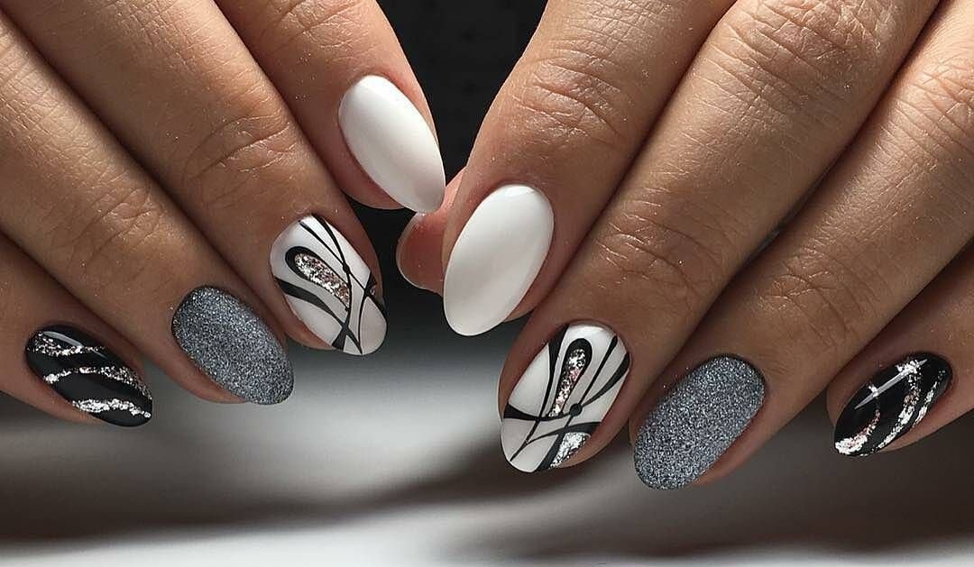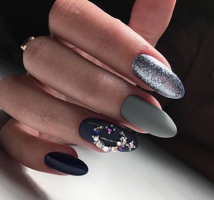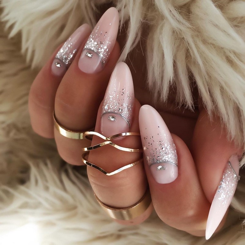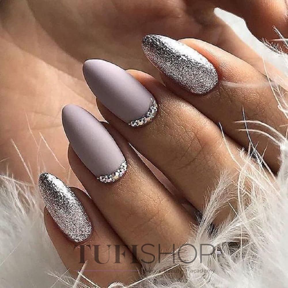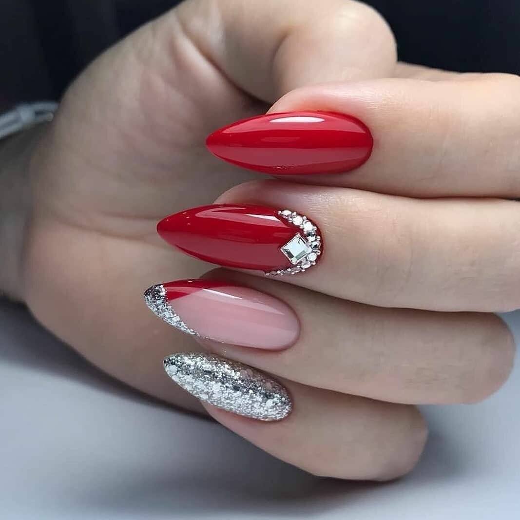 Блестки и стразы — неразлучная пара в маникюре. С их помощью можно создать минималистичный или активный праздничный дизайн ногтей. Чтобы не переборщить с блеском, рекомендуем оформлять стразами один ноготь на руке, а другой полностью покрывать блестками. Остальные ногти лучше оставить без дополнительного декора. такой маникюр будет выглядеть стильно и эффектно, а не пошло и чрезмерно.
