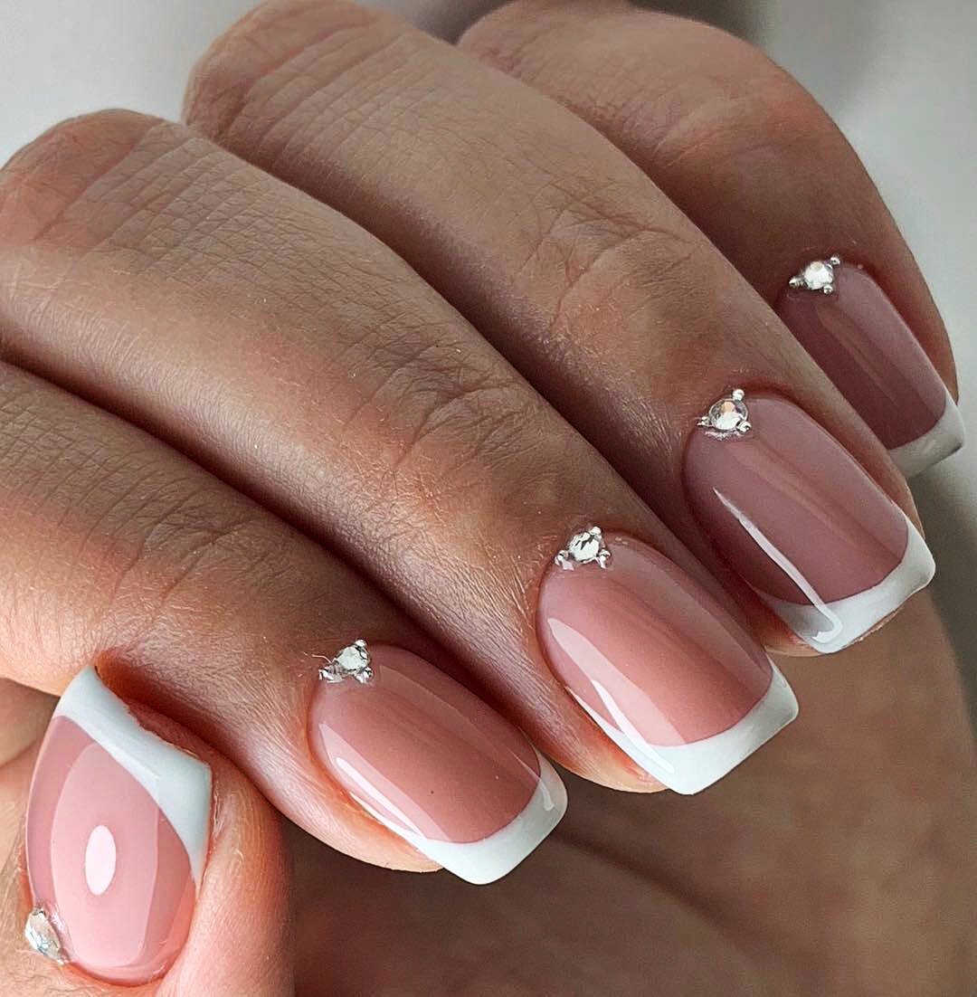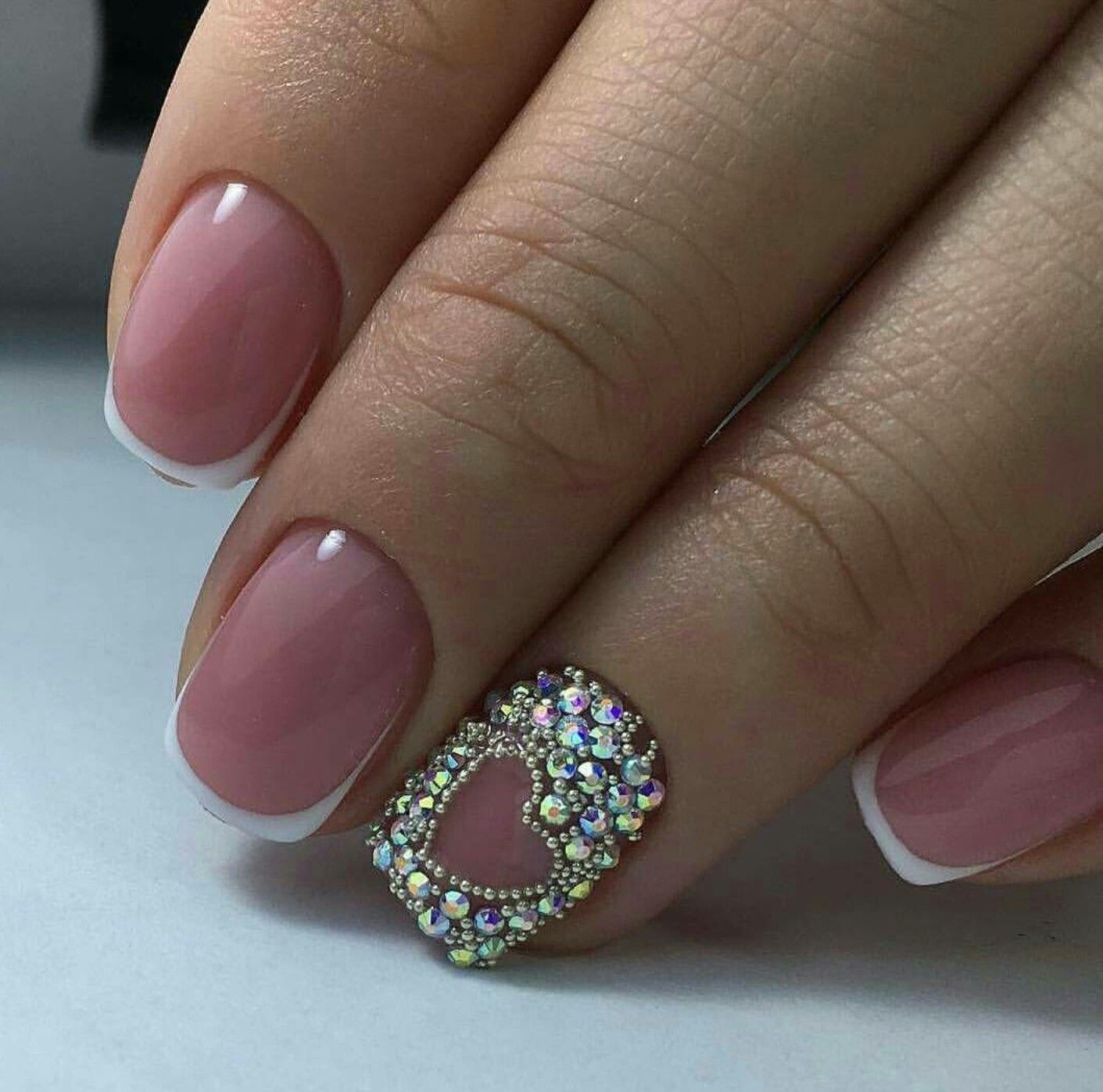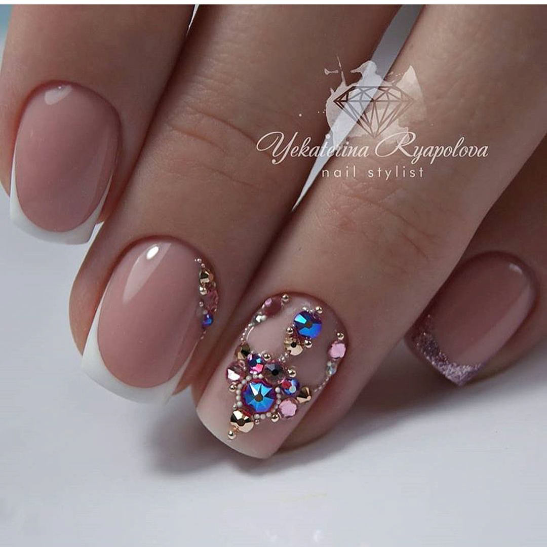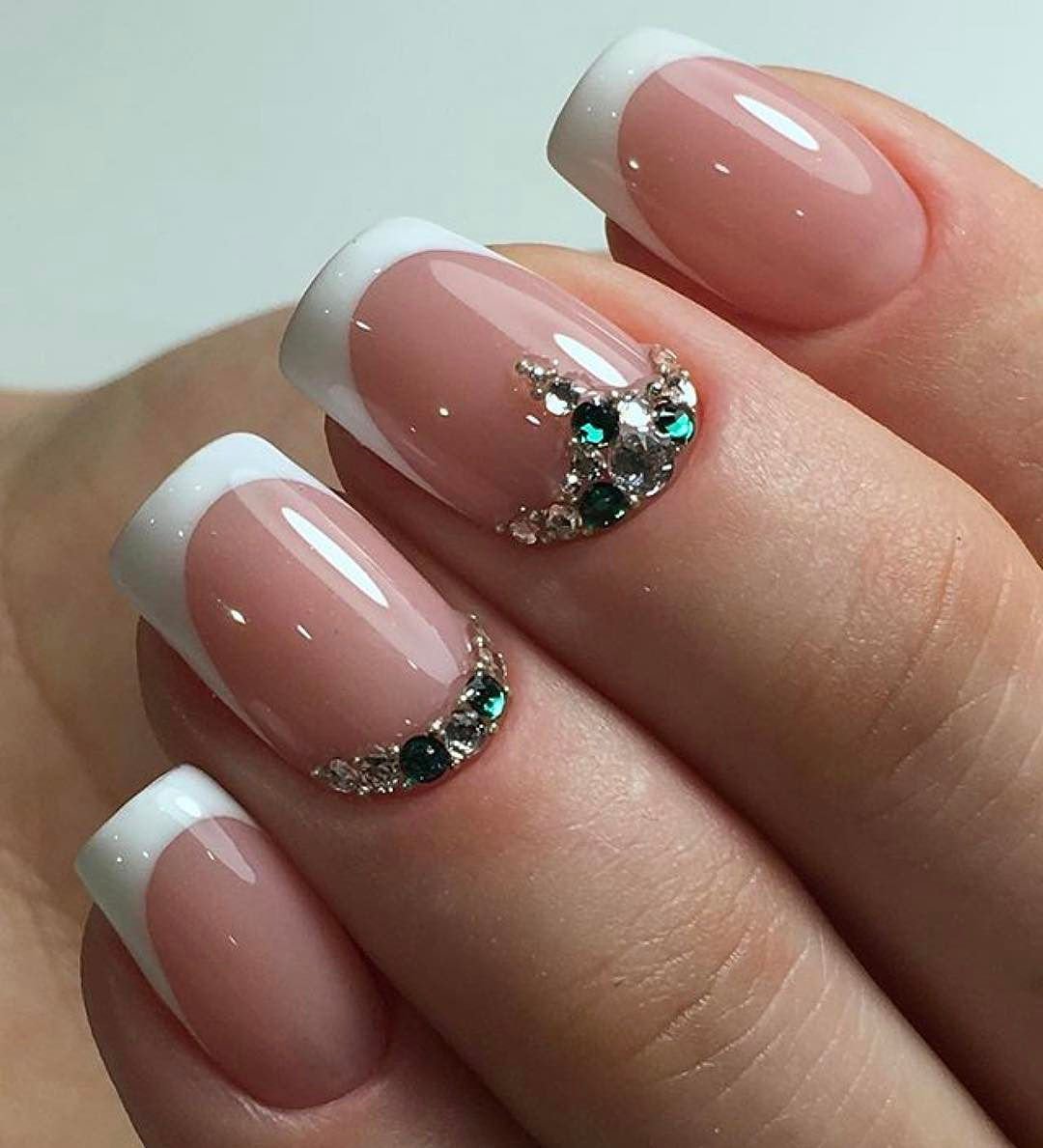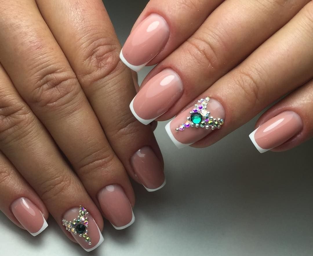 Наверное ни одна подборка не обходится без французского маникюра. Он не сдает своих лидерских позиций. И это неудивительно, френч сочетается со всеми техниками нейл-арта. Стразы — это яркая изюминка, с помощью которой модница может сделать маникюр индивидуальным и очень стильным. Стразами можно украсить улыбку или лунку, пустить их диагонально или просто сделать минималистичный акцент на ногте.