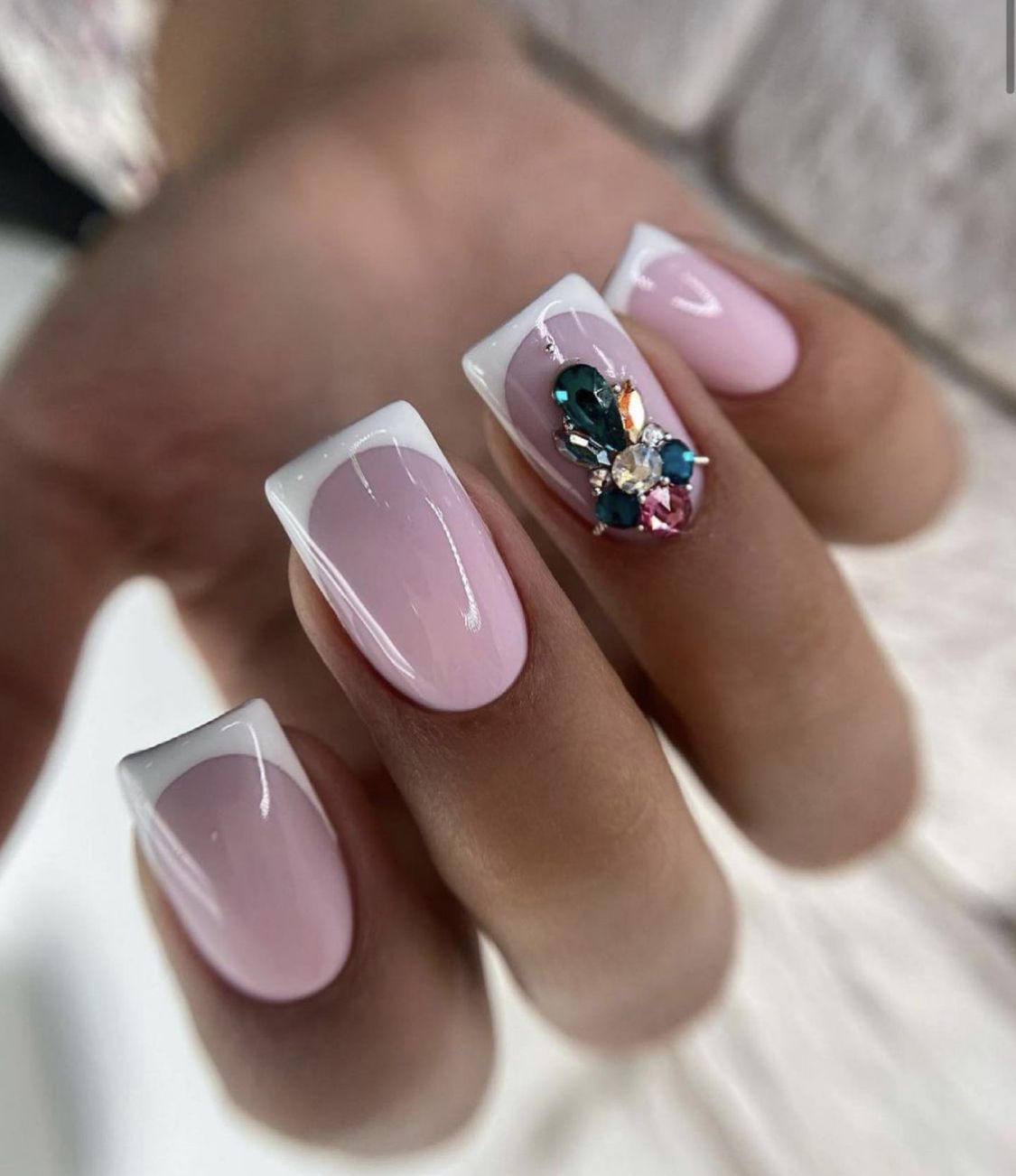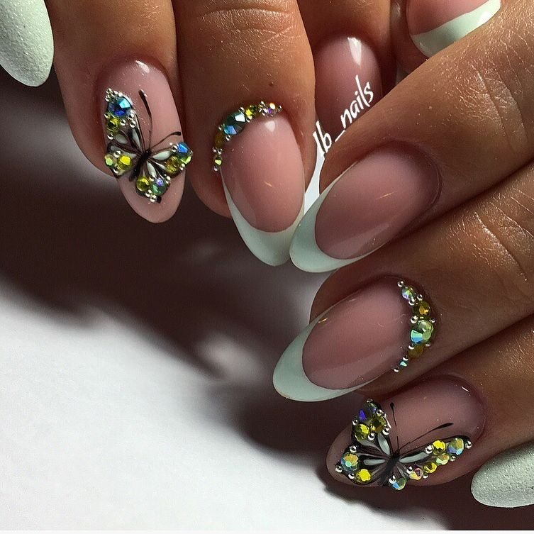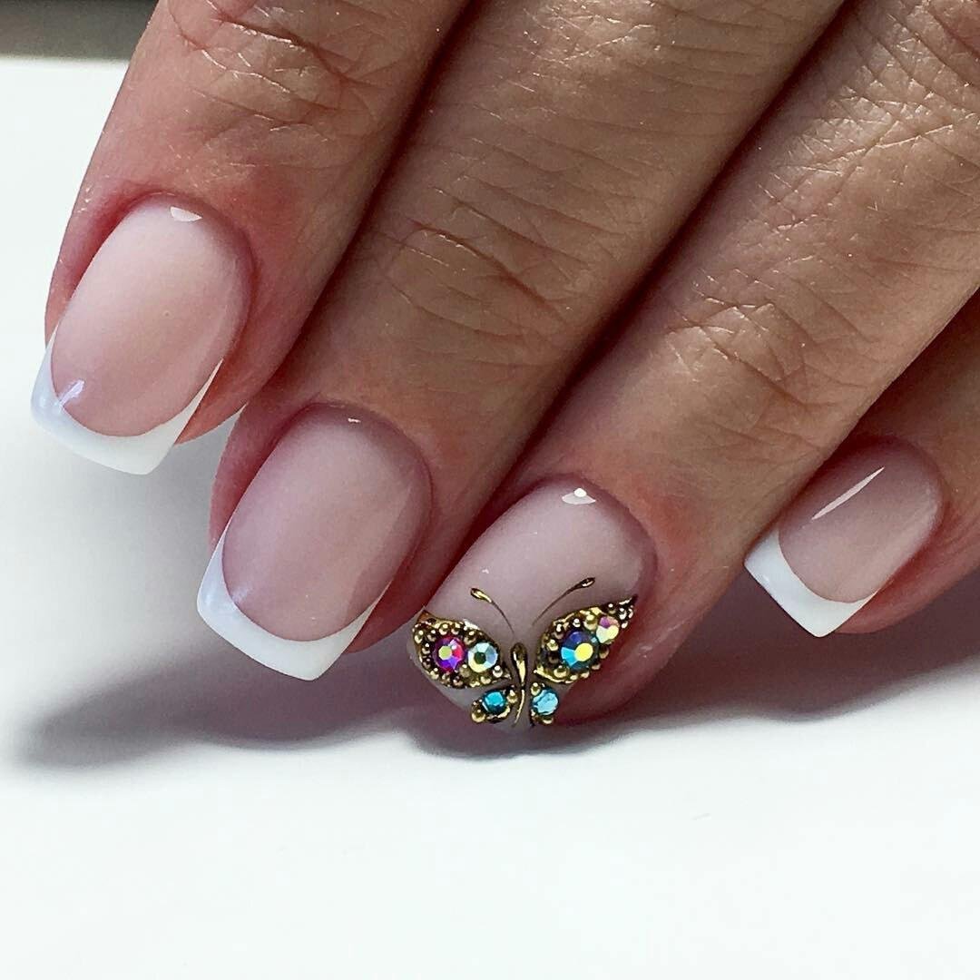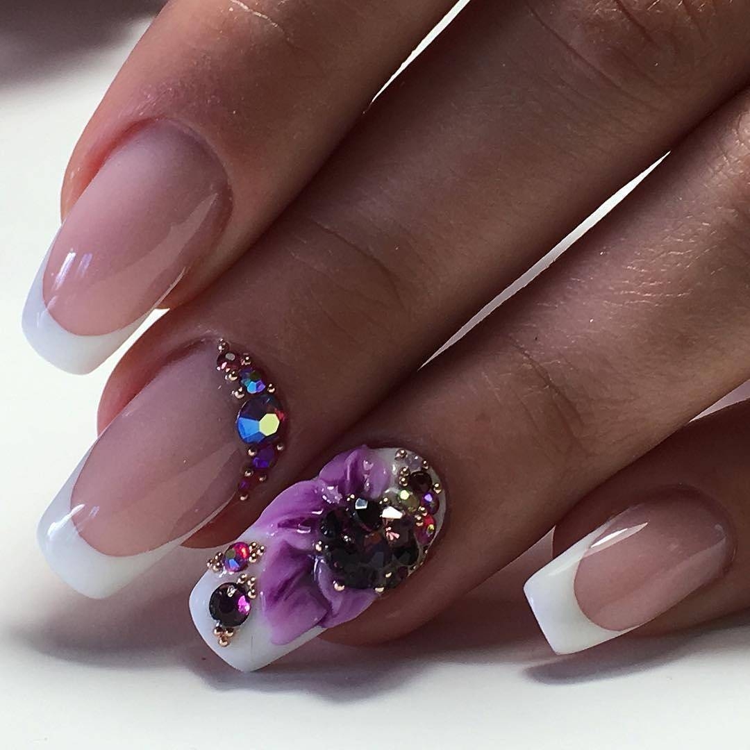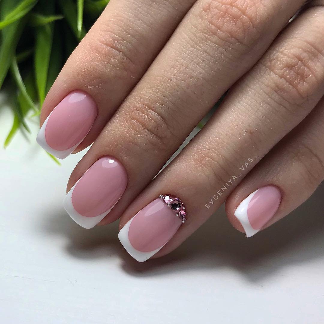 Наверное ни одна подборка не обходится без французского маникюра. Он не сдает своих лидерских позиций. И это неудивительно, френч сочетается со всеми техниками нейл-арта. Стразы — это яркая изюминка, с помощью которой модница может сделать маникюр индивидуальным и очень стильным. Стразами можно украсить улыбку или лунку, пустить их диагонально или просто сделать минималистичный акцент на ногте.