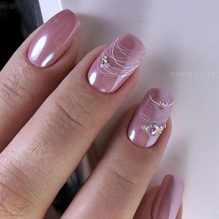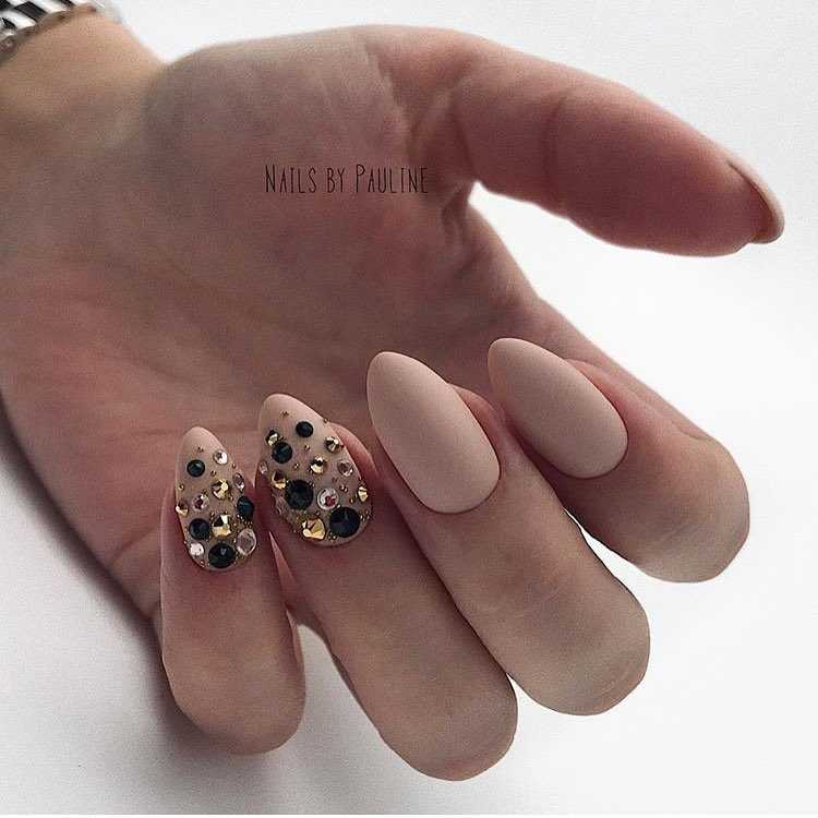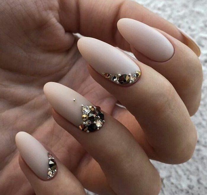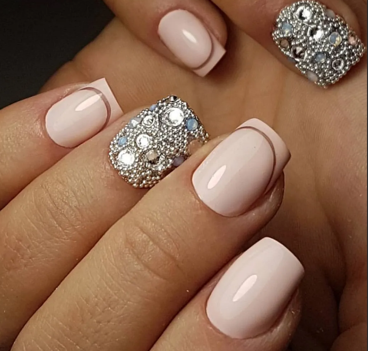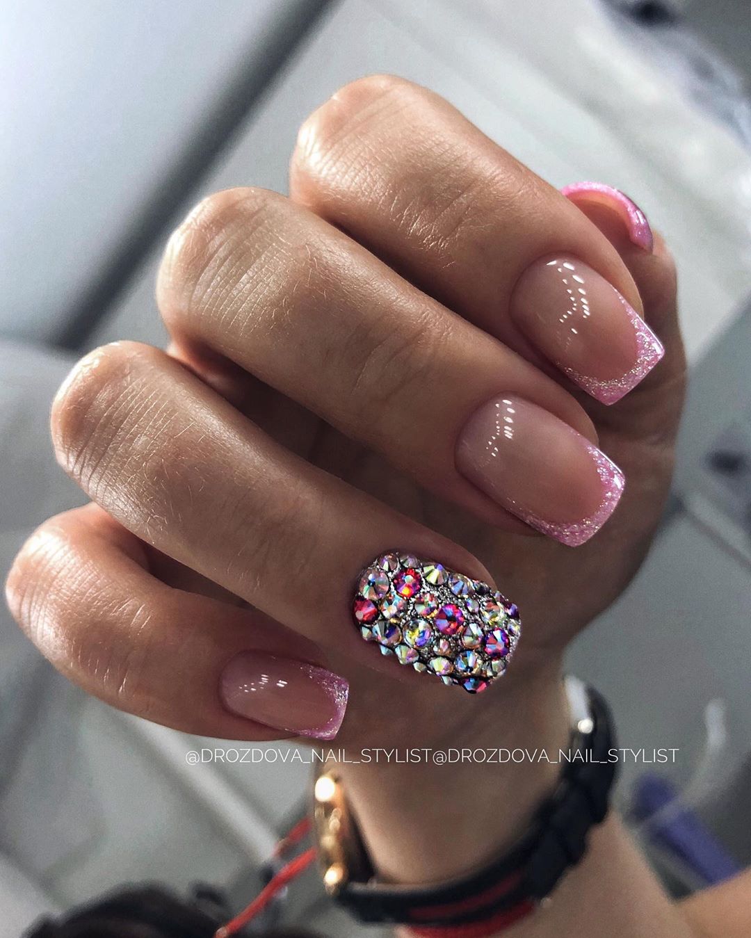 Здесь нужно быть особенно осторожным, чтобы не перегрузить не только дизайн, но и саму пластину. Велик риск нанести травму ногтю в том случае, если стразы зацепятся за ткань, колготки или волосы. Рекомендуем выбирать стразы небольшого размера и делать маникюр в стиле минимализм. Или выделить активным декором всего один пальчик, тщательно закрепите его, чтобы не остаться с некрасивыми «обломками» декора уже через пару дней.