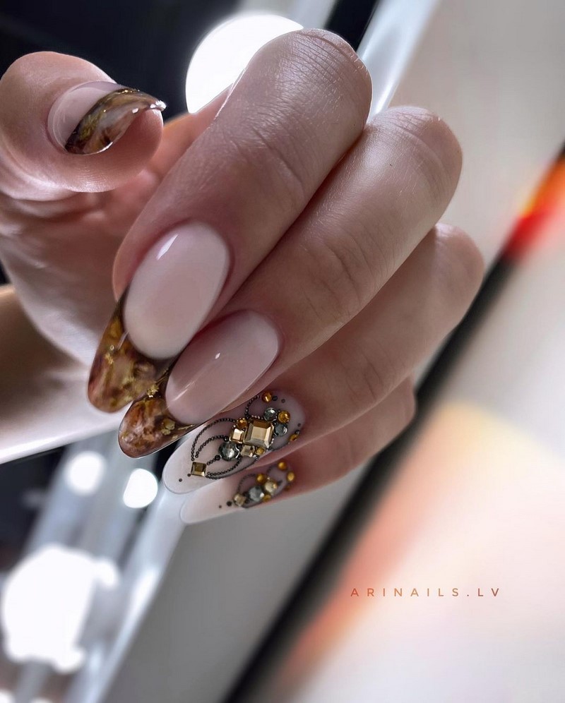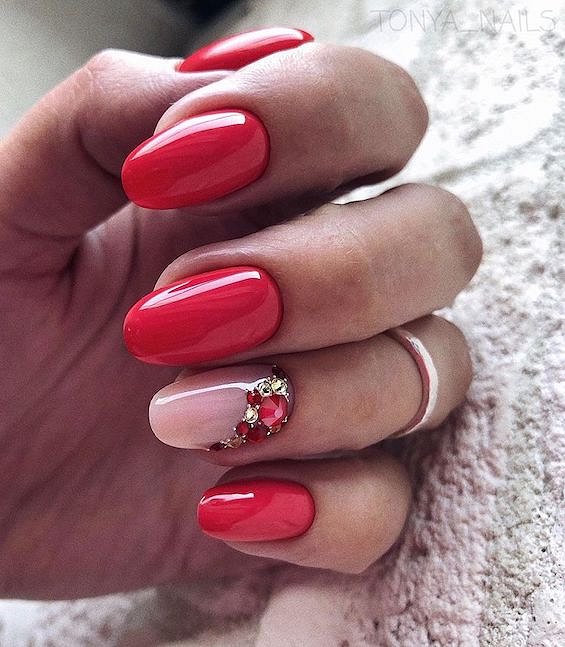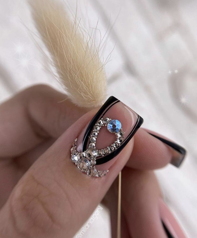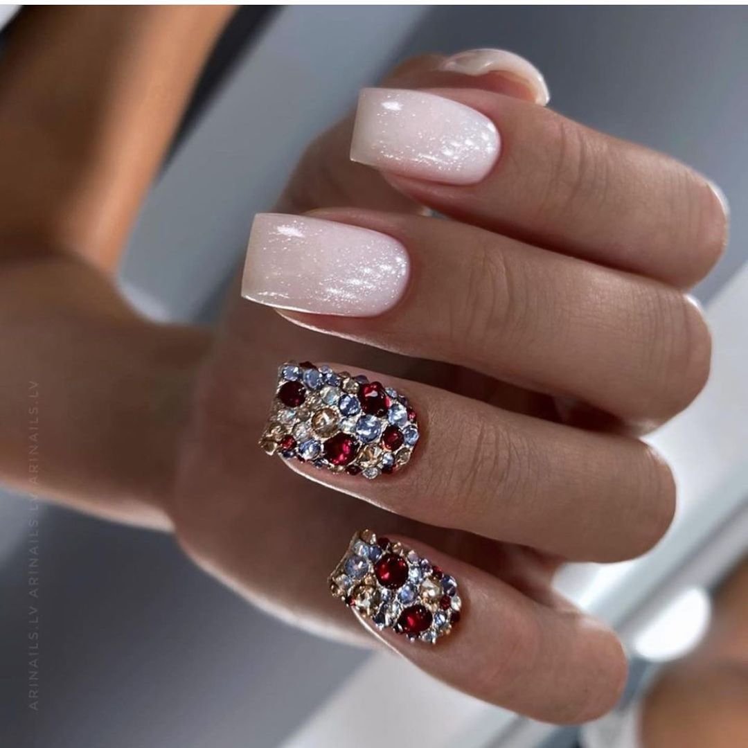 Здесь нужно быть особенно осторожным, чтобы не перегрузить не только дизайн, но и саму пластину. Велик риск нанести травму ногтю в том случае, если стразы зацепятся за ткань, колготки или волосы. Рекомендуем выбирать стразы небольшого размера и делать маникюр в стиле минимализм. Или выделить активным декором всего один пальчик, тщательно закрепите его, чтобы не остаться с некрасивыми «обломками» декора уже через пару дней.