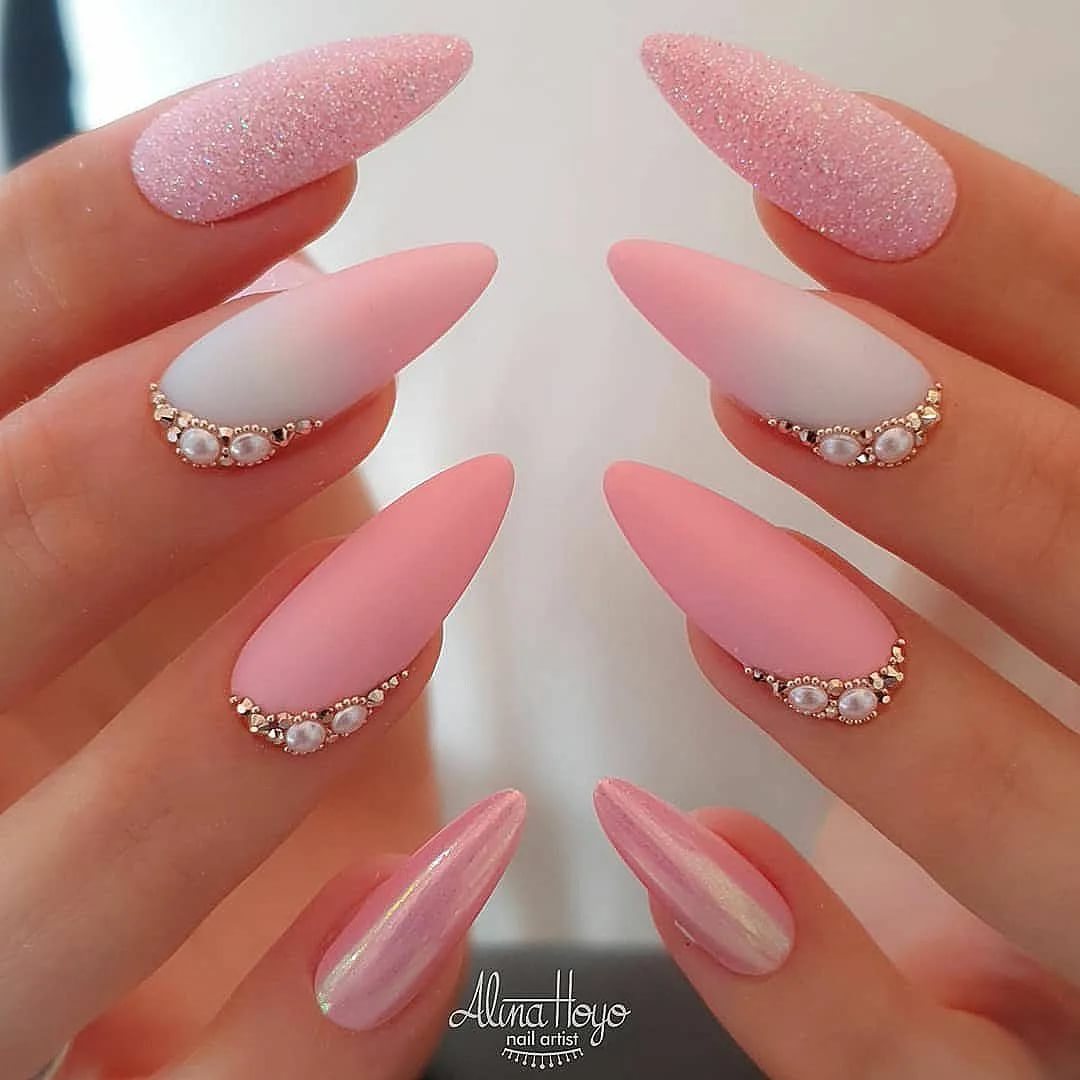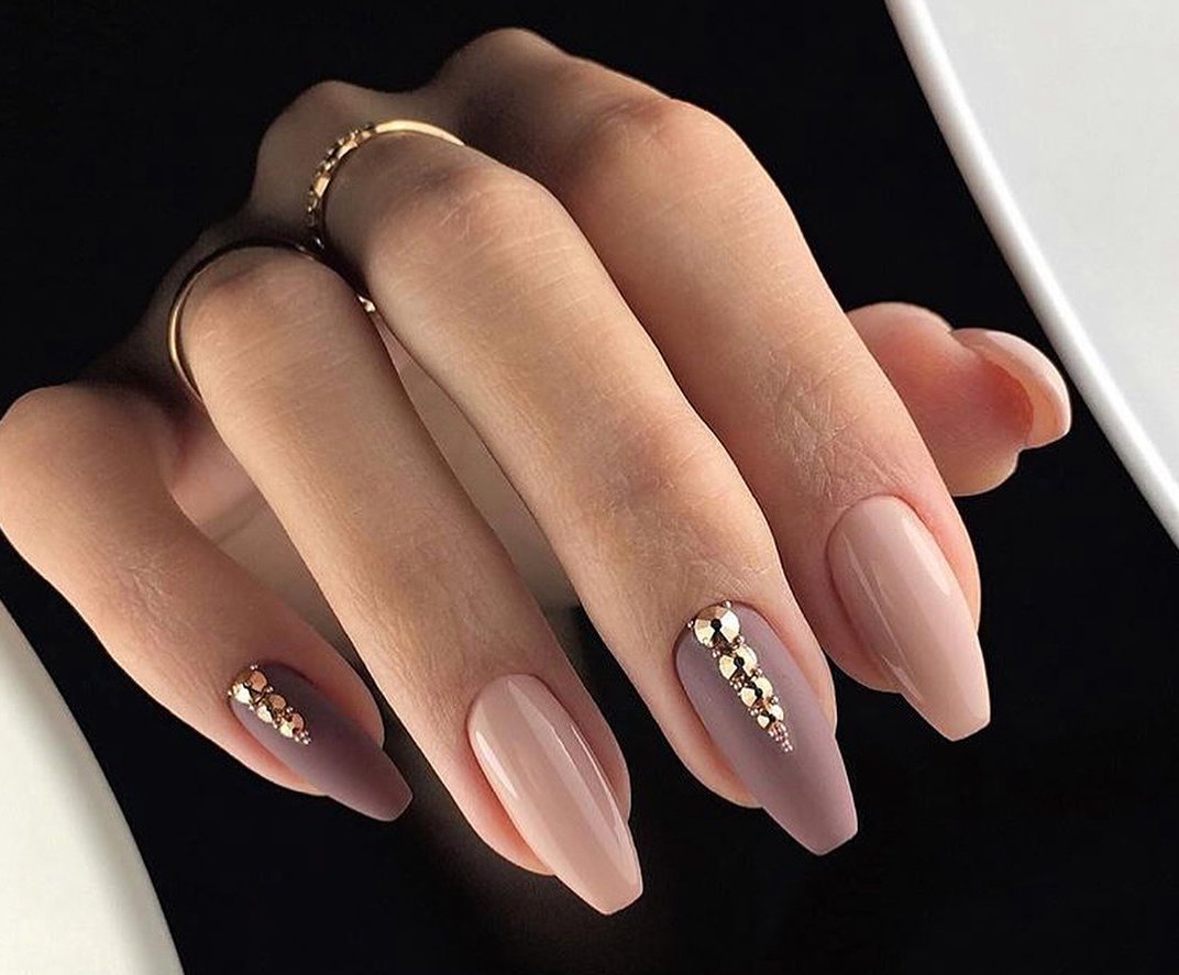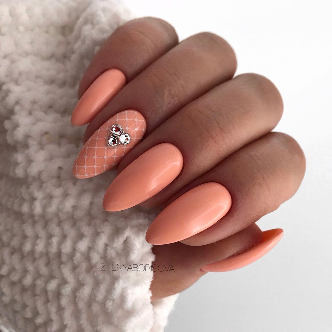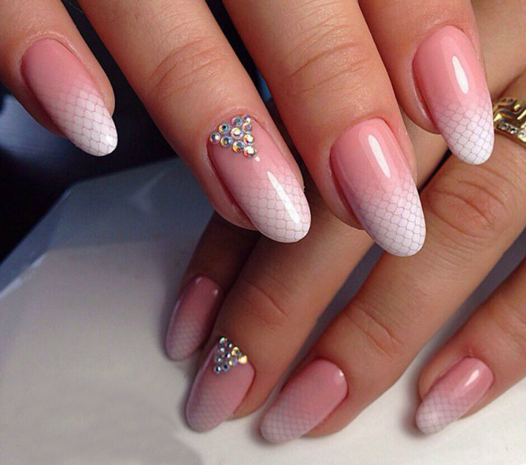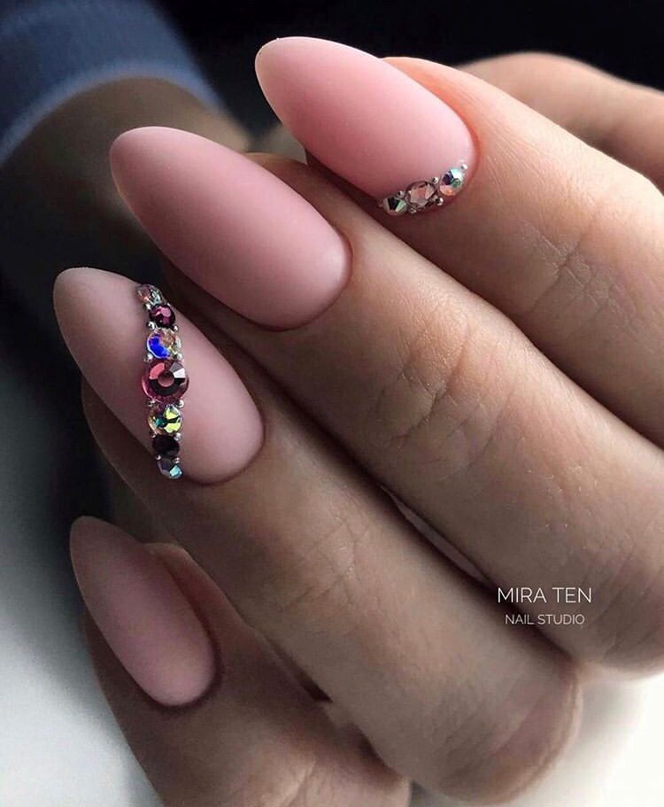 Романтика и нежность — все это форма миндаль, балерина или даже мягкий квадрат. Для такой формы лучше выбрать круглые или ромбообразные стразы. Они подчеркнут изящность ноготка и сделают руки визуально более хрупкими.