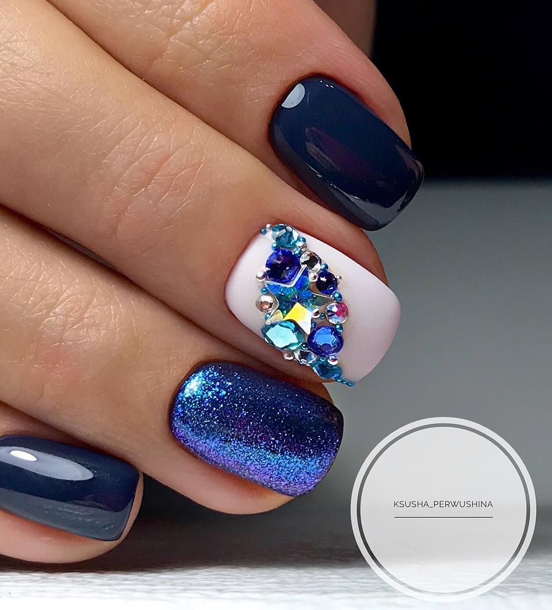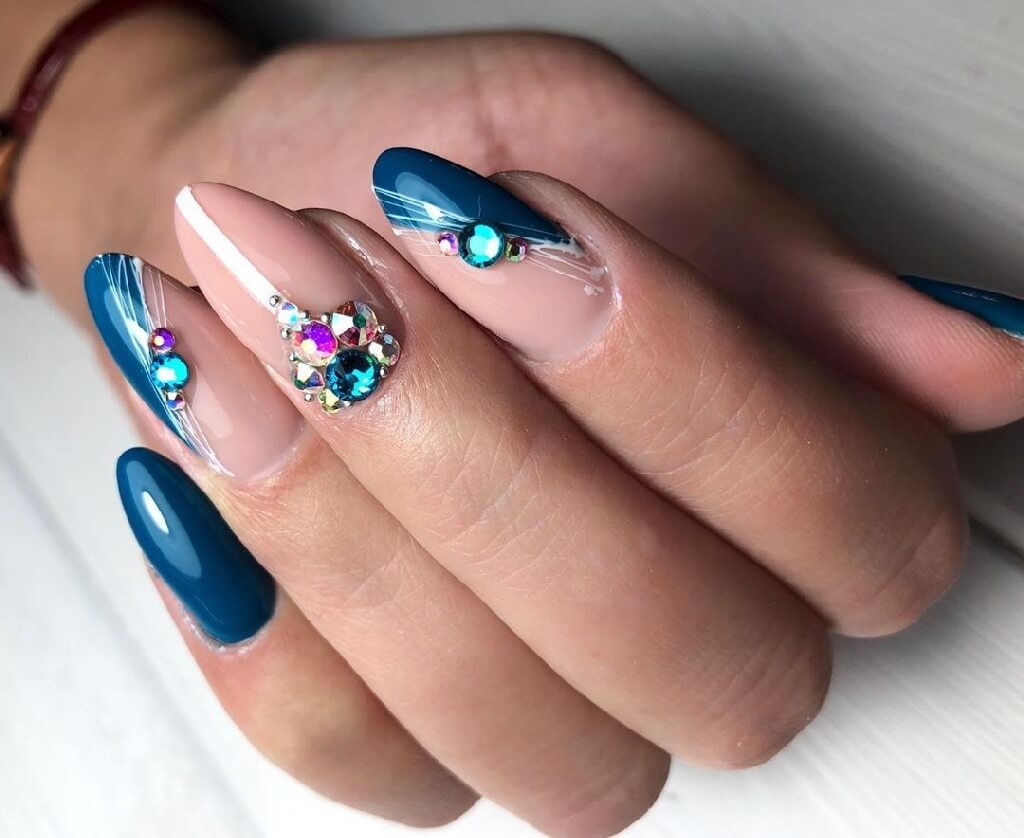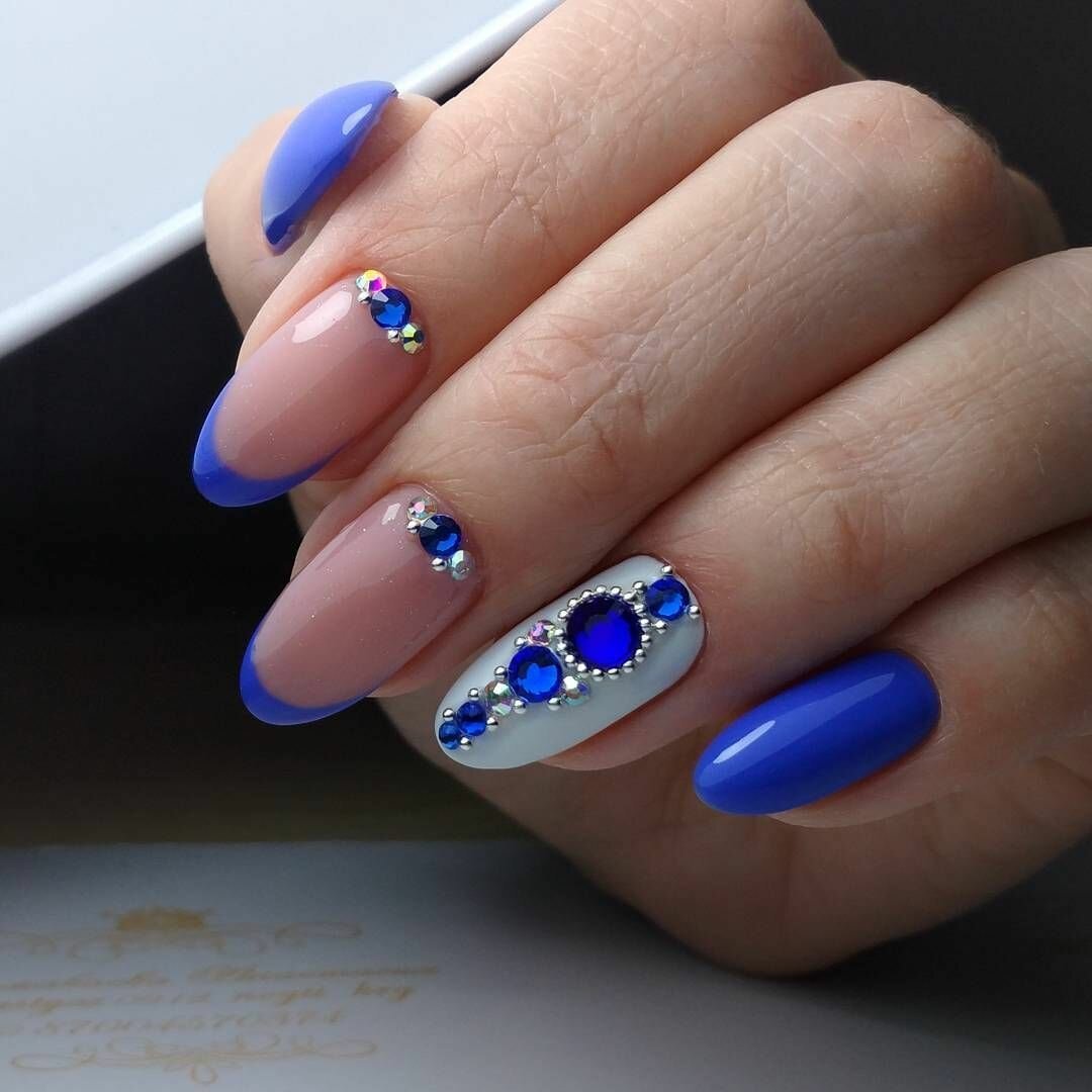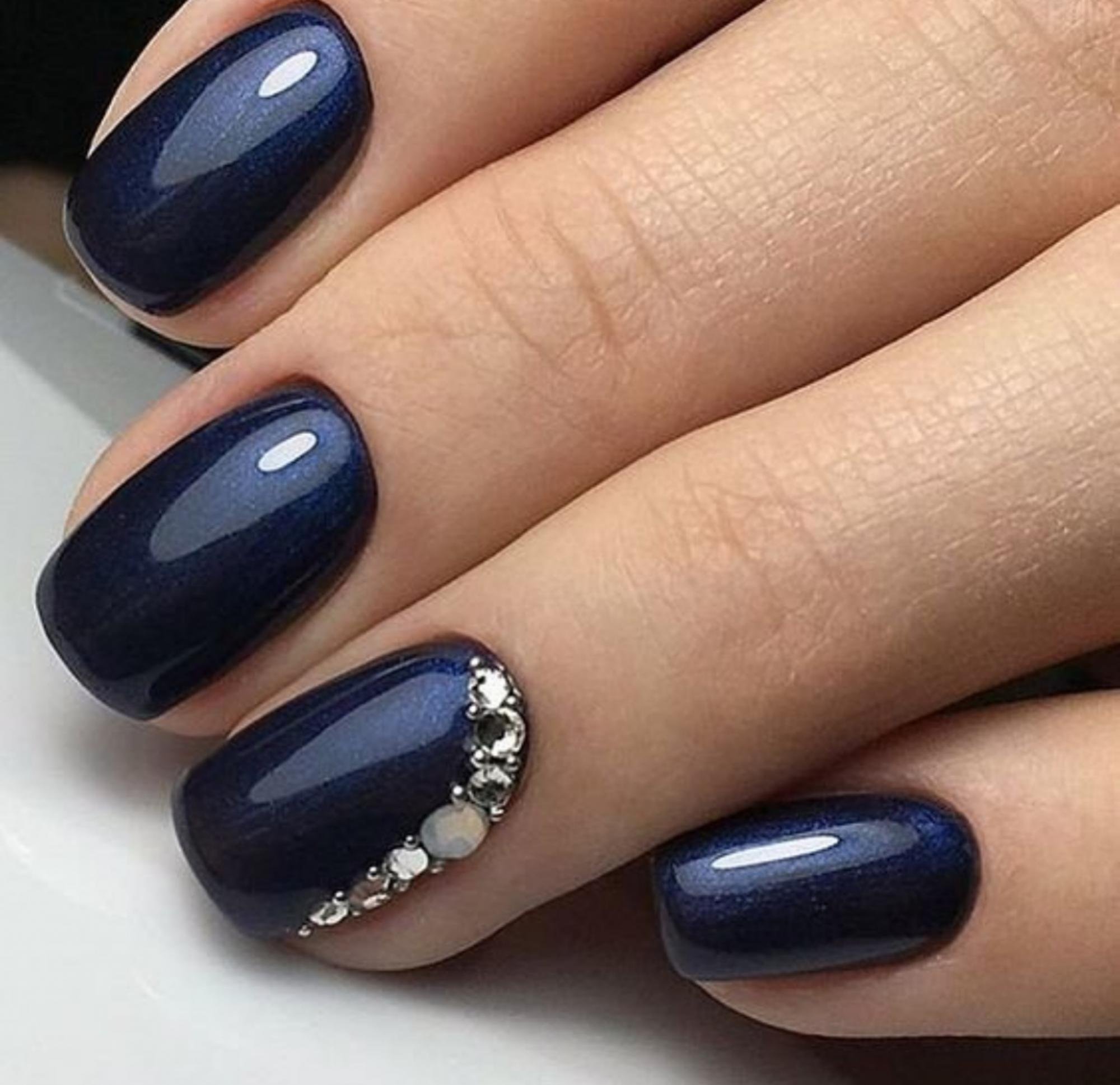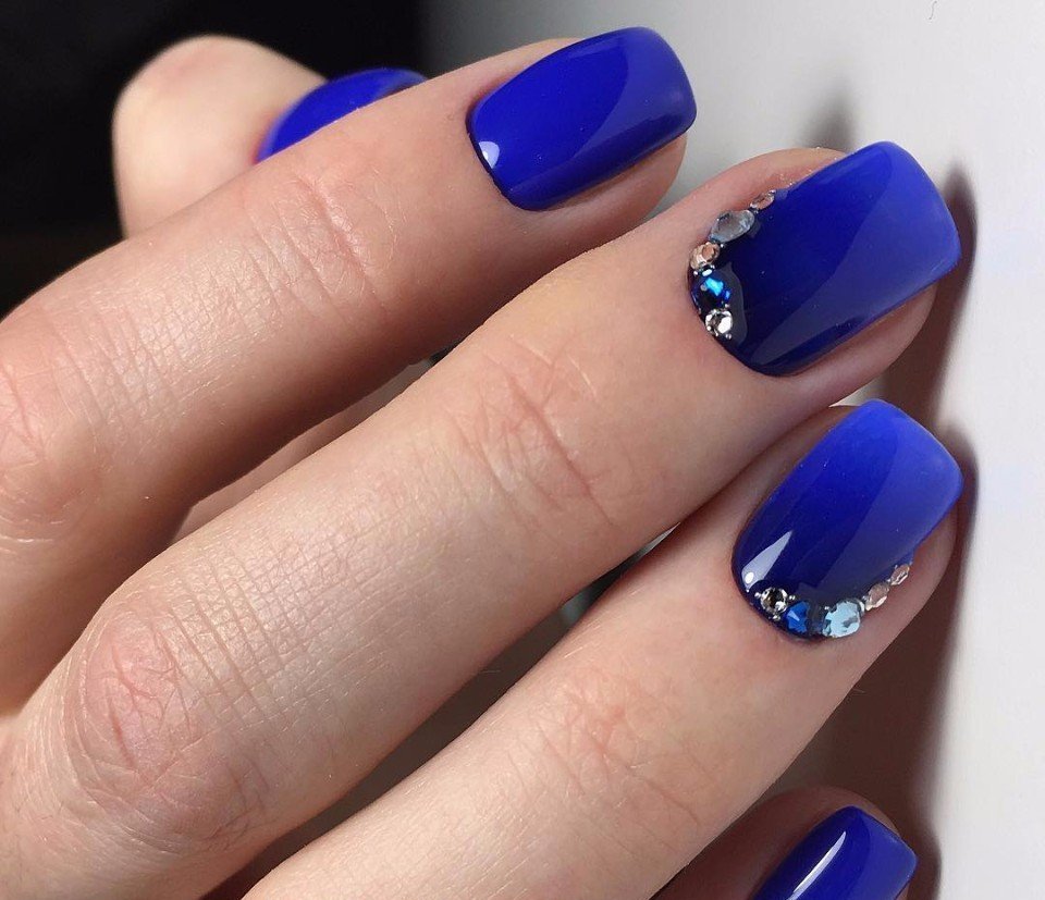 Синяя палитра — лучшее решение для сочетания с серебристым блеском страз. Выбирайте холодные оттенки, чтобы создать стильный маникюр. Если отдаете предпочтение теплым оттенкам, выбирайте золотистые стразы или цветные.