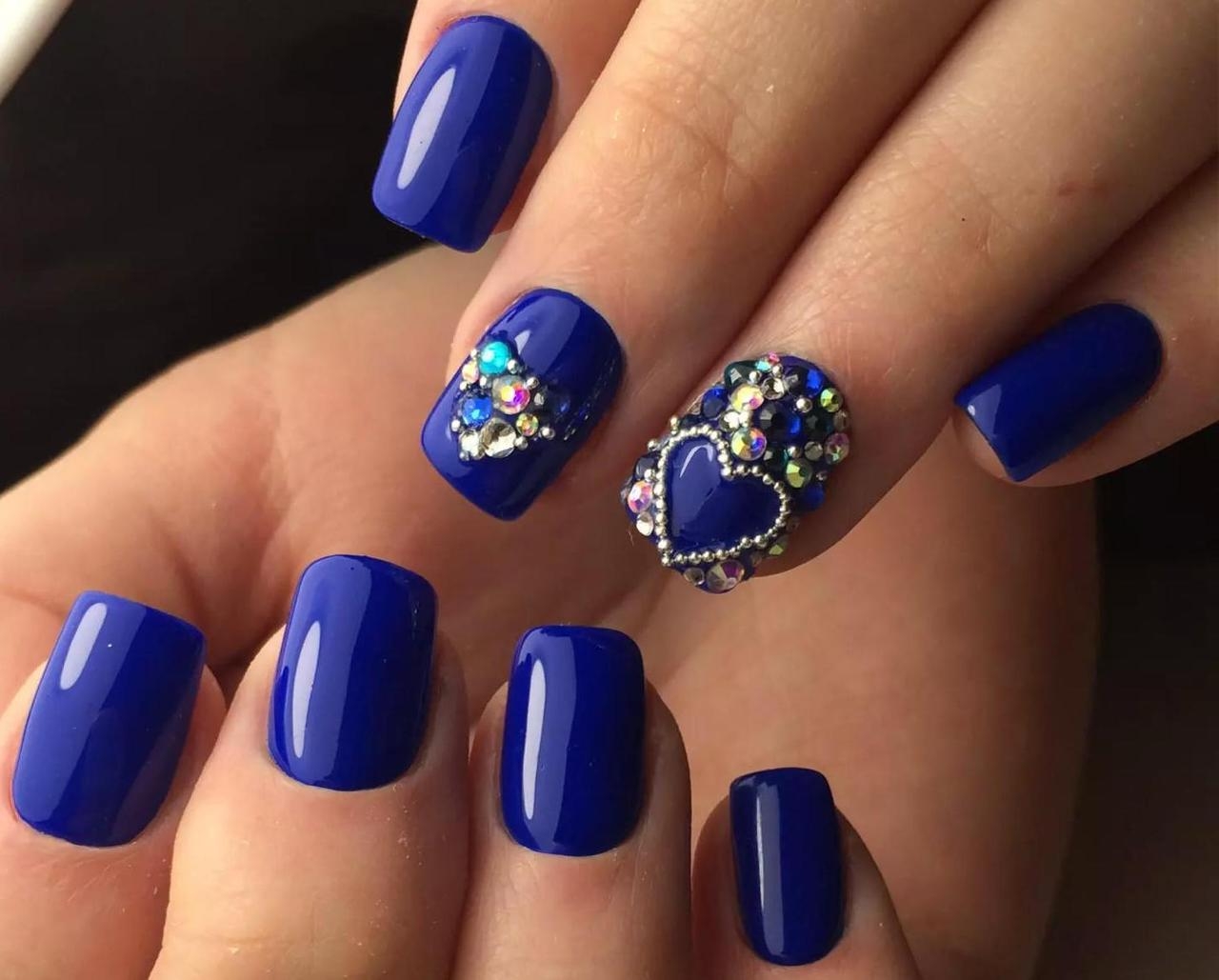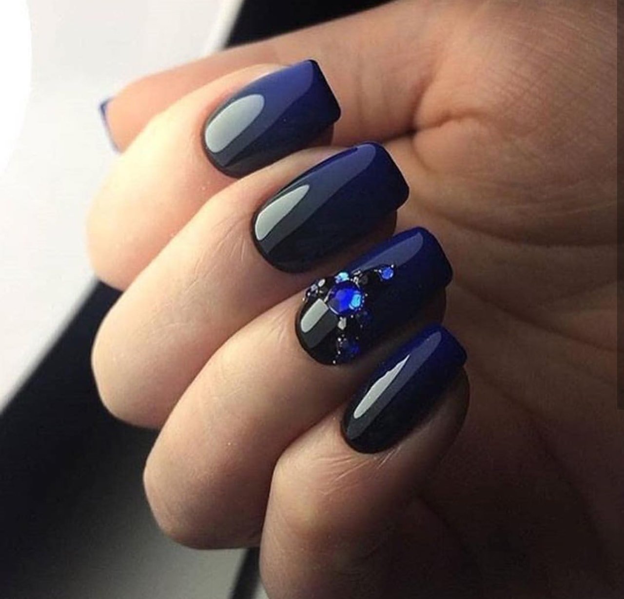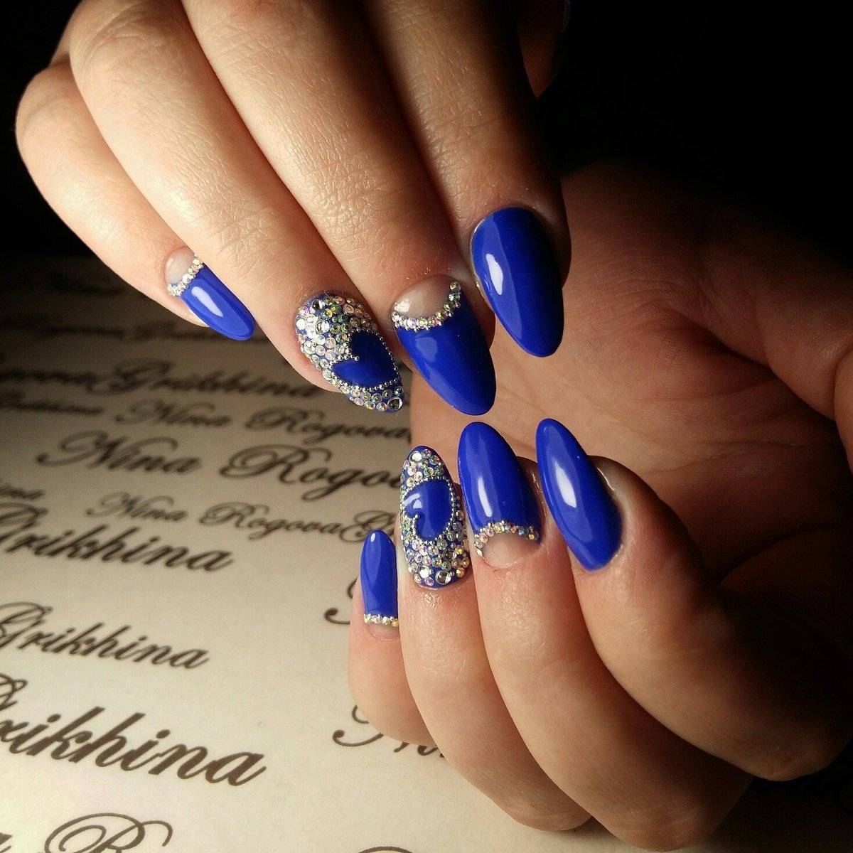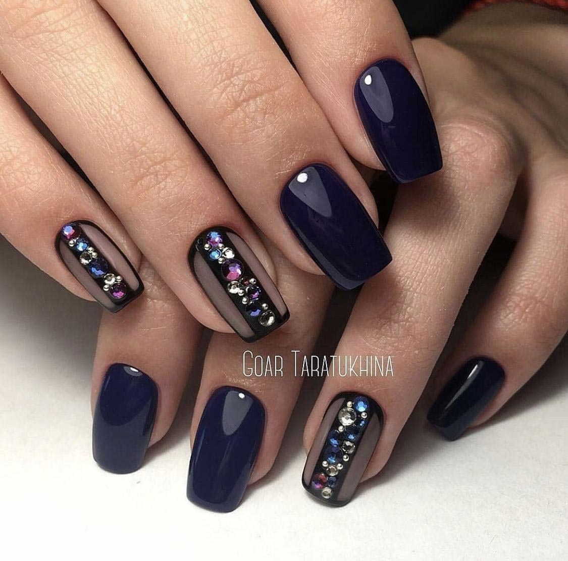 Синяя палитра — лучшее решение для сочетания с серебристым блеском страз. Выбирайте холодные оттенки, чтобы создать стильный маникюр. Если отдаете предпочтение теплым оттенкам, выбирайте золотистые стразы или цветные.