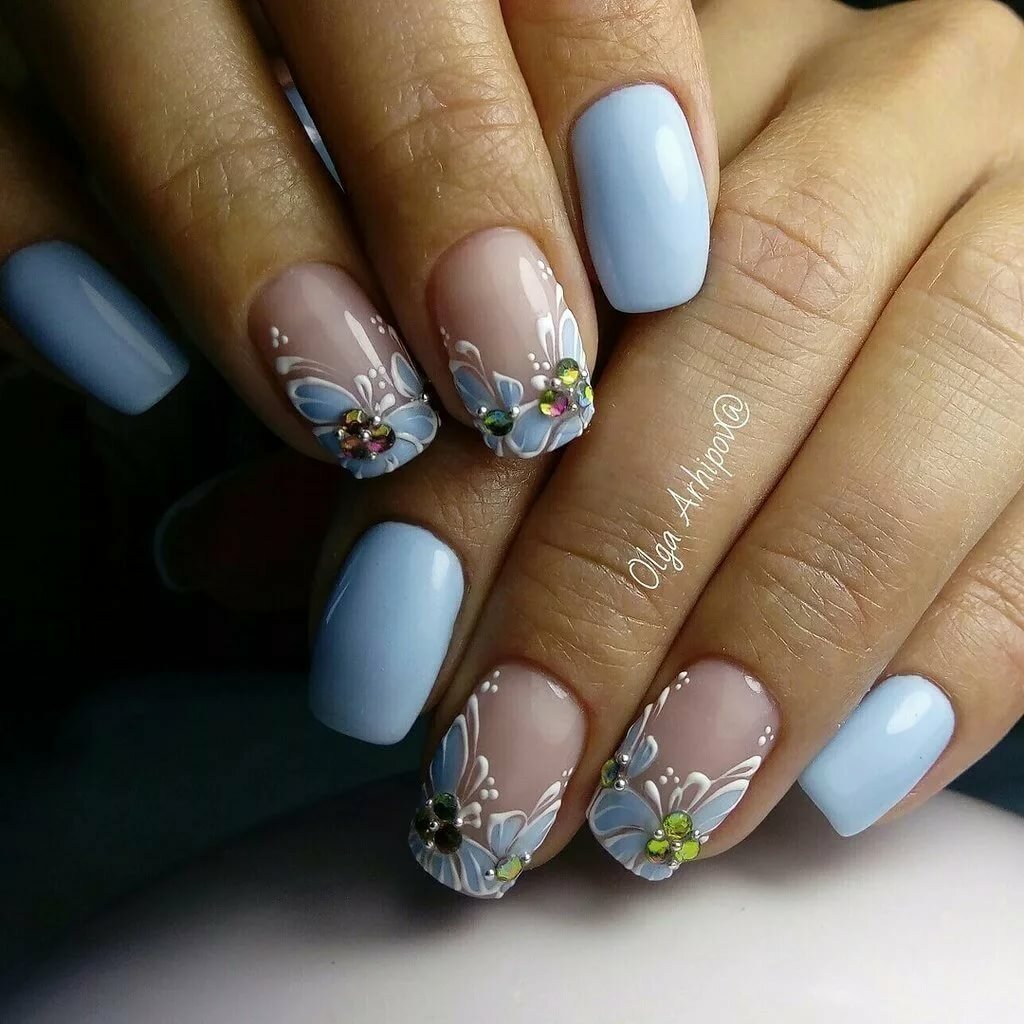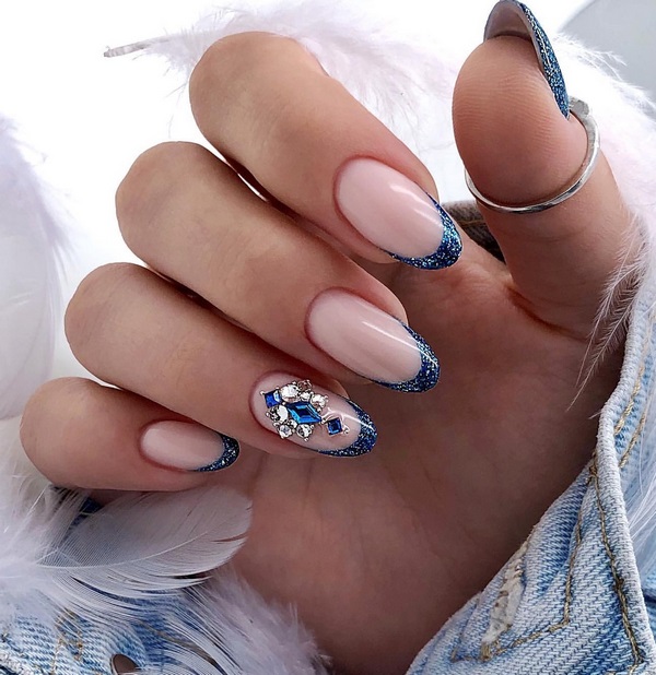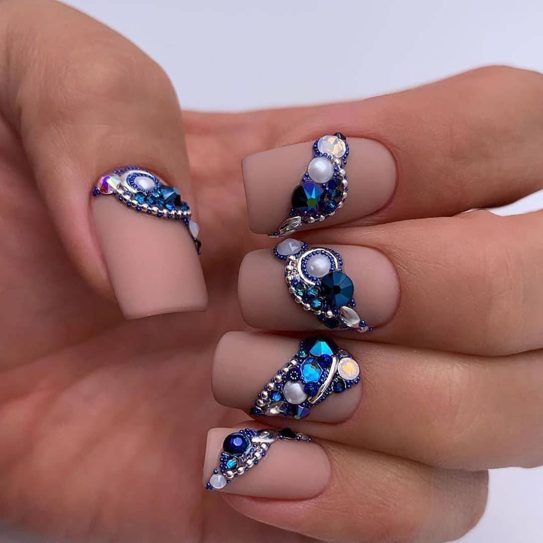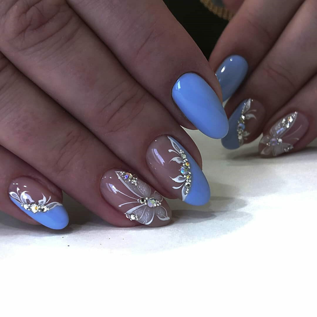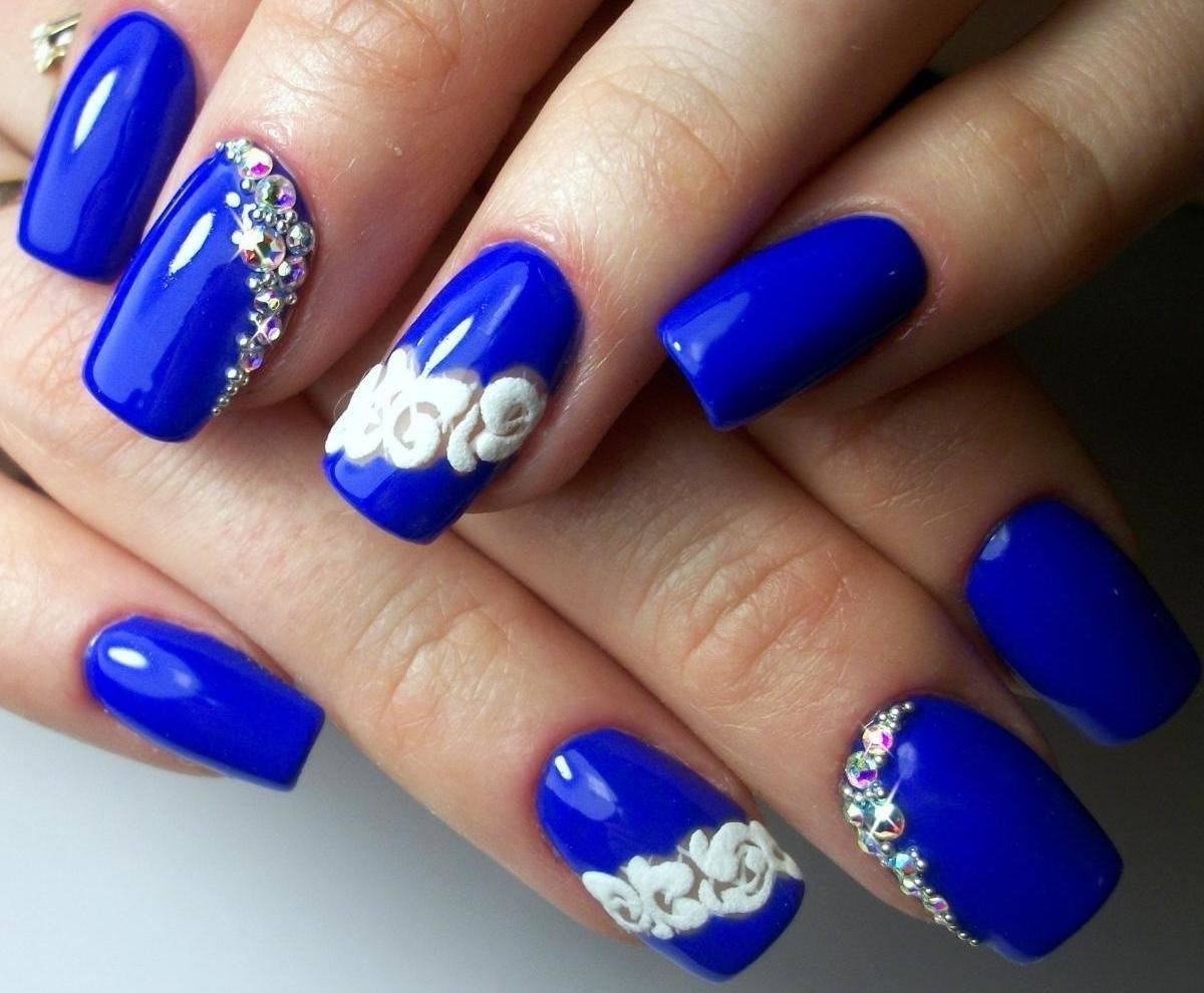 Синяя палитра — лучшее решение для сочетания с серебристым блеском страз. Выбирайте холодные оттенки, чтобы создать стильный маникюр. Если отдаете предпочтение теплым оттенкам, выбирайте золотистые стразы или цветные.