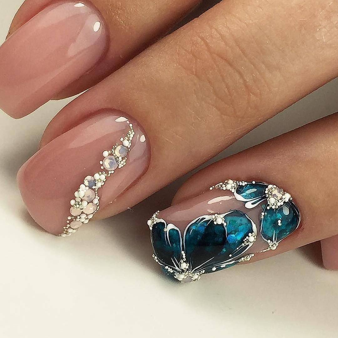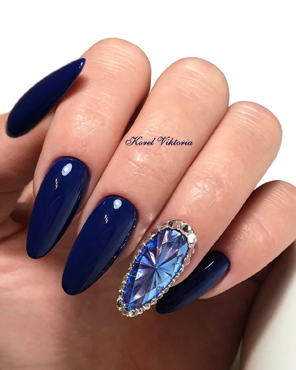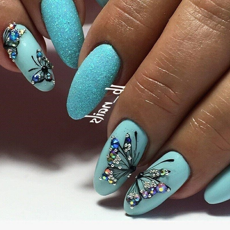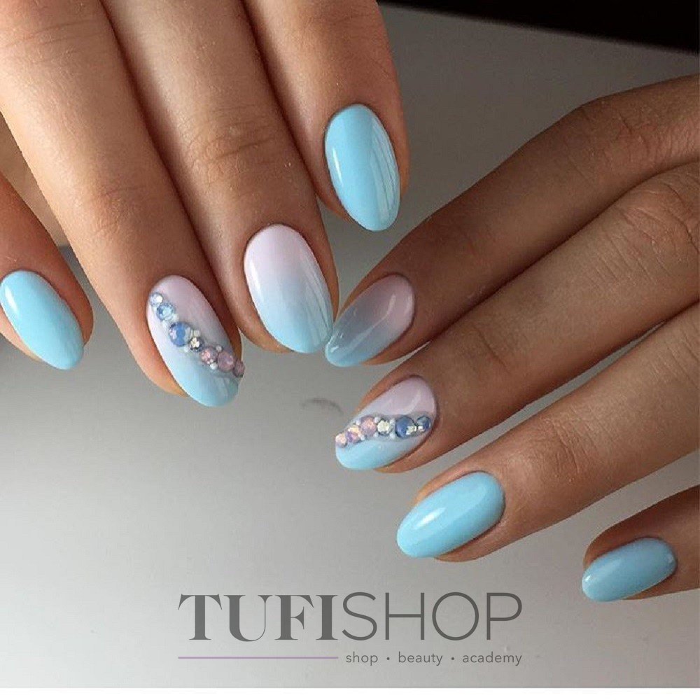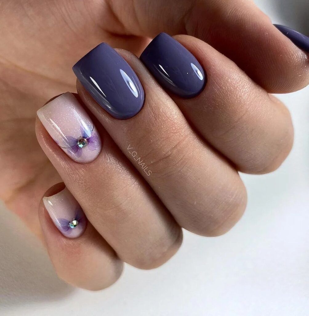Синяя палитра — лучшее решение для сочетания с серебристым блеском страз. Выбирайте холодные оттенки, чтобы создать стильный маникюр. Если отдаете предпочтение теплым оттенкам, выбирайте золотистые стразы или цветные.