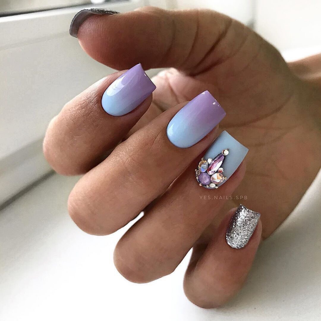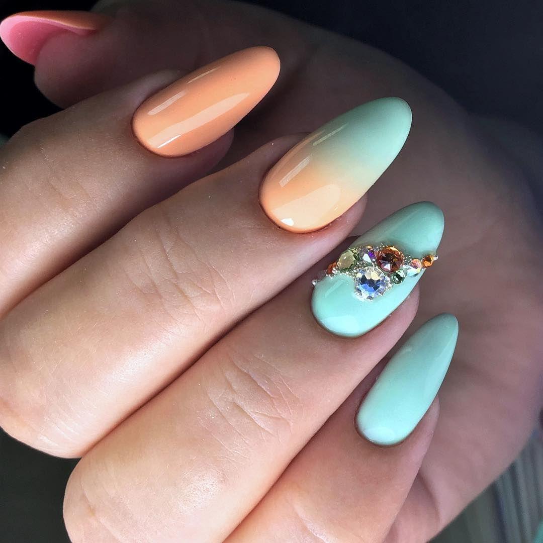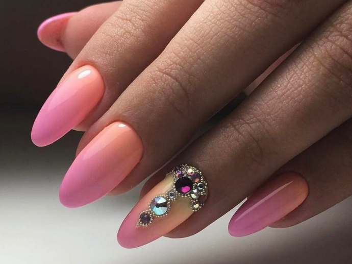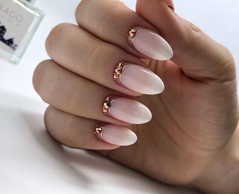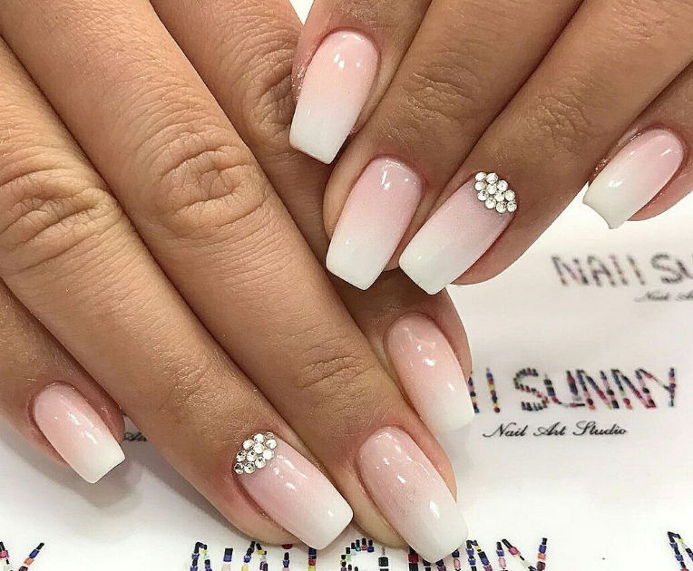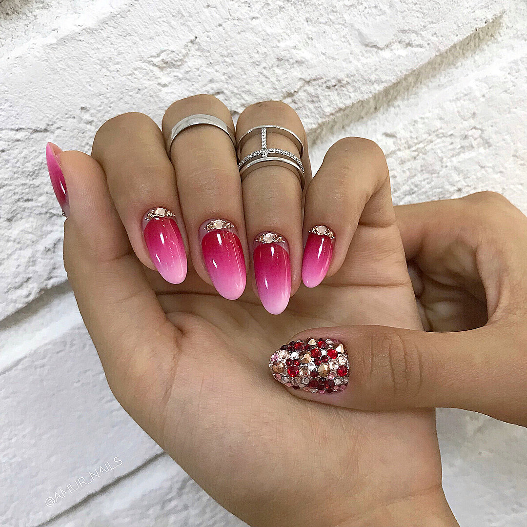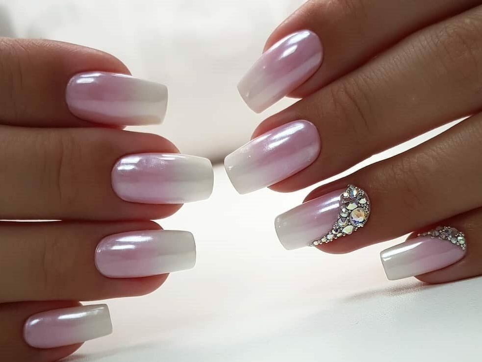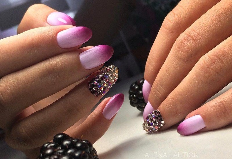 В чем разница этих двух технологий? В плавности перехода одного оттенка лака в другой. В случае с градиентом мастер может использовать довольно резкие переходы, фактически на ваших ноготках будет радуга. А в случае с омбре переходы настолько плавные, что практически незаметны. Если хочется сделать маникюр более активным — смело добавляйте стразы на один или два ноготка.