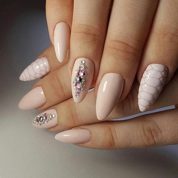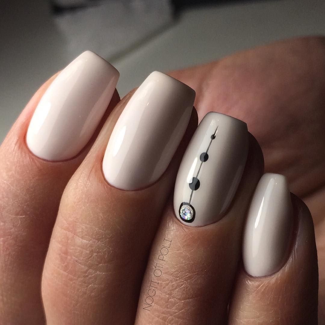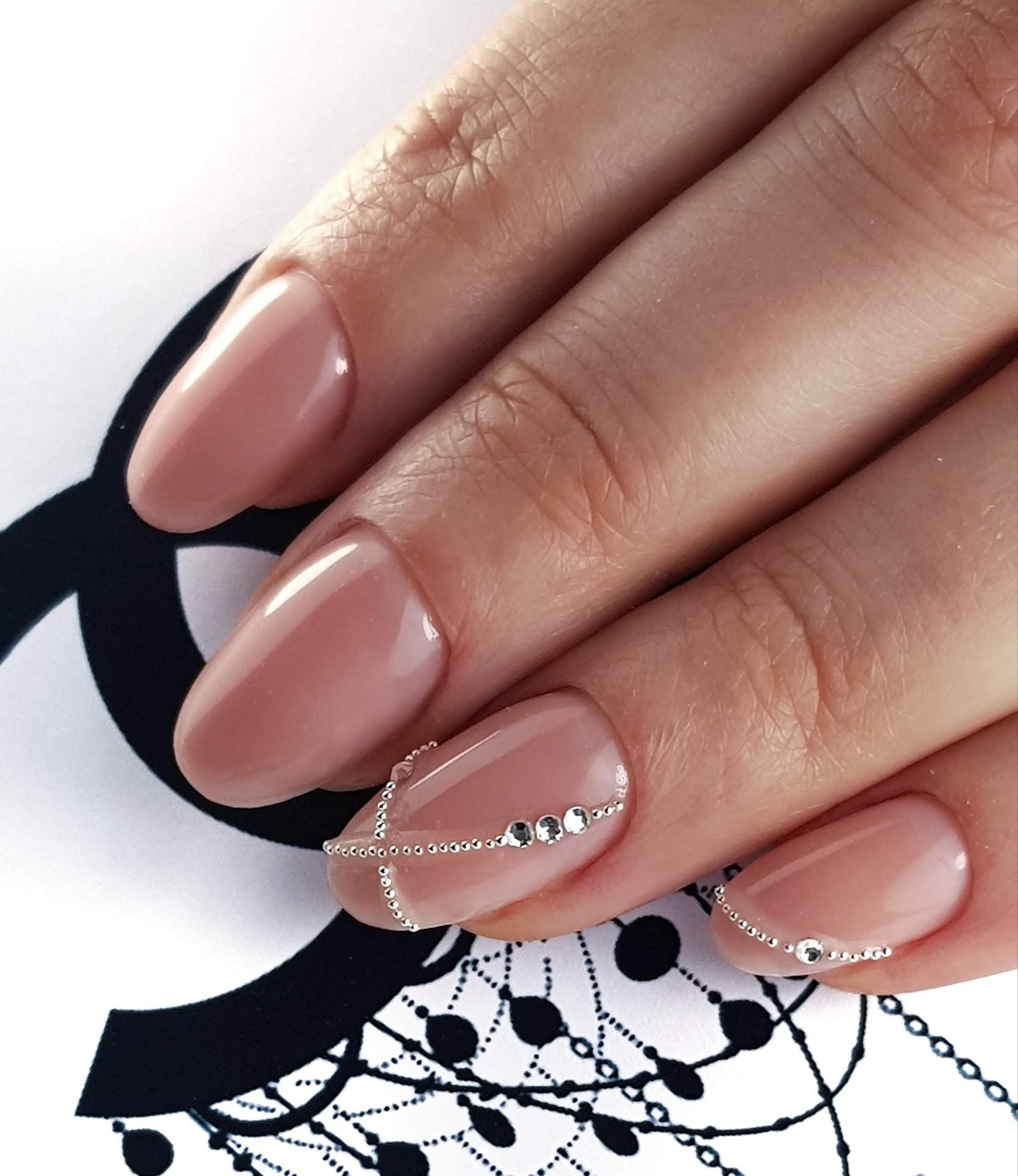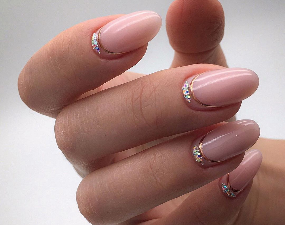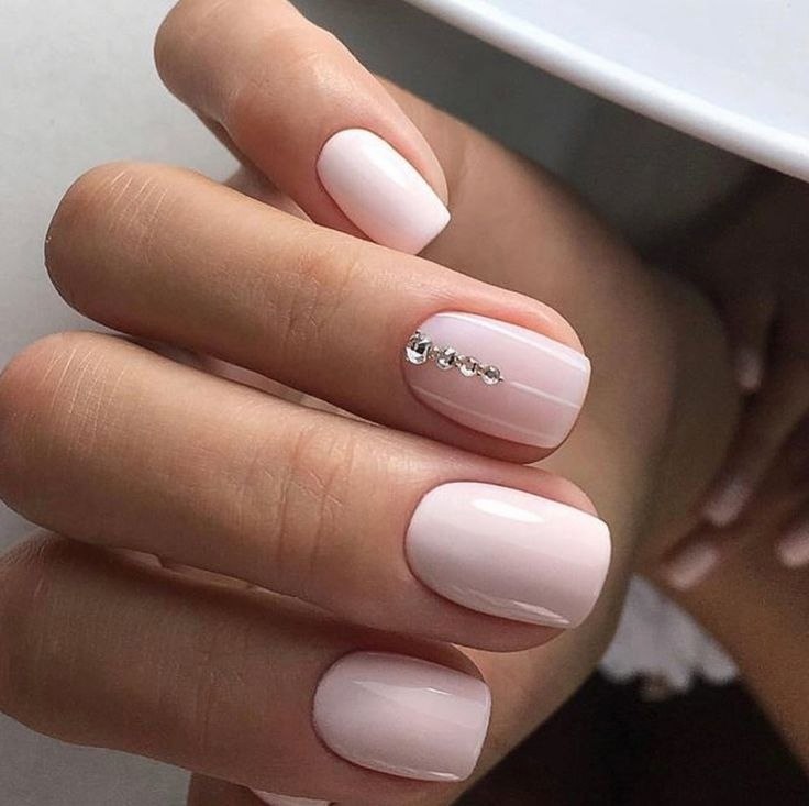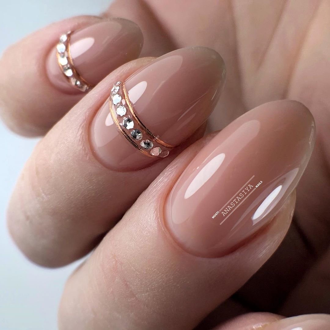 Если вы поклонница стиля минимализм, выбирайте для базы однотонные нюдовые оттенки лака. На них можно создавать целые картины стразами или размещать по одному два камешка у основания (лунулы), края пластины, в самой ее середине.