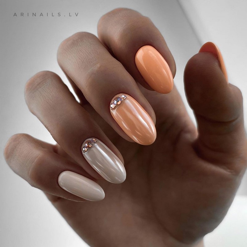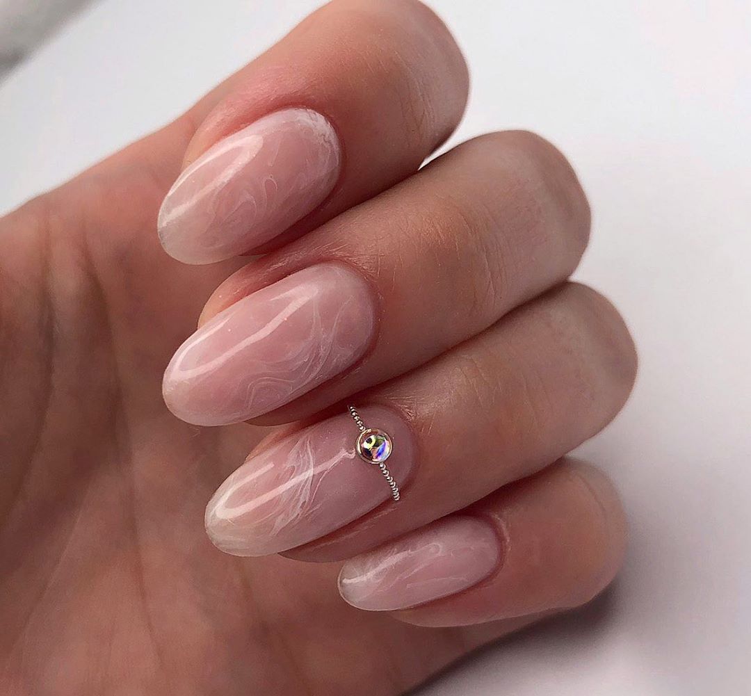 Тренд нового сезона — минимализм и естественность во всем. Именно поэтому рекомендуем обратить внимание на минималистичный дизайн стразами. Для этого достаточно наклеить пару камней в области лунки или другой зоне ногтя. Для такого дизайна лучше выбирать стразы необычной формы.