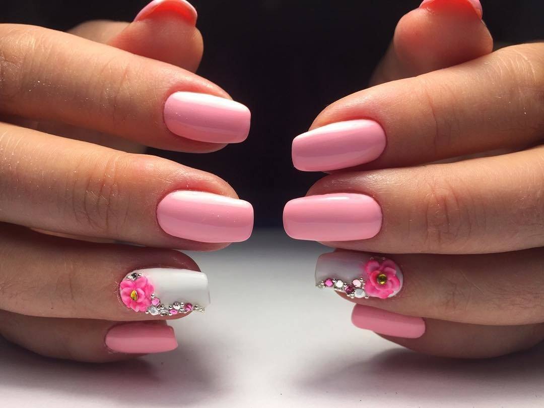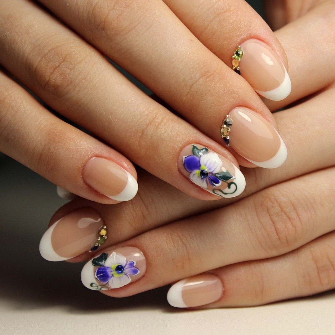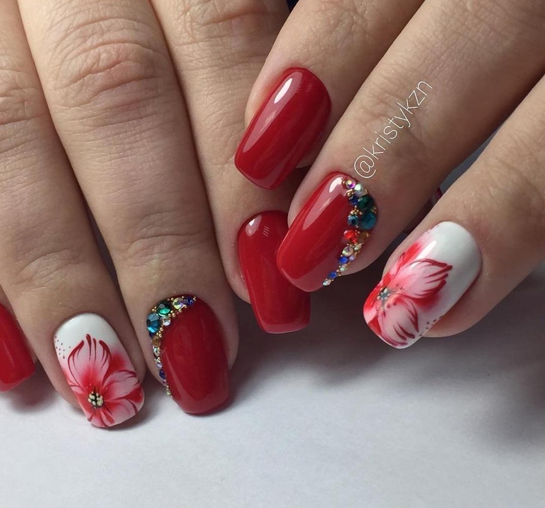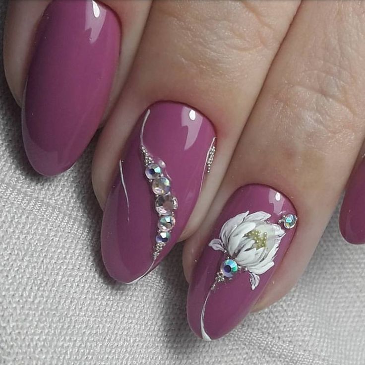 Отдельно выделим цветочный нейл-арт. Впереди весна и лето. а значит цветы будут особенно востребованы в маникюре. С помощью страз можно выделить серединки цветков или использовать их в других растительных мотивах. Например, веточки с листьями из камней.