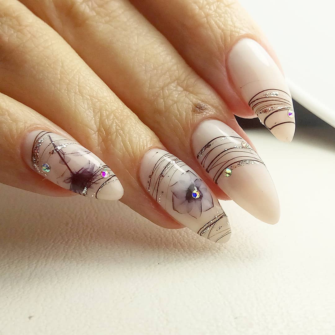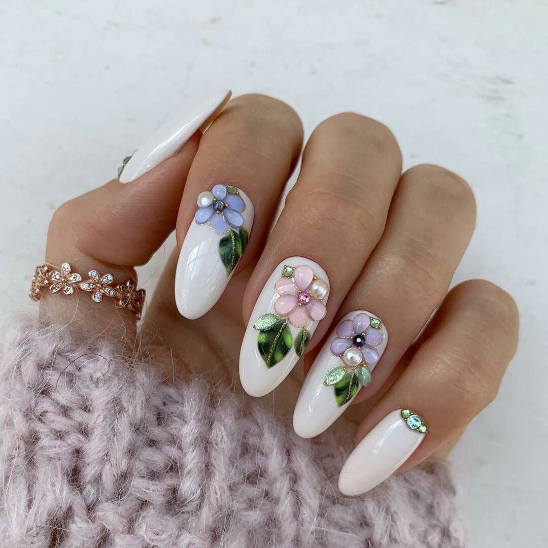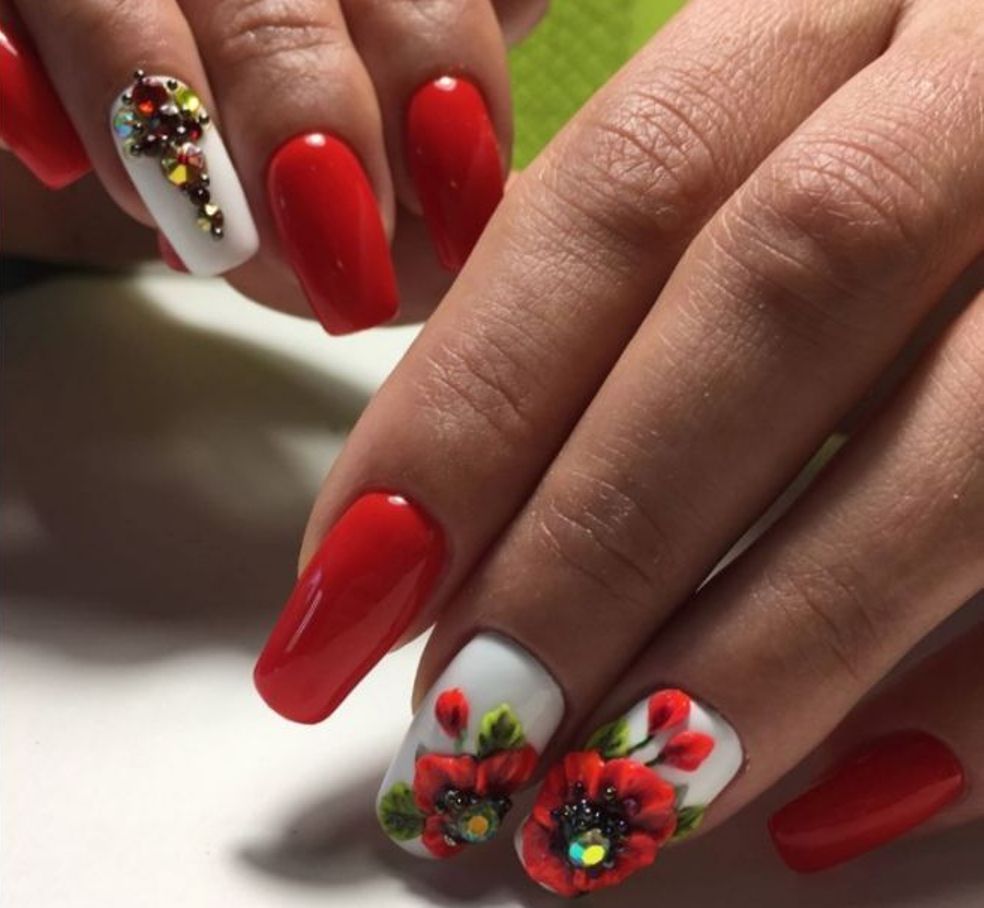 Отдельно выделим цветочный нейл-арт. Впереди весна и лето. а значит цветы будут особенно востребованы в маникюре. С помощью страз можно выделить серединки цветков или использовать их в других растительных мотивах. Например, веточки с листьями из камней.