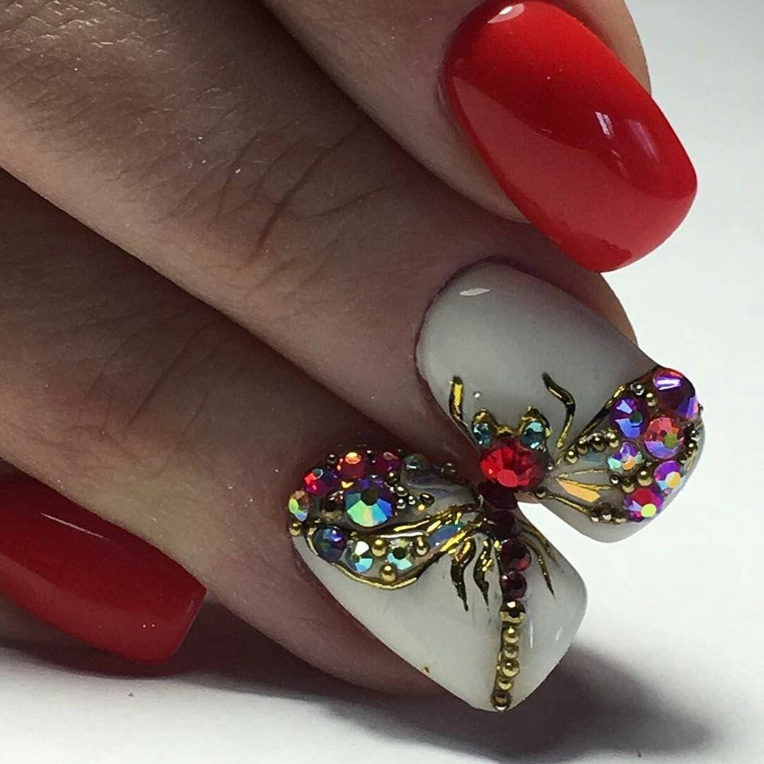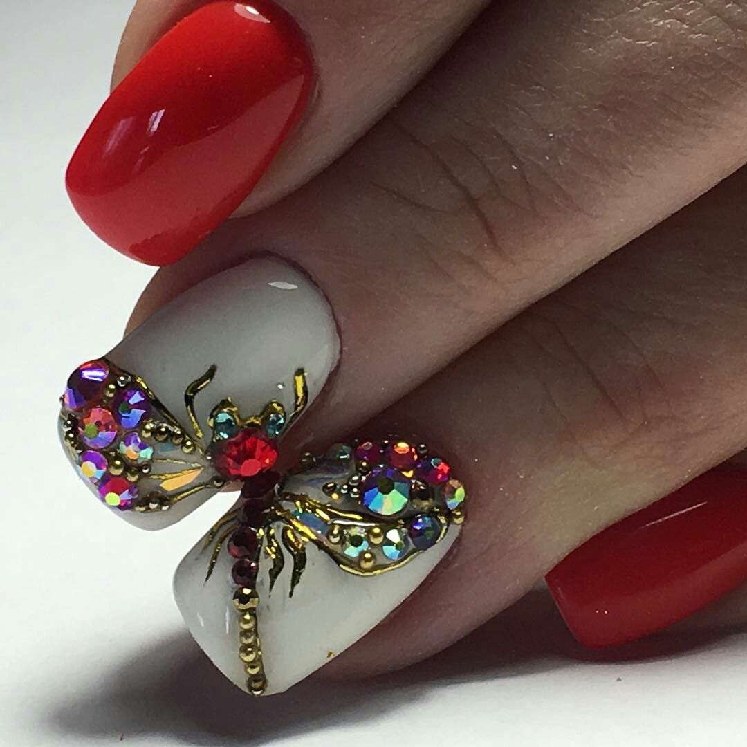 - стрекоза. Здесь можно применить такую технику: нарисовать стрекозу красками или с помощью трафарета, а голову и брюшко выложить стразами. Другой вариант — крылья из страз;