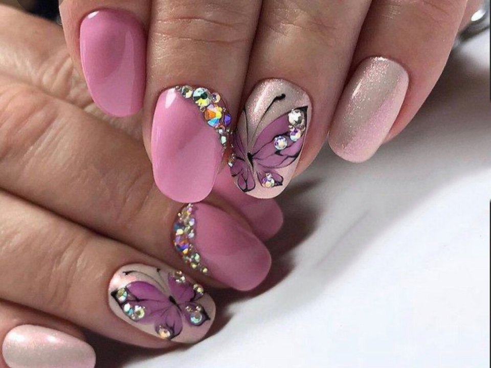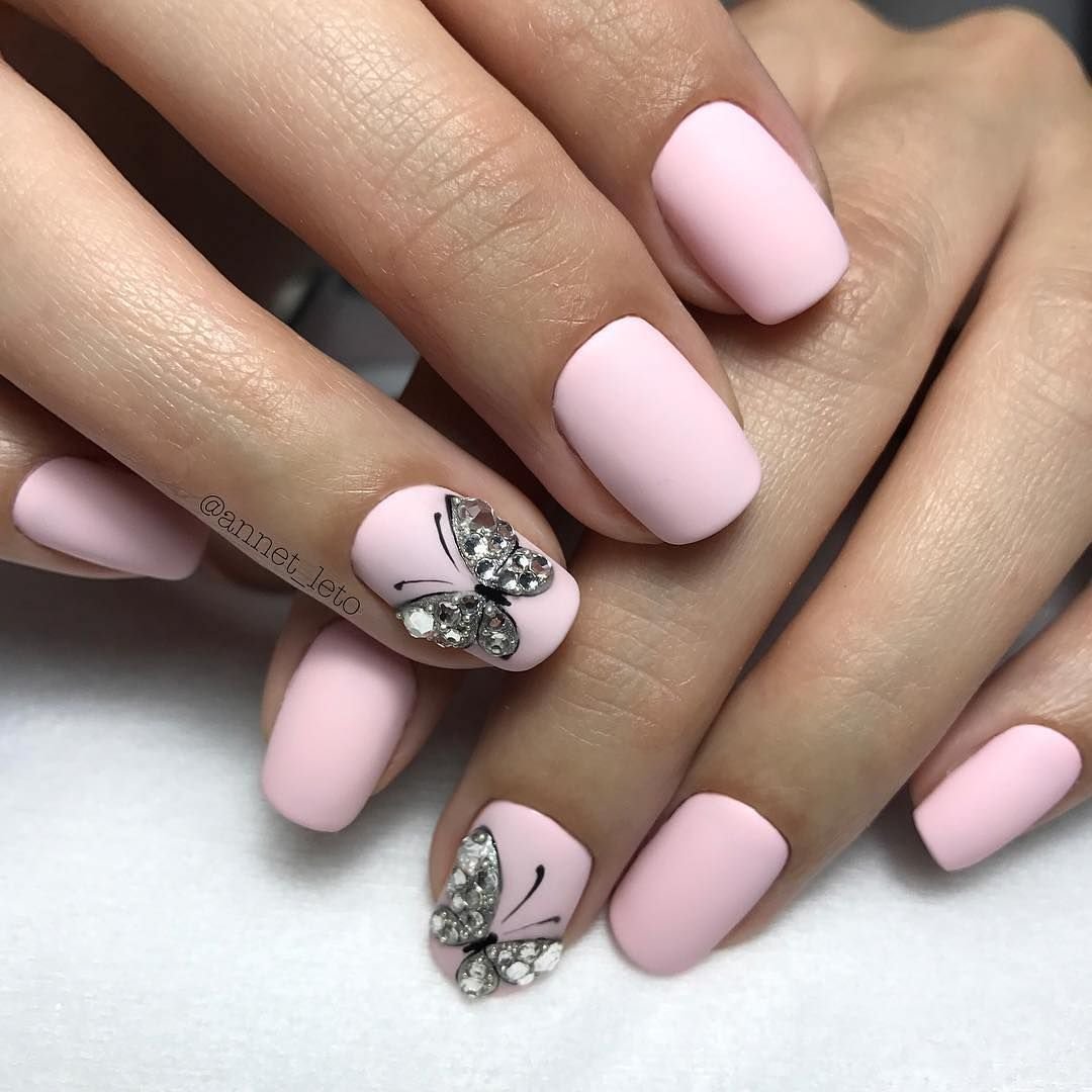 - бабочка. Интересно, но такой рисунок актуален не только в теплое время года, но и зимой. Особенно интересно смотрится такой дизайн, если силуэт бабочки будет расположен на разных ногтях и «собрать» его можно только если совместить соседние пальчики;