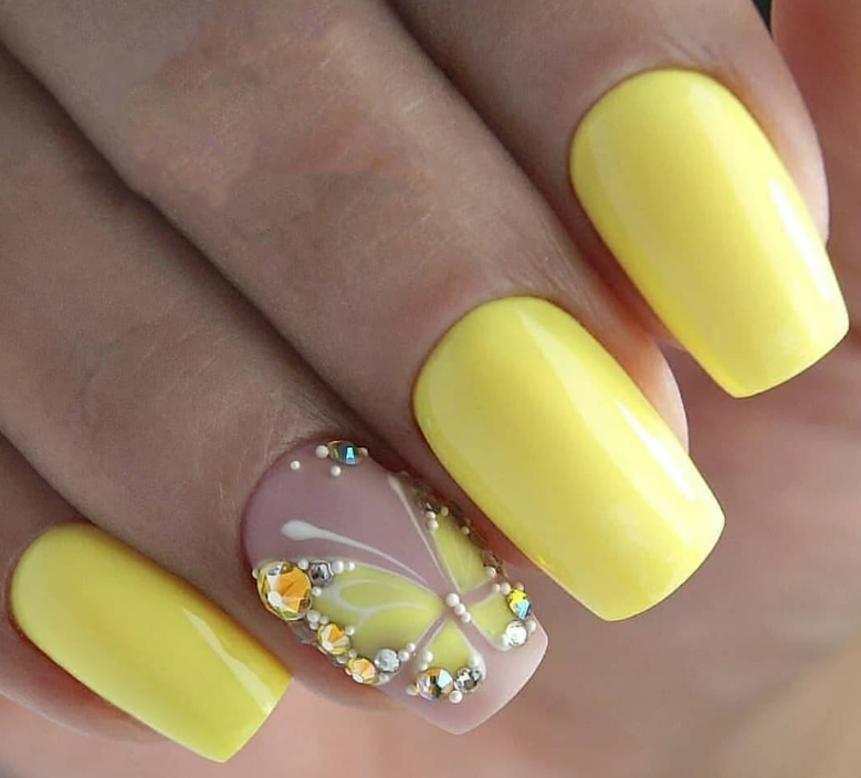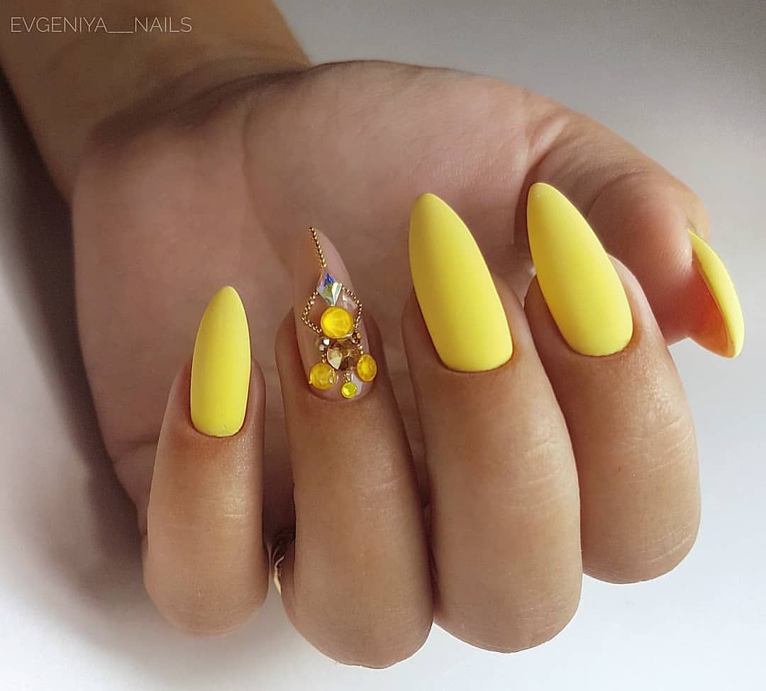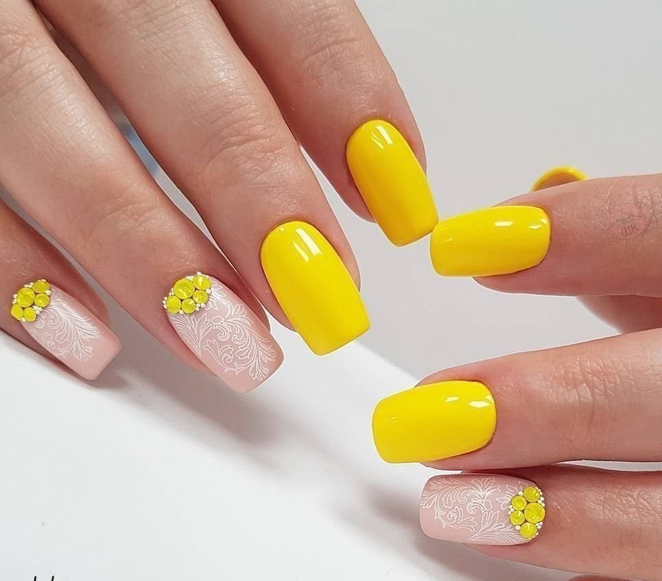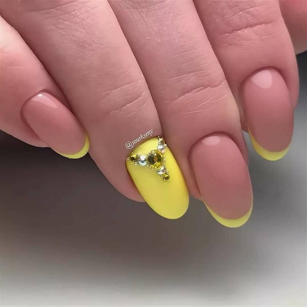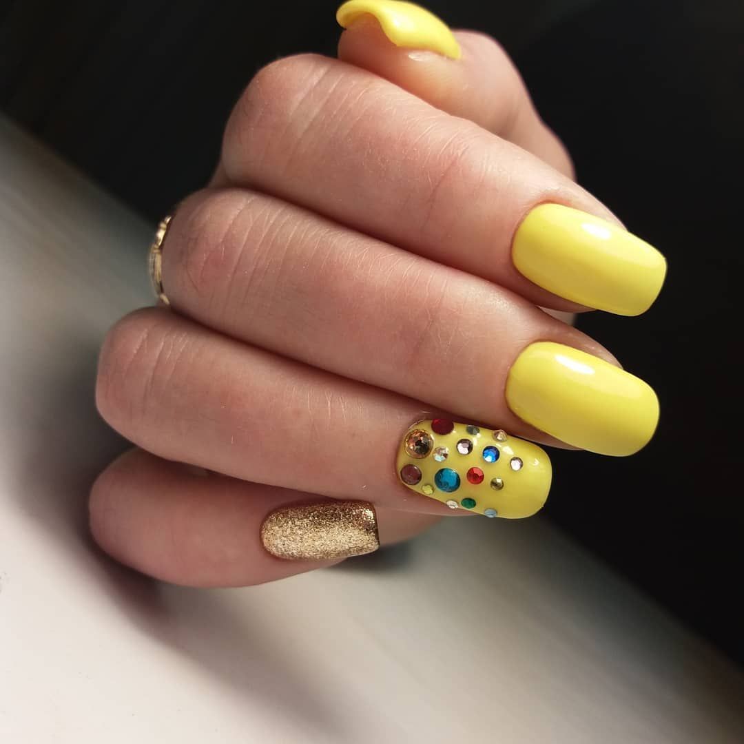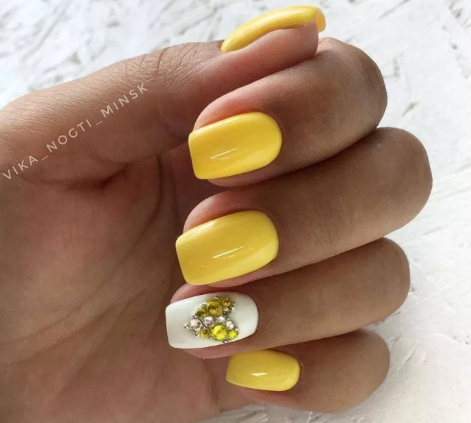 Вы заметили, что желтые оттенки в маникюре используют не так часто? А для декора на такой базе чаще всего выбирают рисунки или блестки. Но стразы очень эффектно сочетаются с теплыми желтыми тонами — банановый, желто-оранжевый, охра и др.