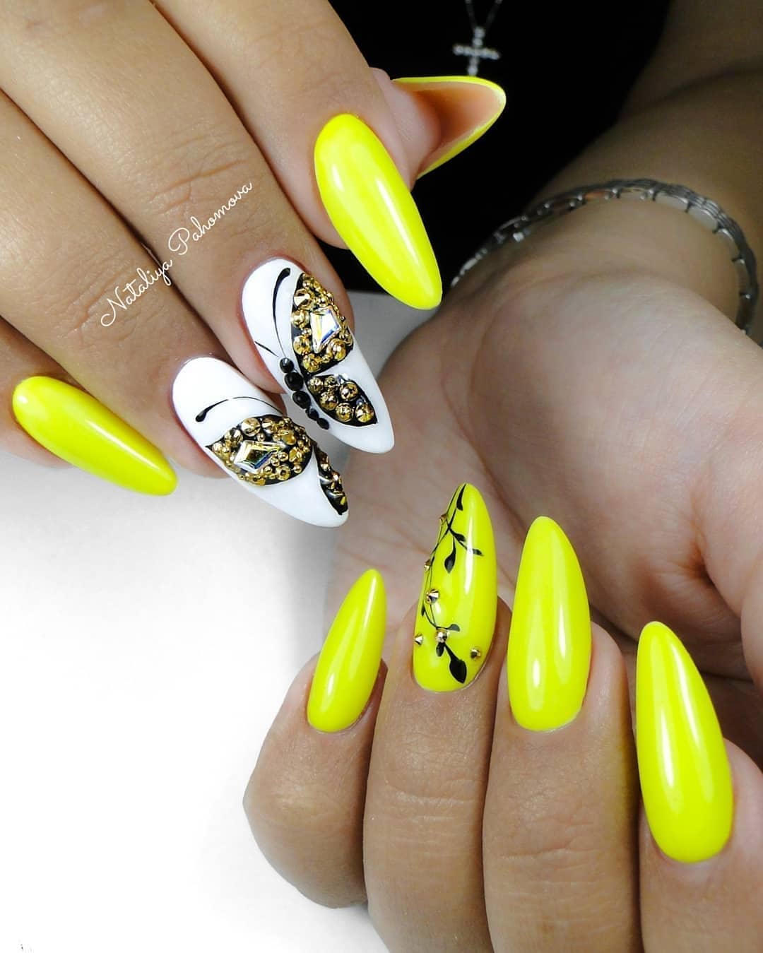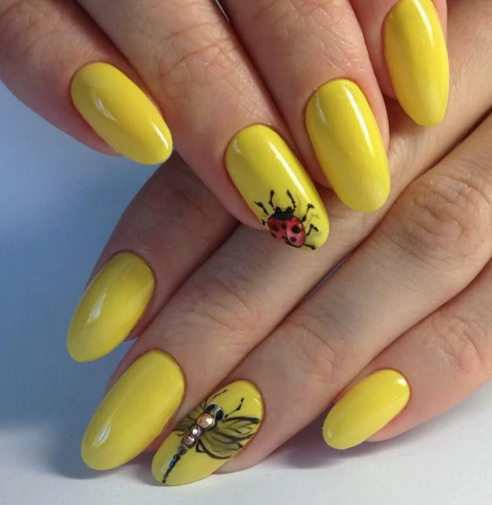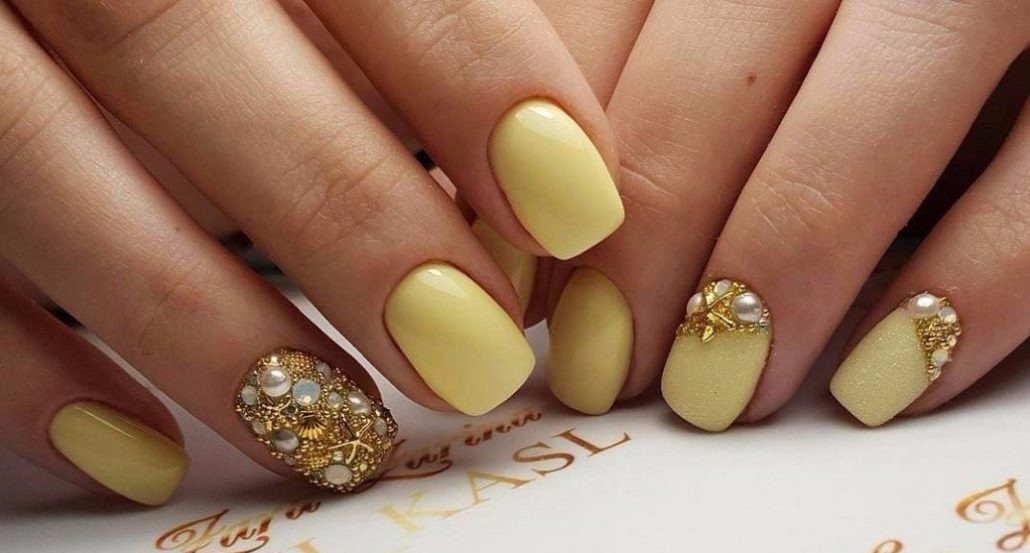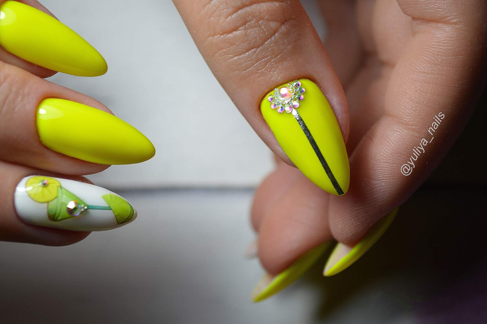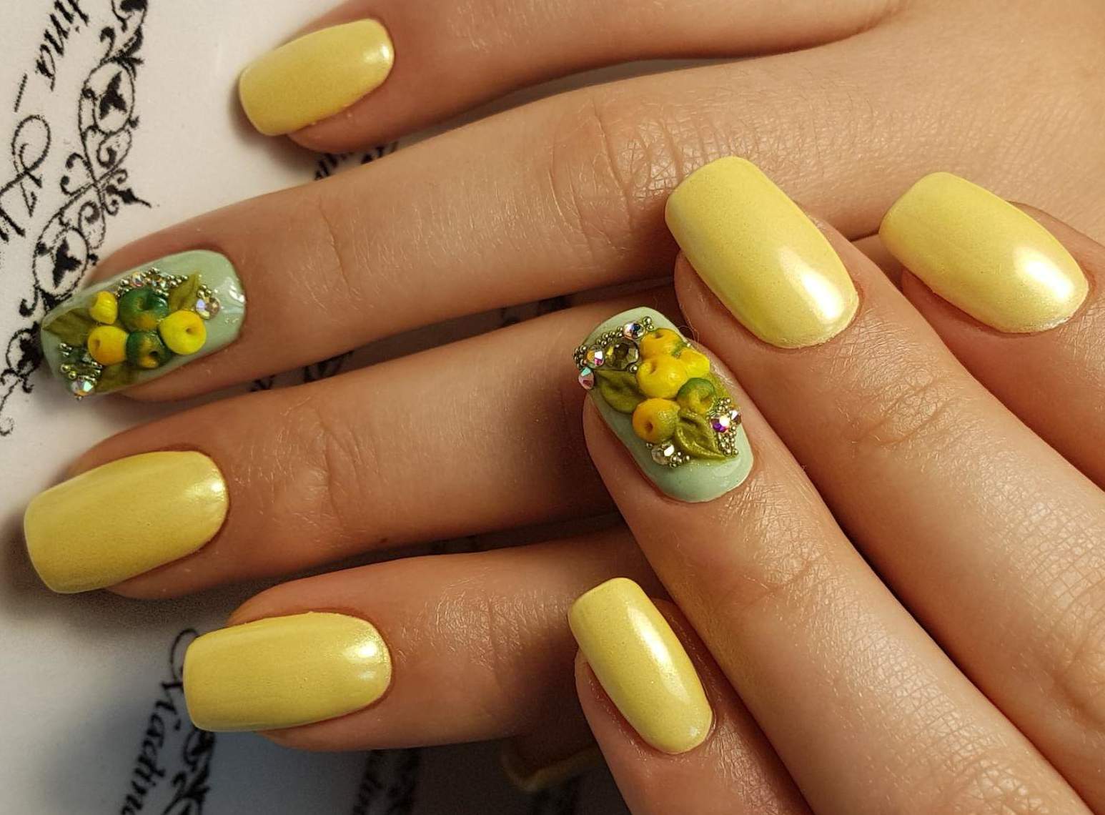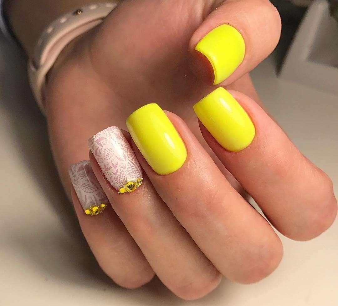 Вы заметили, что желтые оттенки в маникюре используют не так часто? А для декора на такой базе чаще всего выбирают рисунки или блестки. Но стразы очень эффектно сочетаются с теплыми желтыми тонами — банановый, желто-оранжевый, охра и др.