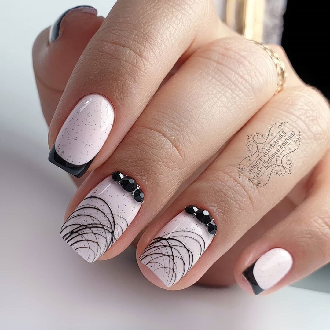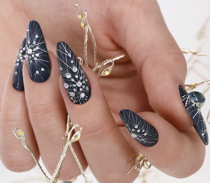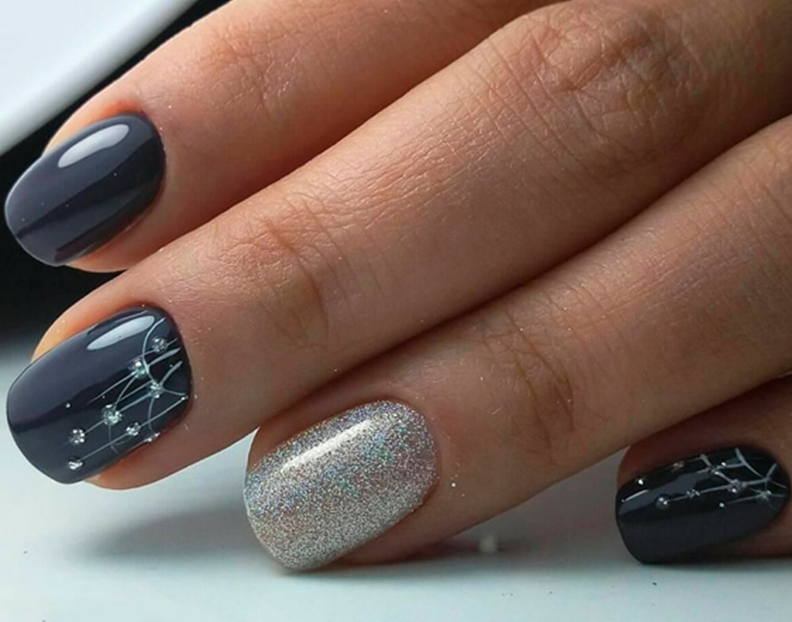Паутинка — тонкие линии гель-лака, которые мастер наносит в хаотичном порядке. Сделать дизайн более изысканным помогут стразы. Их крепят в нити паутинки, создавая впечатление, что камни словно запутались в ней. Чем затейливее будет выполнена паутинка, тем интереснее дизайн.