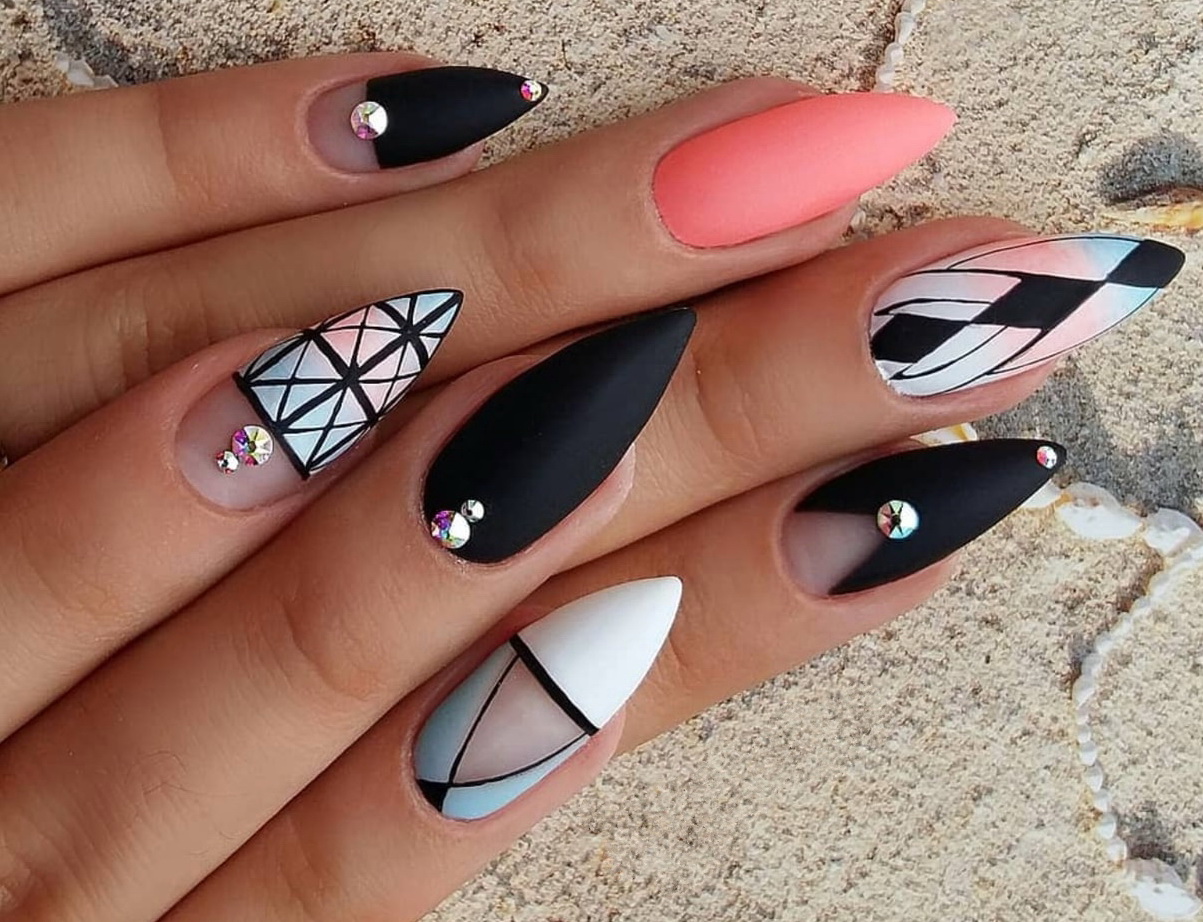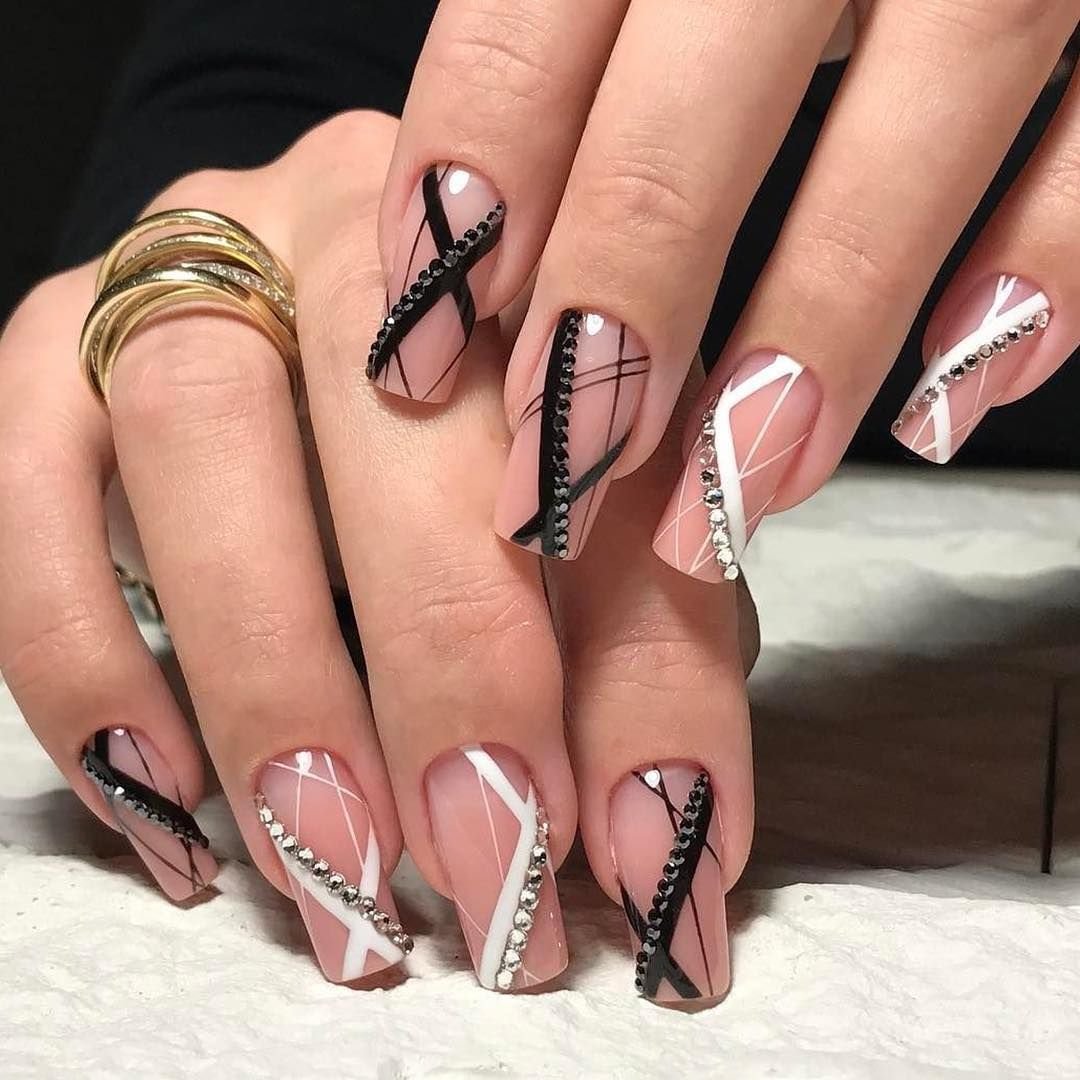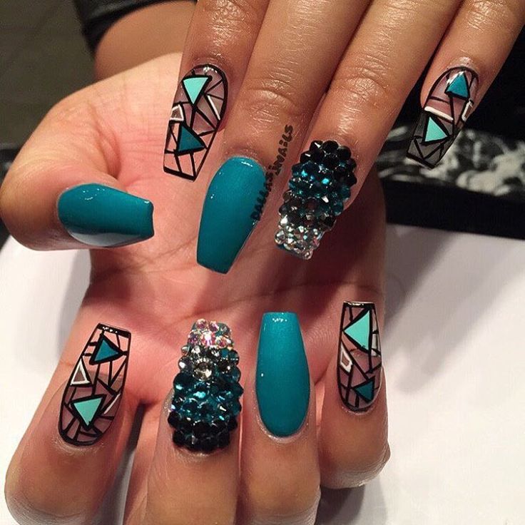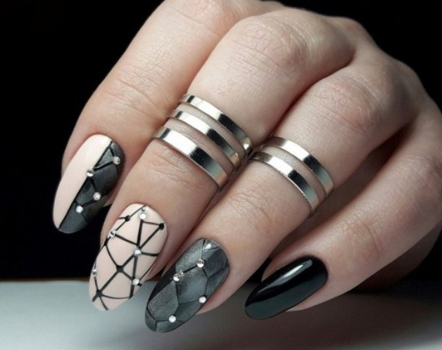 Сделать такой дизайн можно и самостоятельно. Просто нанести геометрический или абстрактный рисунок на ноготь, а стразы разместите в местах пересечения линий, сочетания цветов или покройте ими части фигур. Стильно смотрится маникюр с сеткой из ромбиков, в точке пересечения которых закреплено по маленькой стразинке или бусинке.
