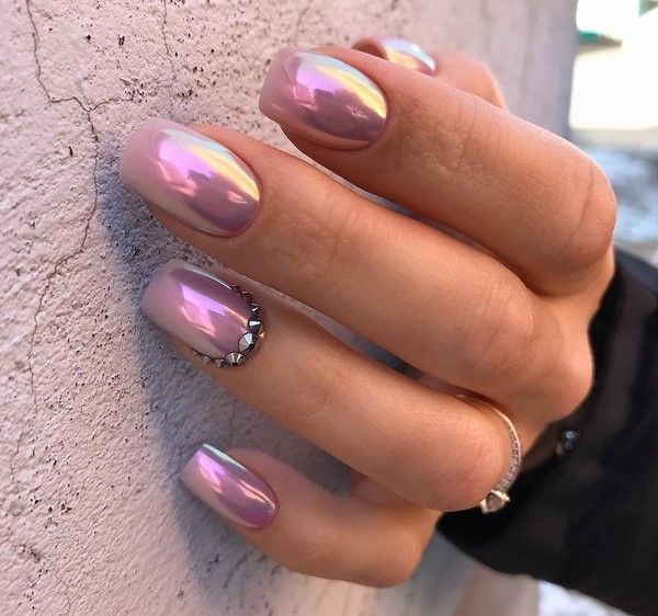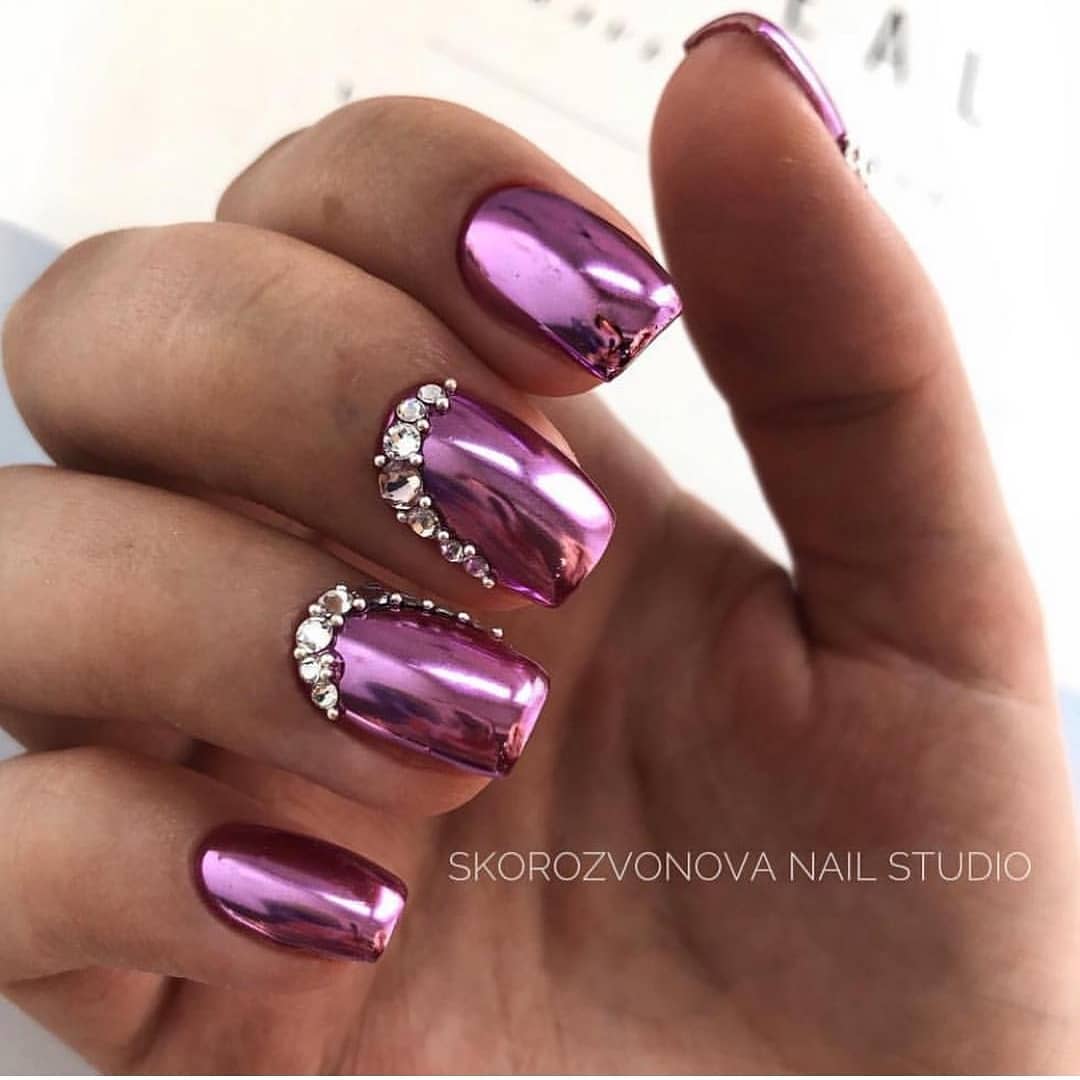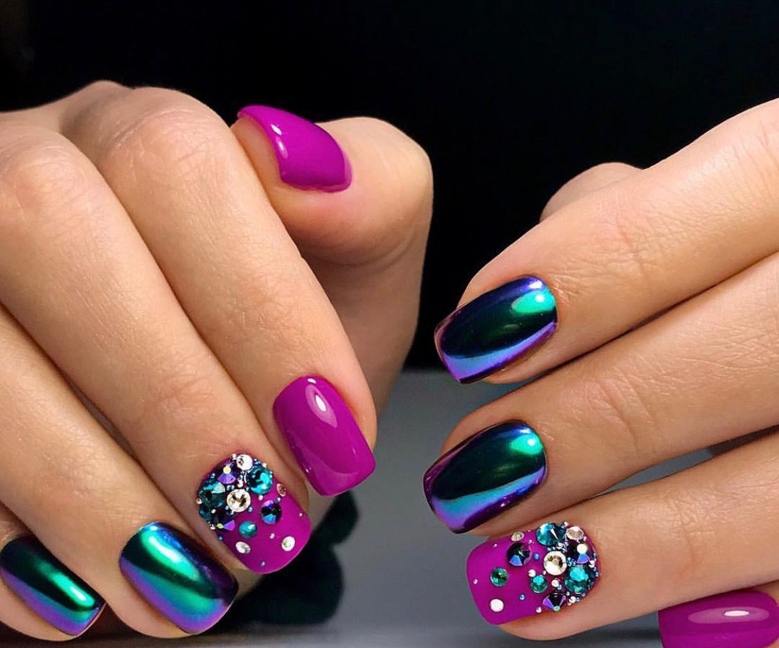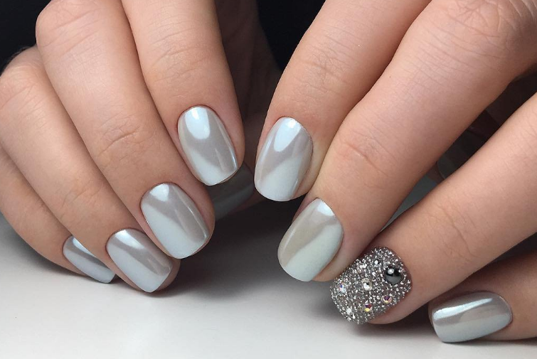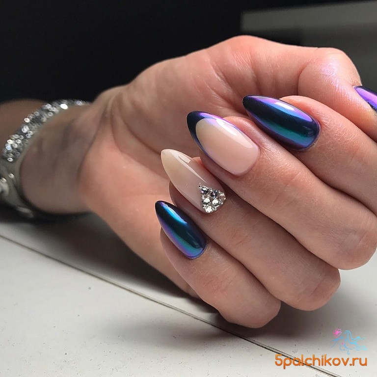 Еще один активный вариант дизайн ногтей, который можно сочетать со стразами. Но делать это стоит очень осторожно. Не стоит лепить камни прямо на втирку. Эти два декора должны органично соседствовать в маникюре, а не перебивать друг друга.