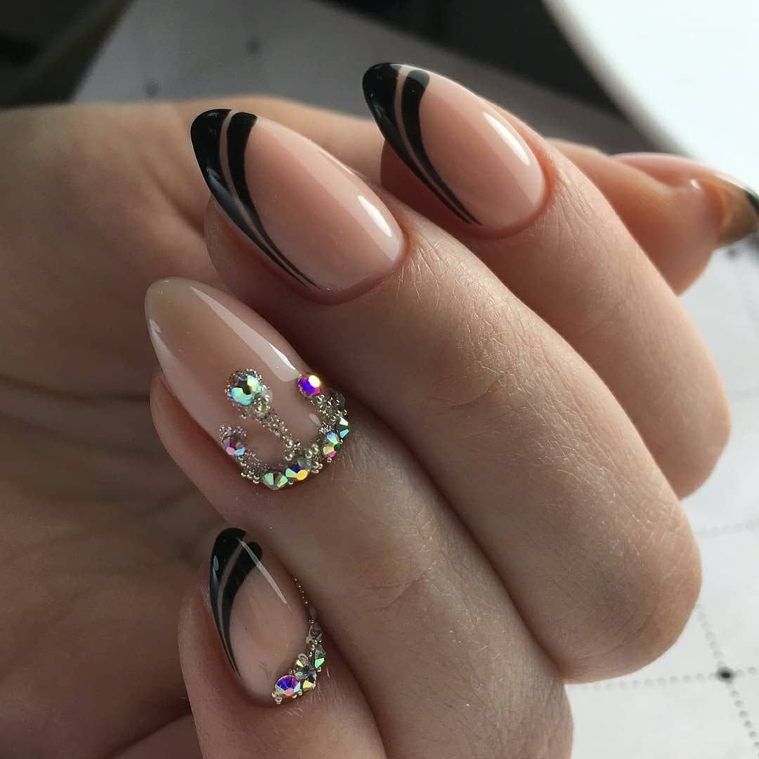 Совет: и не забывайте про лунный маникюр. Он так же актуален, как и френч. Выделить лунку стразами — отличная идея. Выбирайте оттенок камней в цвет френча. Например, черные, если улыбка оформлена в стиле «total black».