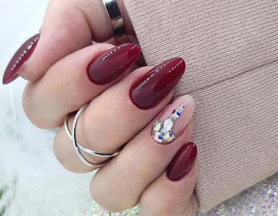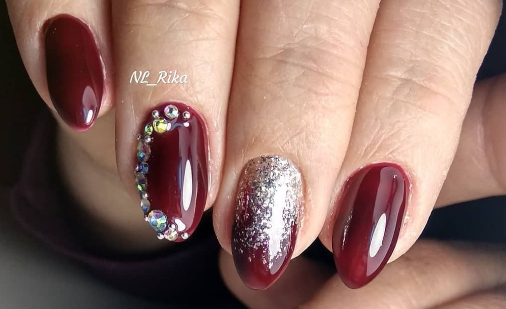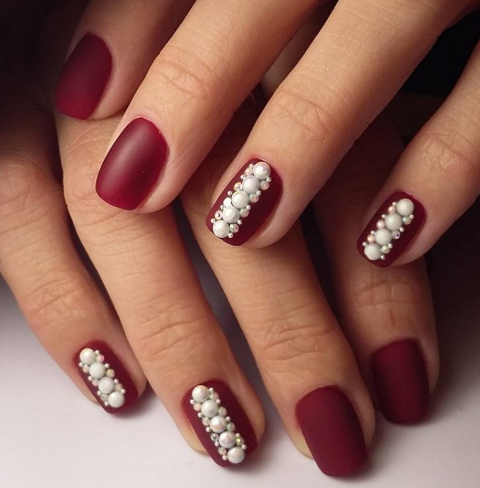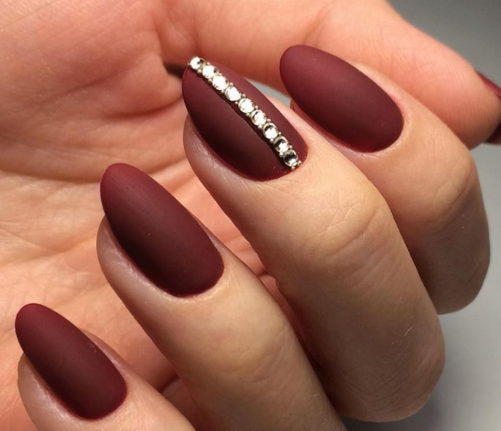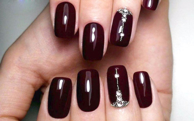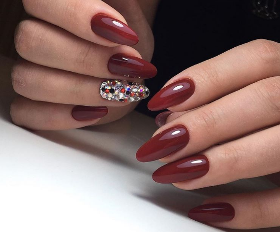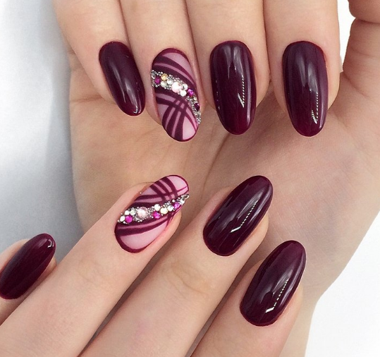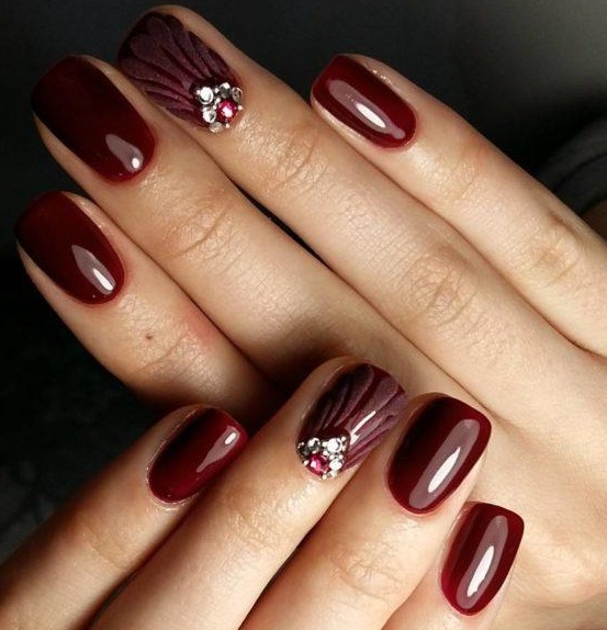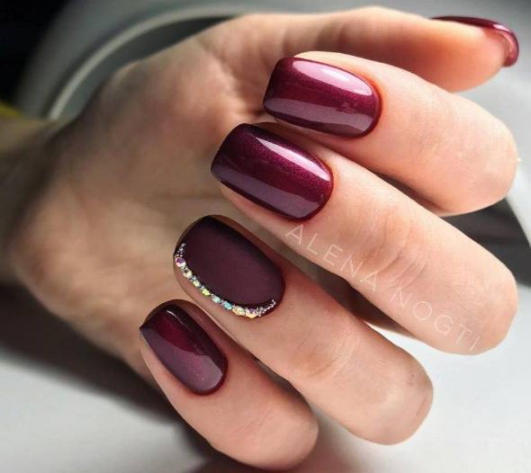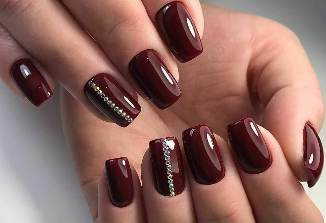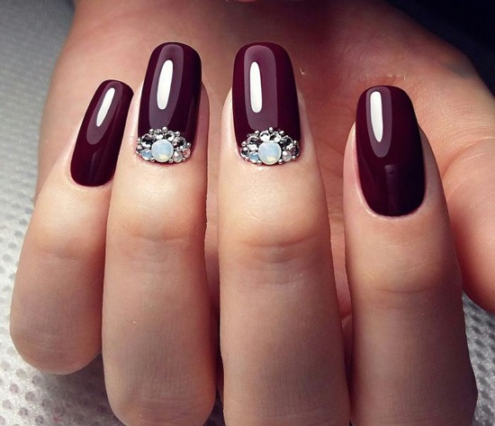 Стразы на бордовой базе — классика маникюра. Идей дизайна с камнями огромное количество: