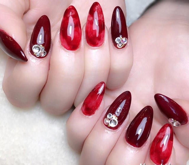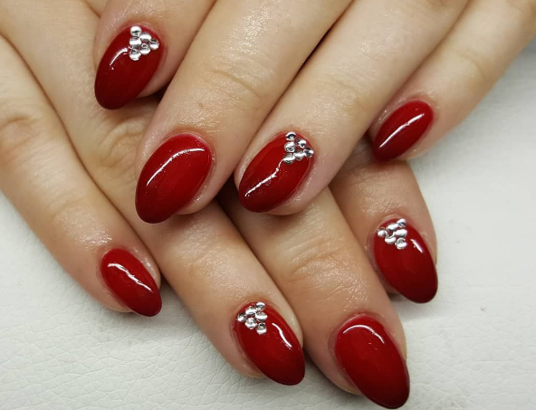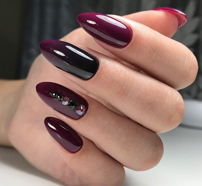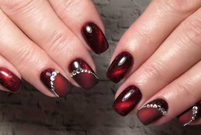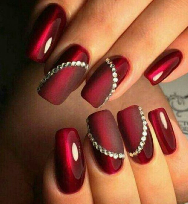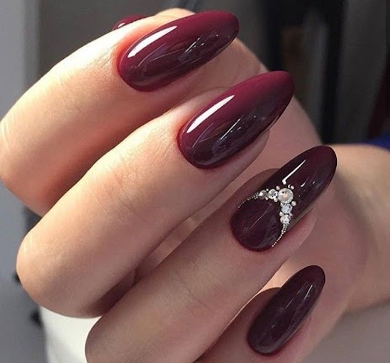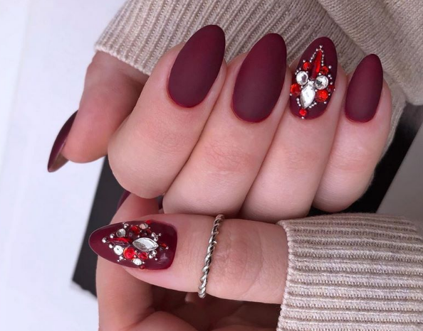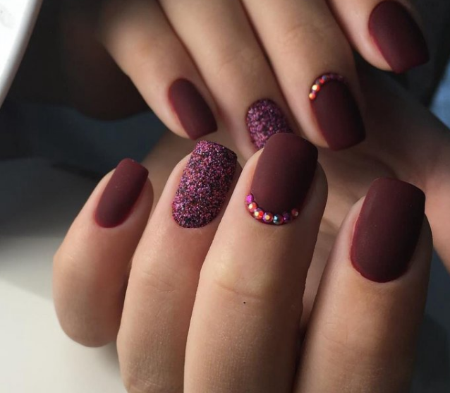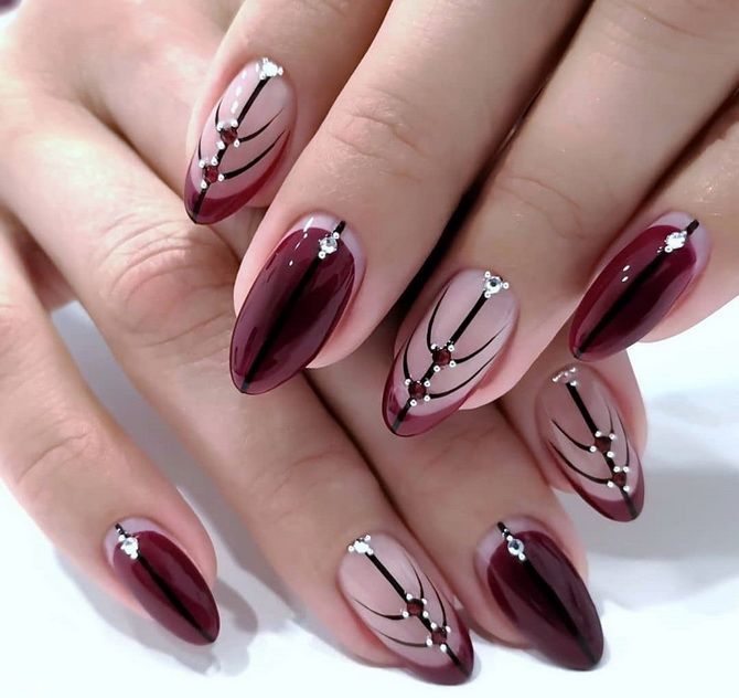 Стразы на бордовой базе — классика маникюра. Идей дизайна с камнями огромное количество: