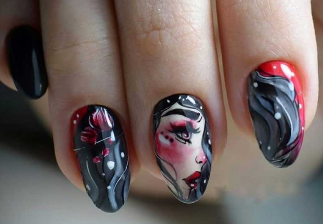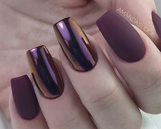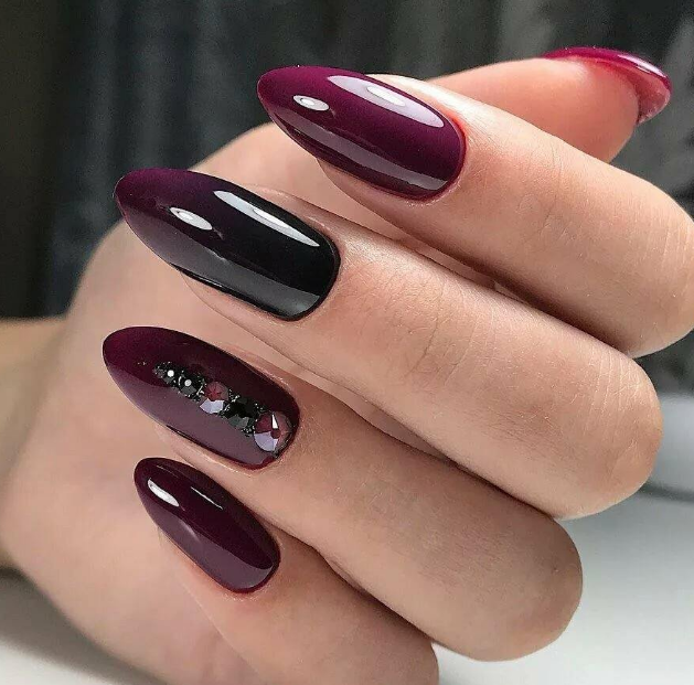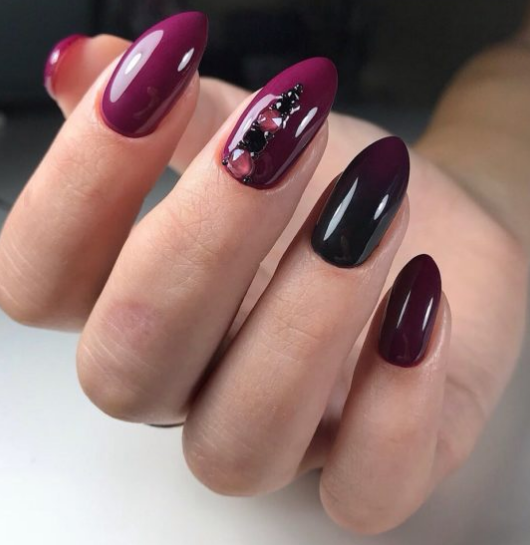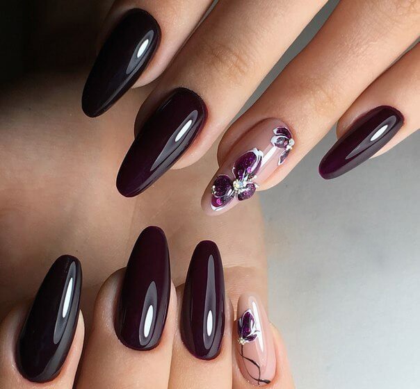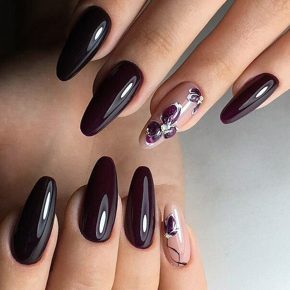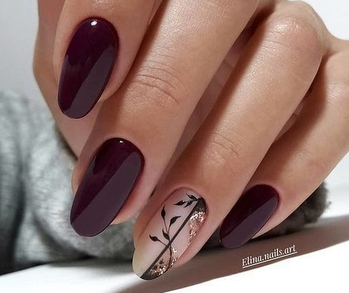 Для длинных ногтей оптимальная форма миндаль или овал. А вот для большой длины специалисты нейл-арта советуют не злоупотреблять декором и дизайном. Оптимально для такого глубокого цвета — однотонное покрытие (матовое или глянцевое). Если решите нанести декор, выбирайте не все ногти на руке или сделайте дизайн разным.