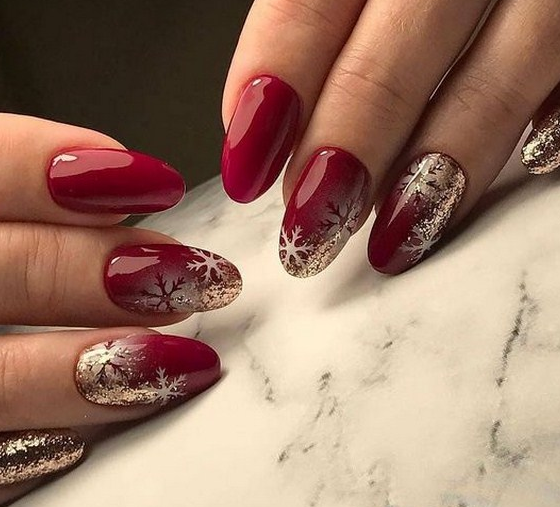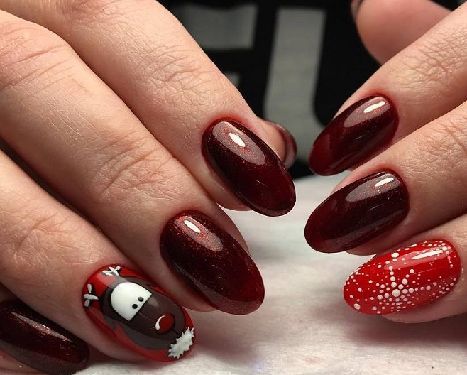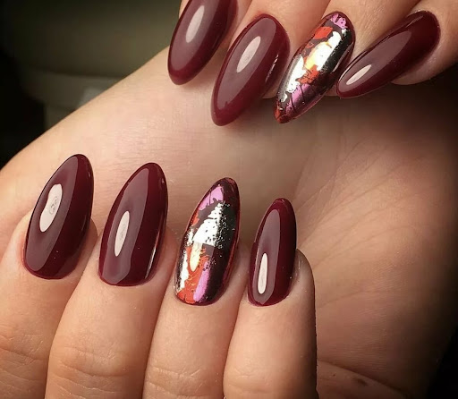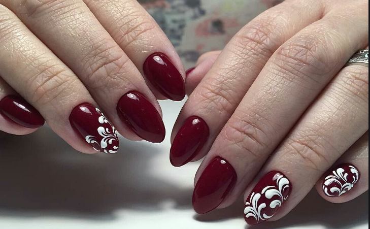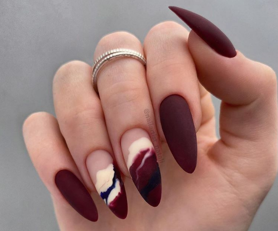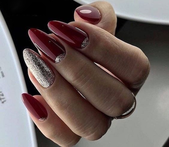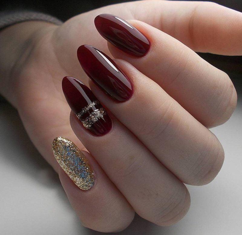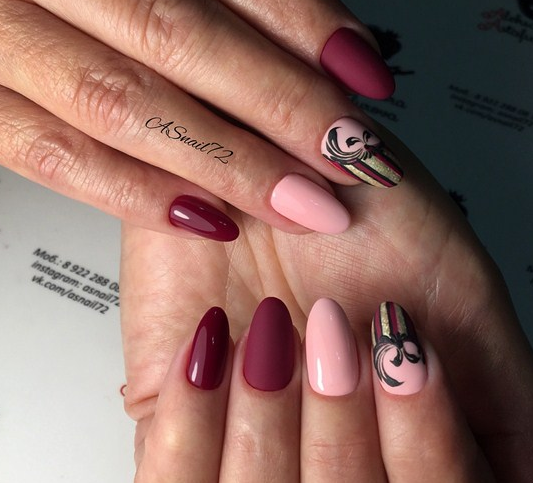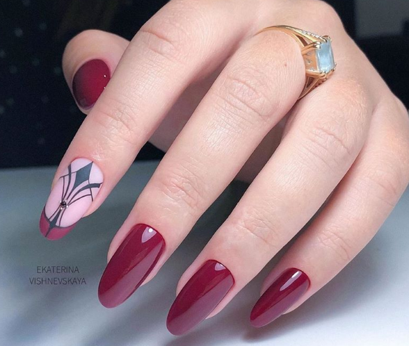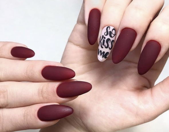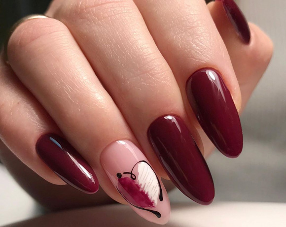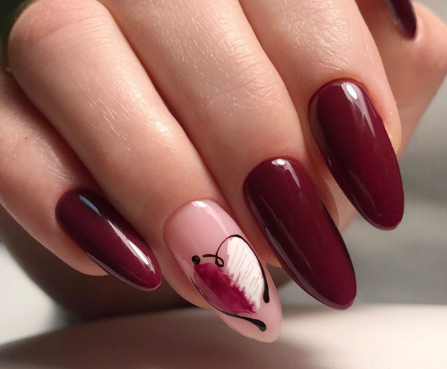 Миндаль — это универсальная форма, которой идет любой оттенок бордового, практически любой дизайн. Все ограничивается только фантазией нейл-мастера.