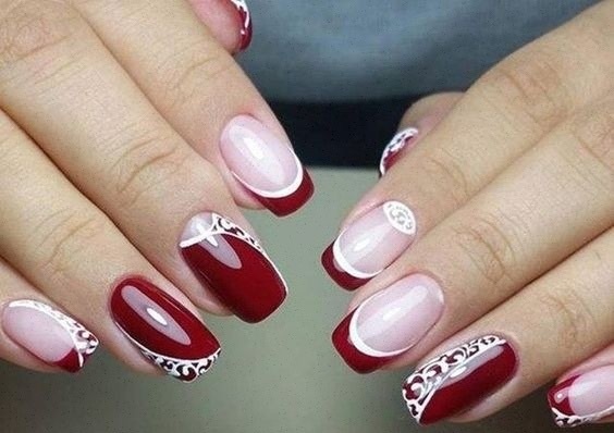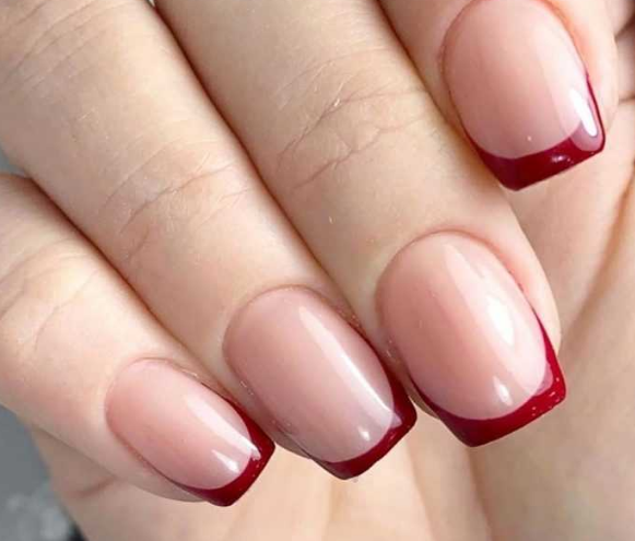 - сочетание естественного цвета ногтя с винной полоской и выделенной бордовым лункой;