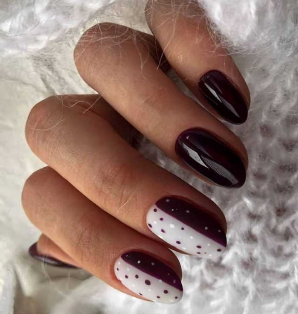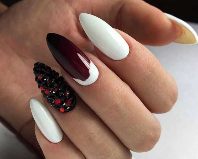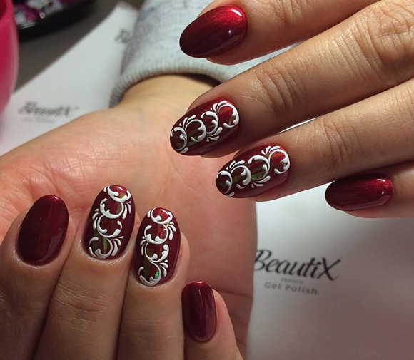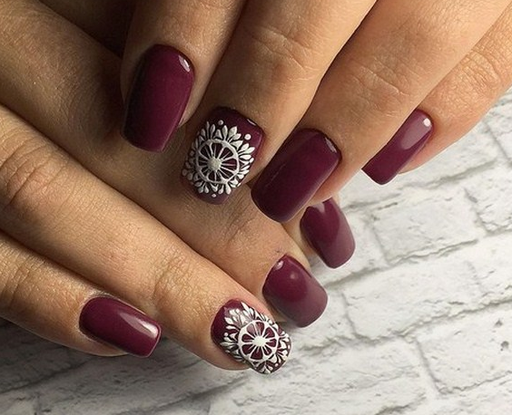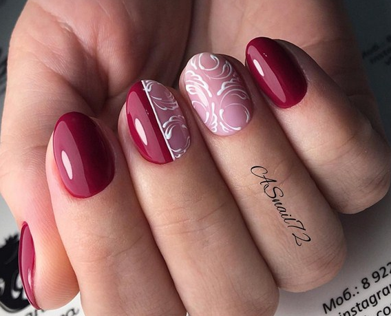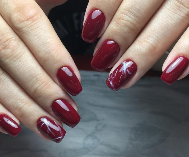 Белый придает винному насыщенности, подчеркивает его глубину и красоту. Рекомендуется использовать оба цвета в равных пропорциях в нейл-дизайне. Очень интересно смотрится мраморный дизайн — разводы оттенка марсала на белом или молочном фоне.