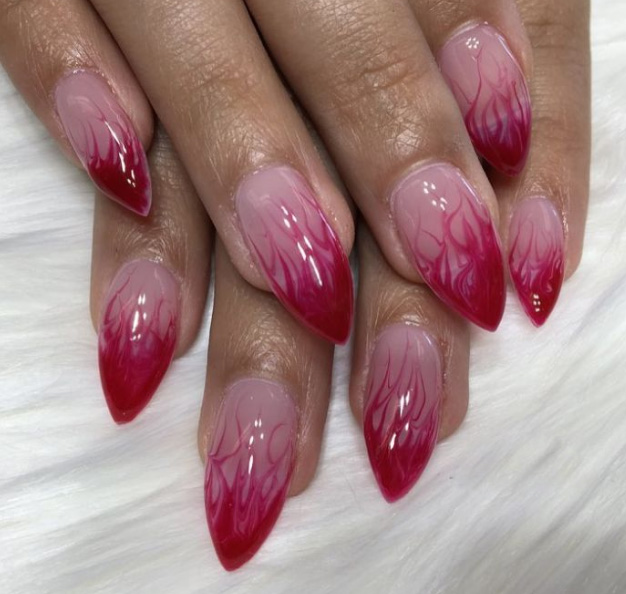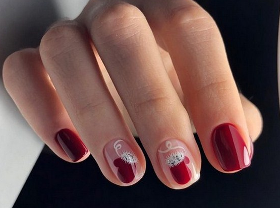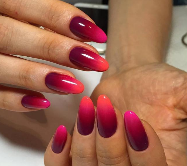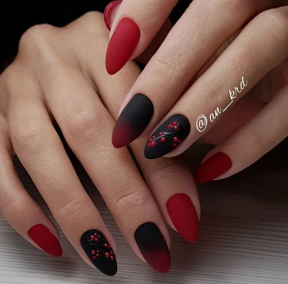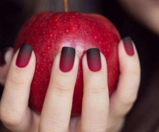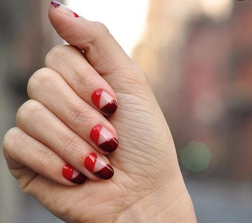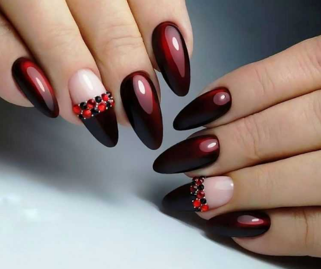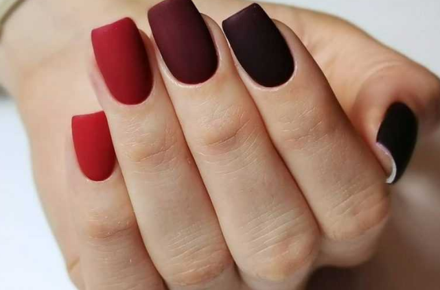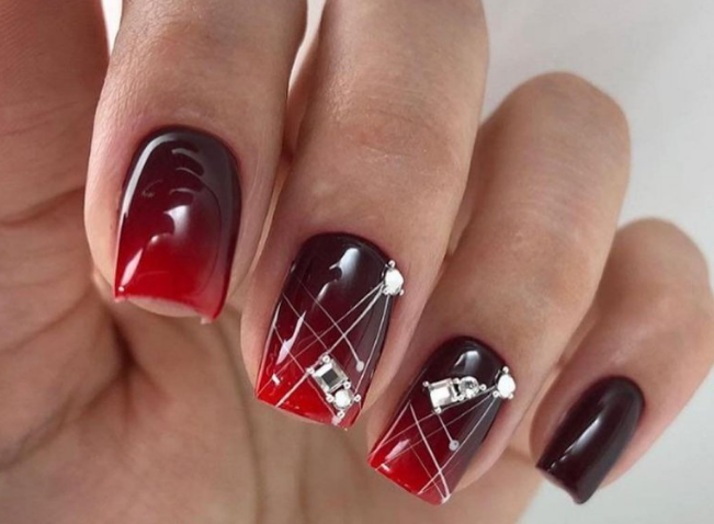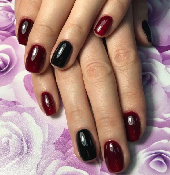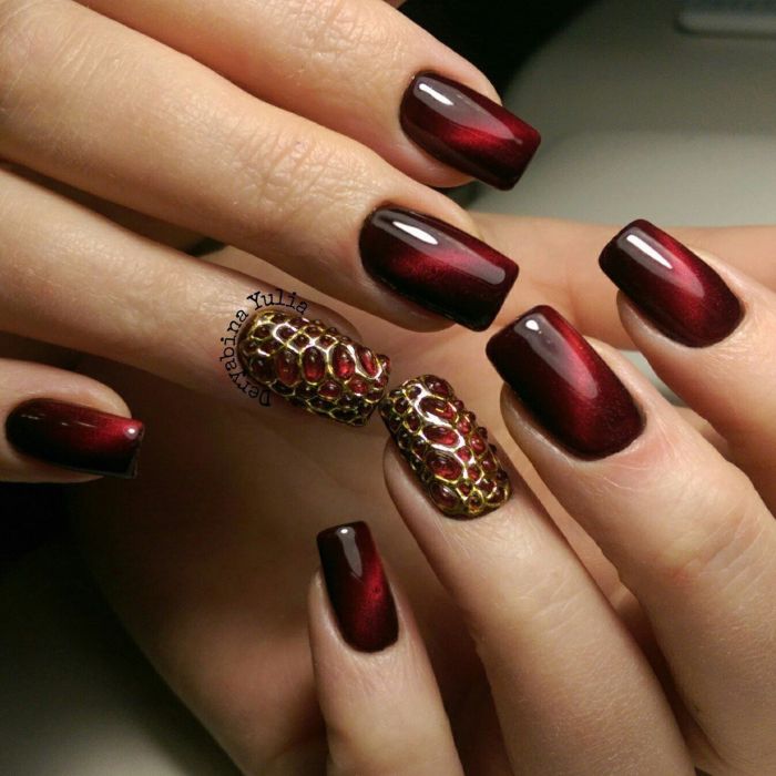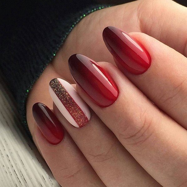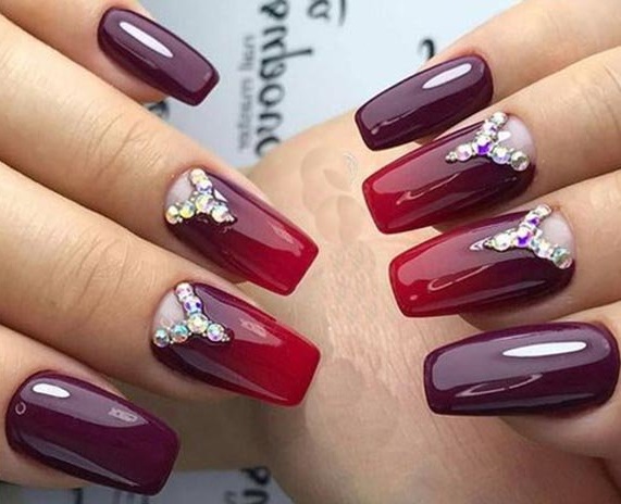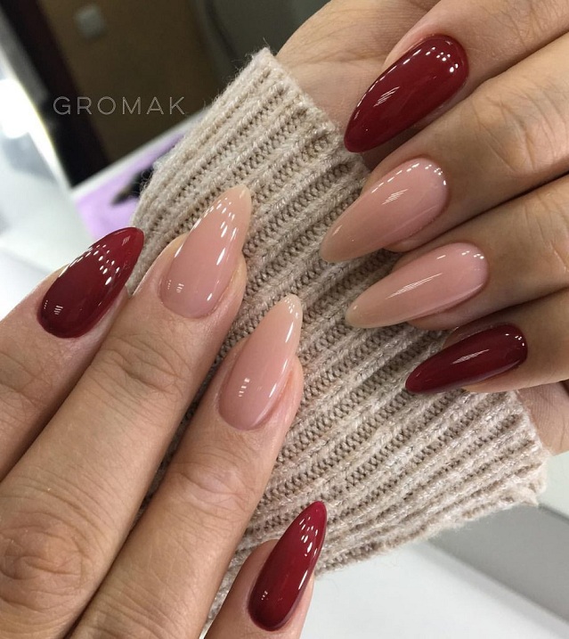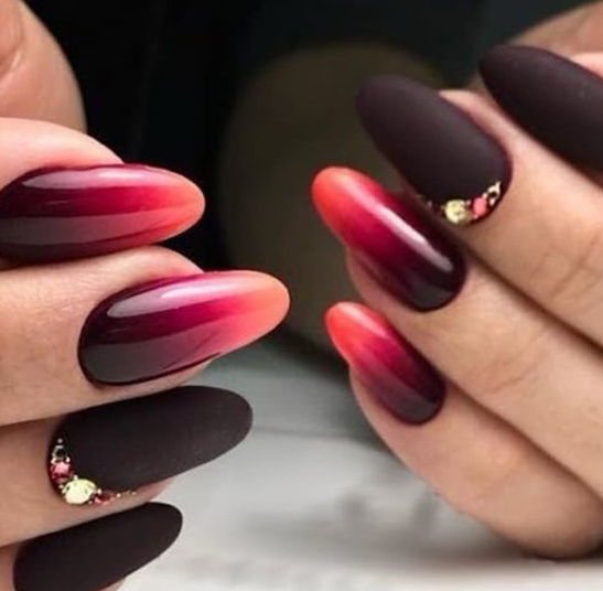 Сочетание красного и винного, рубинового, вишневого — отличная идея дизайна в стиле омбре. Для других вариантов декора лучше выбирать разные по плотности оттенки лака, чтобы получился эффект многослойности, а не двухцветности.
