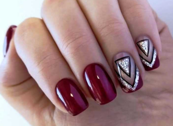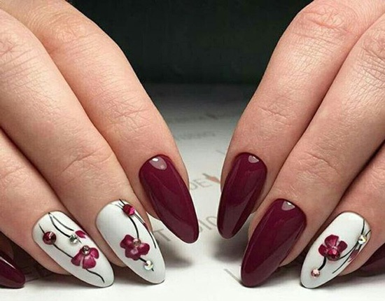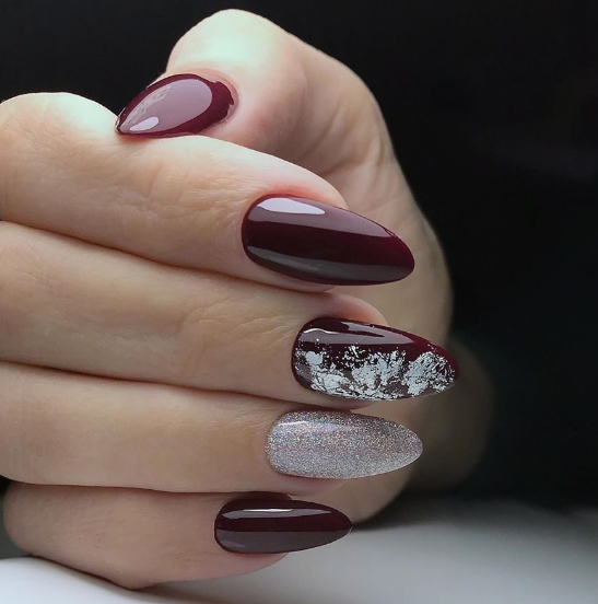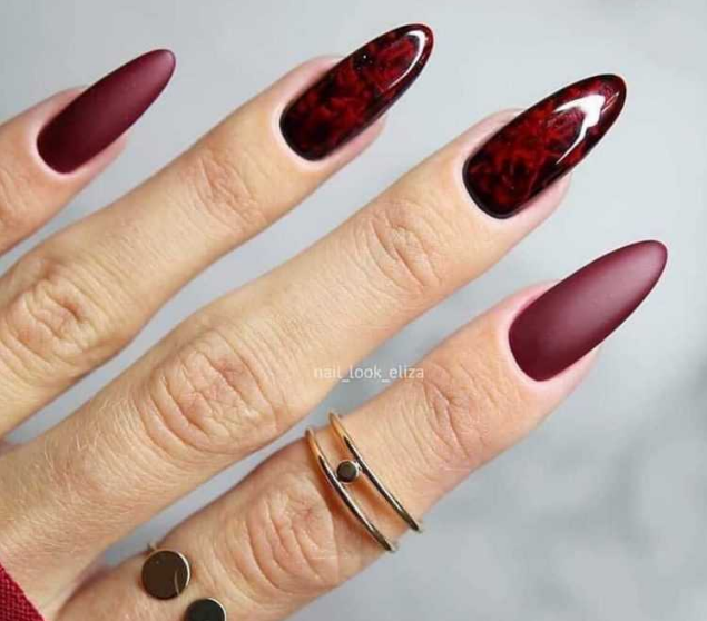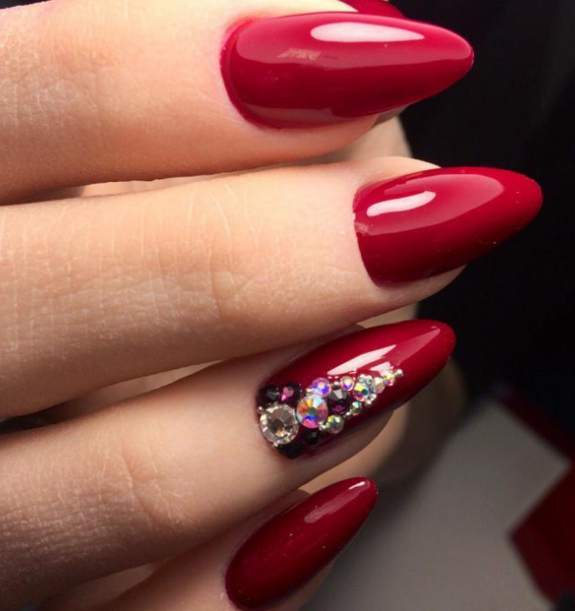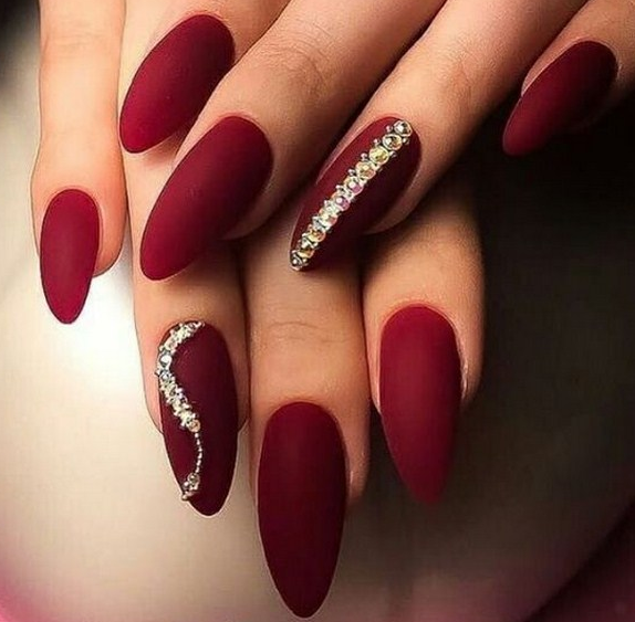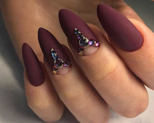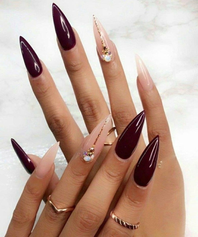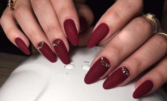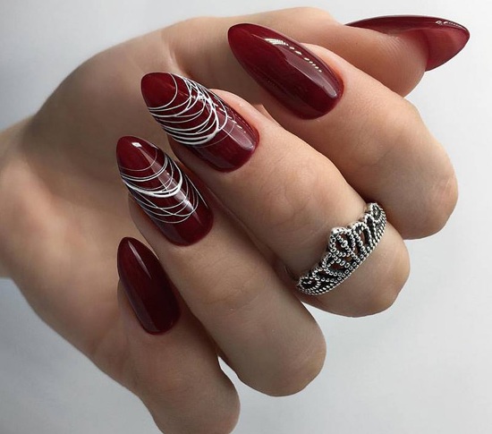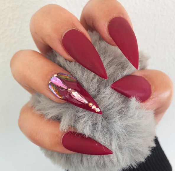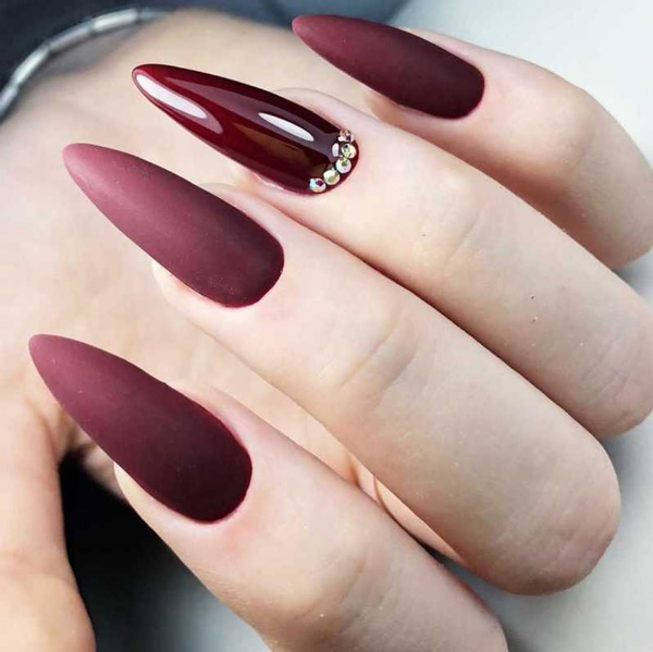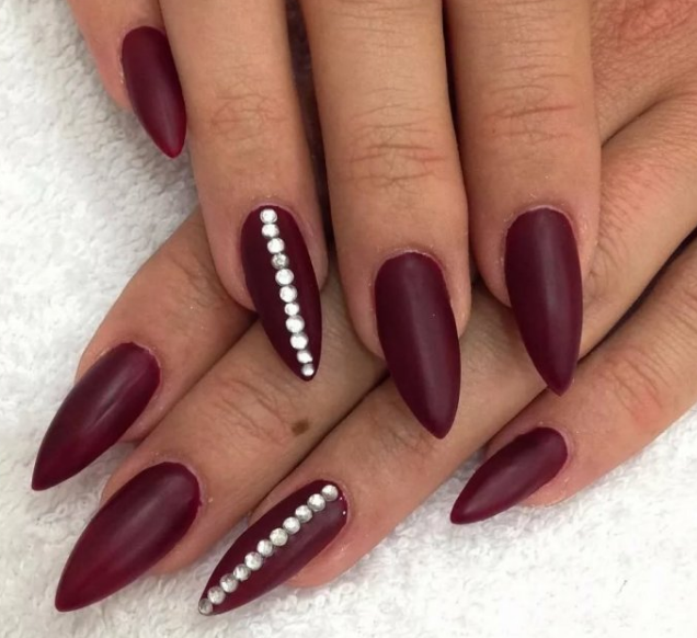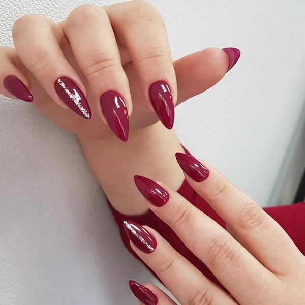 Острая форма пластины — это смело, изысканно и привлекательно. Такой маникюр абсолютно точно не останется без внимания. Бордовый оттенок сделает его еще более заметным, поэтому дизайн следует выбирать осторожно. Обилие элементов может сделать его безвкусным и даже вульгарным.