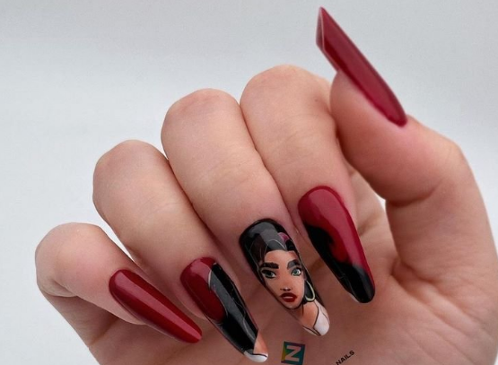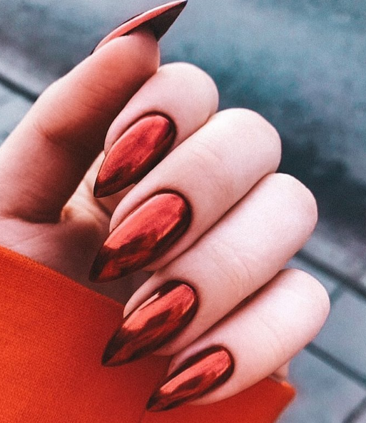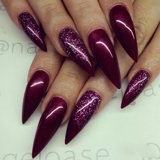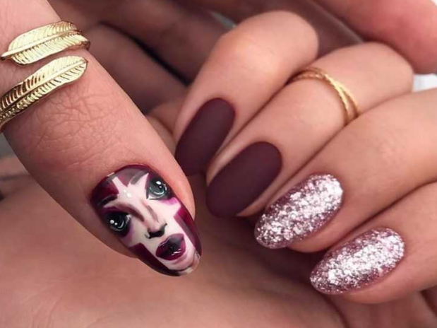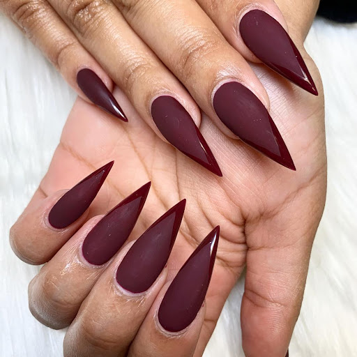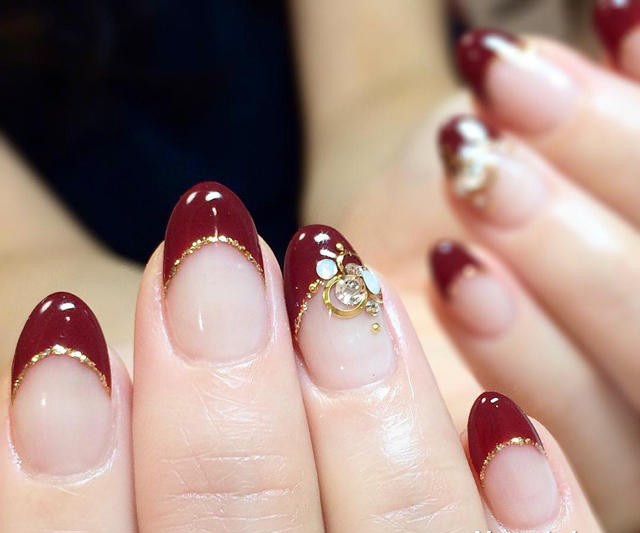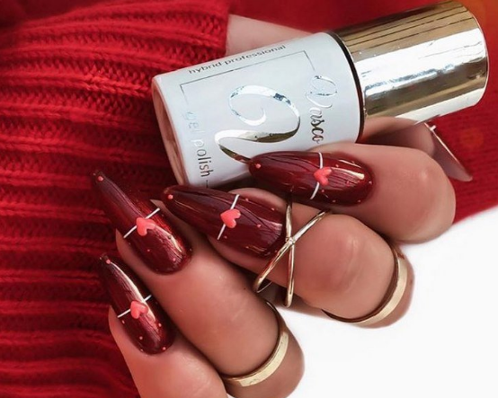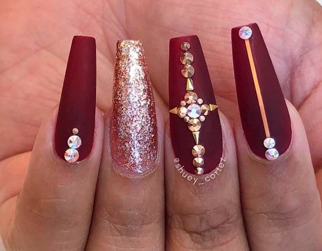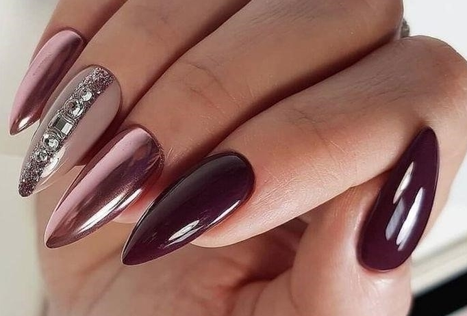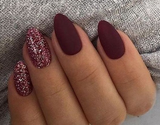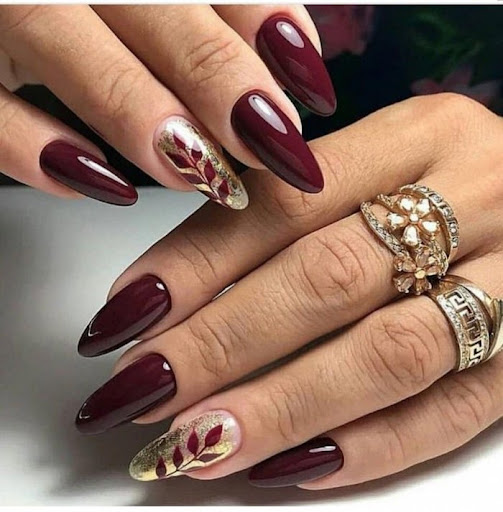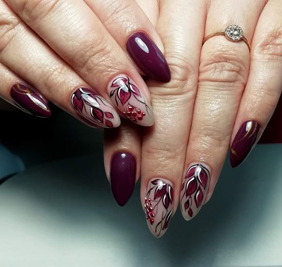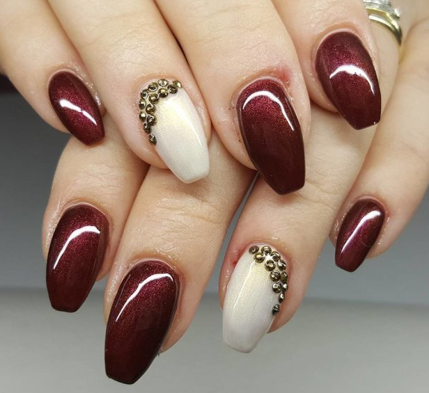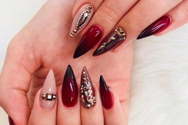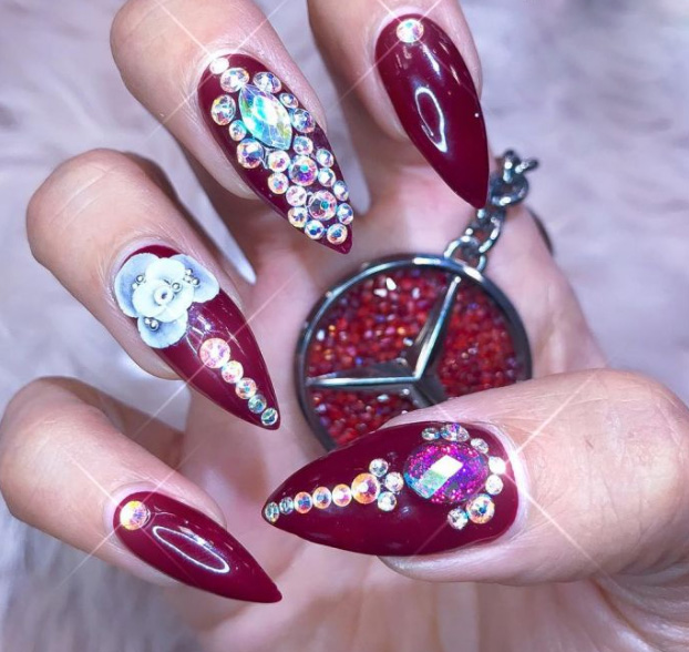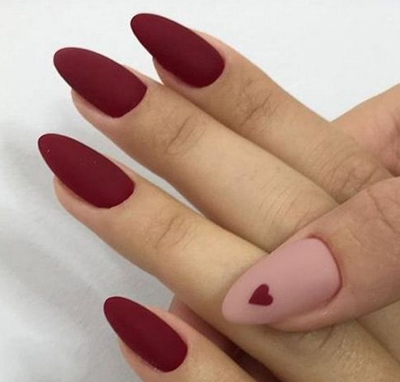 Острая форма пластины — это смело, изысканно и привлекательно. Такой маникюр абсолютно точно не останется без внимания. Бордовый оттенок сделает его еще более заметным, поэтому дизайн следует выбирать осторожно. Обилие элементов может сделать его безвкусным и даже вульгарным.