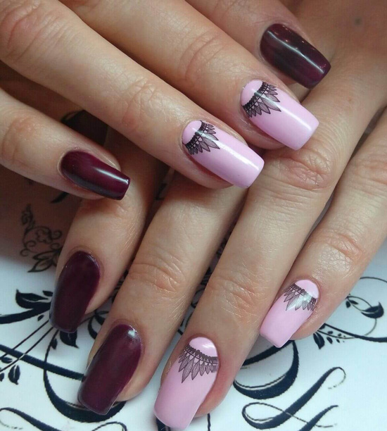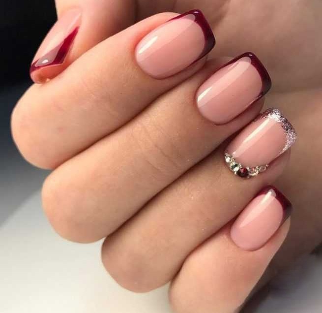 Сочетание нежности и страсти в одном дизайне. Вы можете воплотить идею контрастного омбре, нарисовать цветы или капли на нежной базе, выделить винную полоску френча на розовом фоне или нарисовать полоску для страз темным рубиновым.