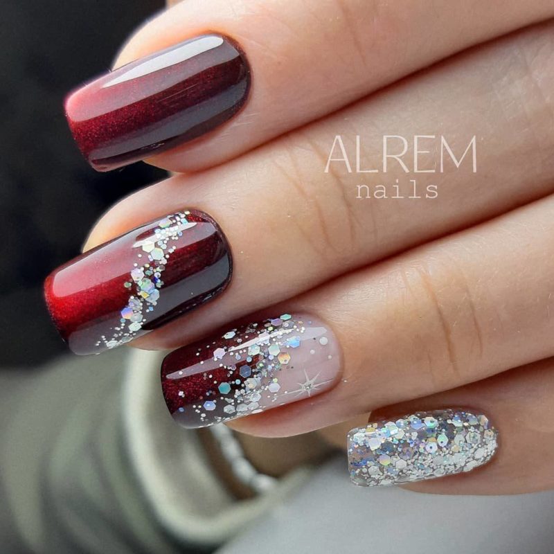 Блестки — оптимальный декор, освежающий и делающий маникюр праздничным. Их можно нанести сразу или добавить тогда, когда это будет необходимо. Откажитесь от традиций, нанесите блестки, например, только на кончики ногтей широкой полоской.