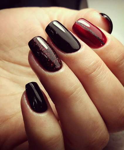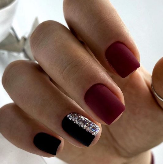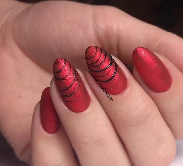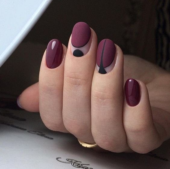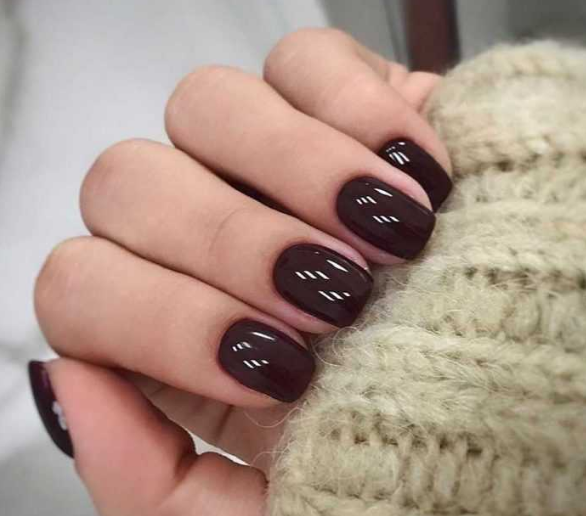 В зависимости от освещения такой маникюр может показаться почти черным или темно-красным. Сложный оттенок, который отлично уживается с любым видом дизайна.