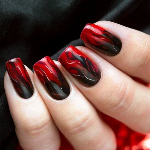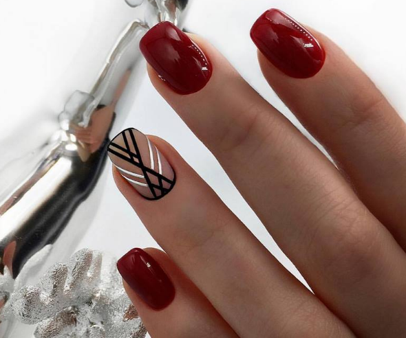 Квадратная форма отлично смотрится с покрытием бордового оттенка. При короткой длине не стоит перегружать ногти декором типа страз или 3D рисунков. Это может визуально укоротить пластину, а вот на длинные квадратные ногти дизайн можно украшать не боясь, что он будет смотреться наляписто. Обратите внимание на рисунки, выделение ногтей втиркой, френч и лунный маникюр, negative space, геометрические полоски фольгированным материалом.