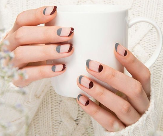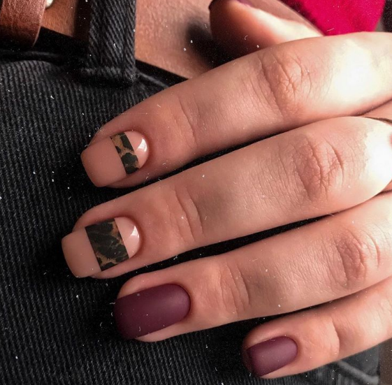 Декор поможет создать впечатление глубины, многослойности пластины — сочетание камуфлирующего лака с глубокими винными оттенками в стиле negative space. Другой вариант — бежевый с бордовым. Это естественная классика.