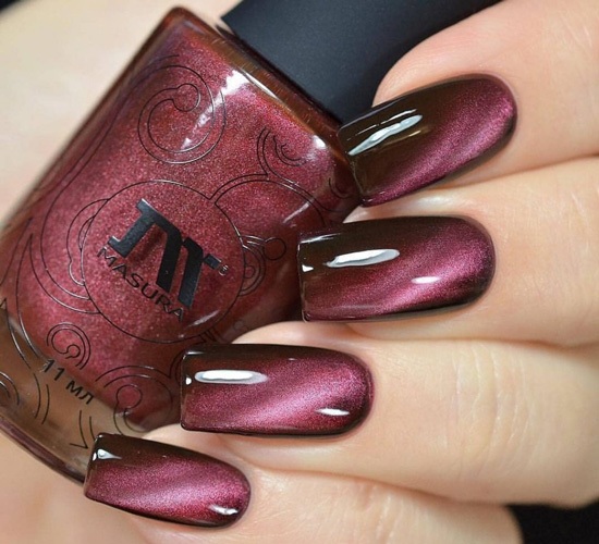 Магнитный лак, который позволяет создать маникюр с магическими переливами, напоминающими камень кошачий глаз — на пике трендов уже не один сезон. Бордовый оттенок делает эти переливы загадочными, словно сама обладательница ноготков обладает особыми чарами.