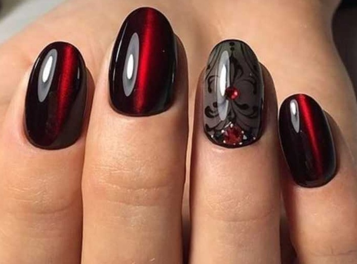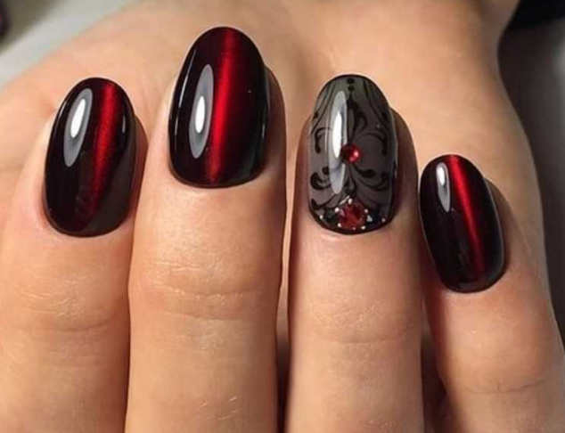 один пальчик на руке можно оставить с матовым покрытием бордового тона; - один пальчик может быть с другим рисунком — создайте его с помощью магнитика — проявите фантазию.