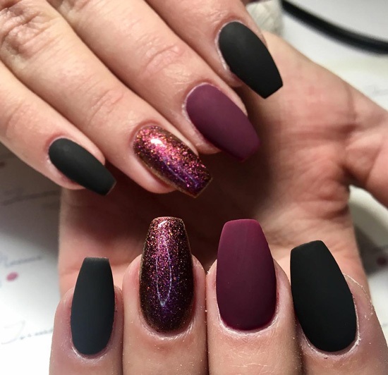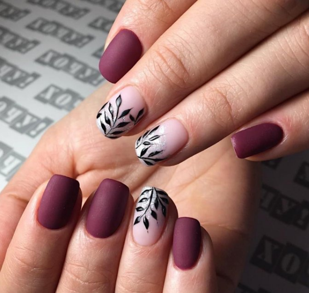 Многим такой дизайн кажется несколько траурным и ограниченным. Уверяем вас, это не так. С черным получится отличный нейл-арт в стиле омбре — от черного у основания пластины к светло-винному у края или наоборот. Другой вариант — выделение одного ногтя на руке с матовым топом, контрастные рисунки на любой по цвету базе. В любом случае у вас получится дерзкий и смелый дизайн.