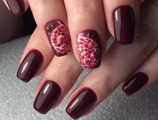 А это тон для тех, кто хочет яркости. Такой маникюр выглядит вкусным, ведь он напоминает созревшие на солнце сладкие ягоды. Декор может быть любым — рисунки, цветной френч, втирки и блестки, стразы. Эффектно смотрится на ногтях дизайн с магнитным лаком.