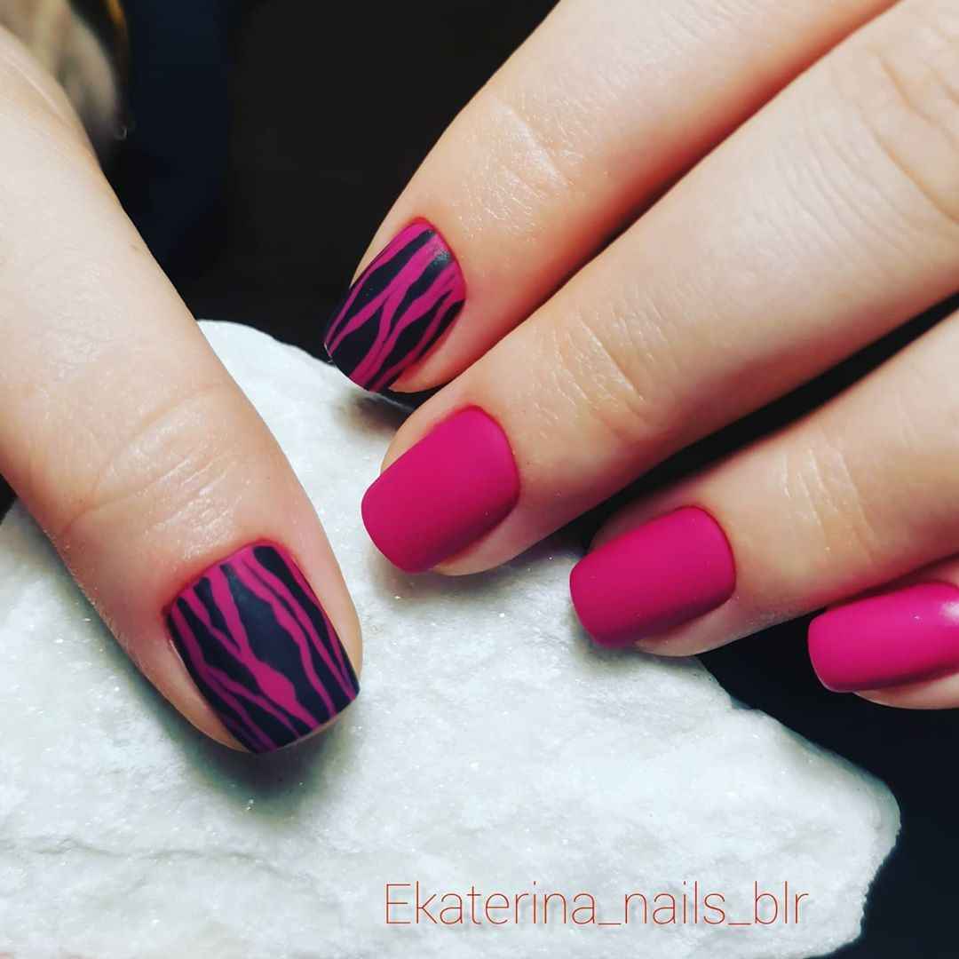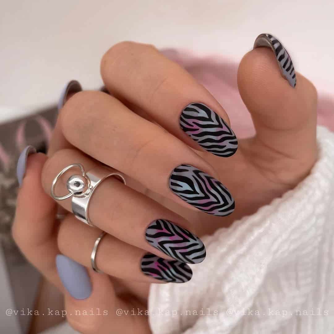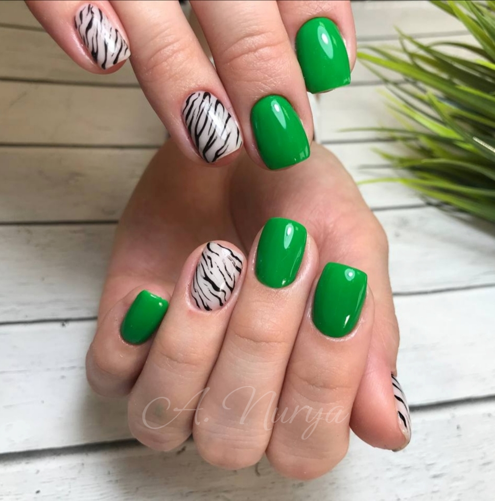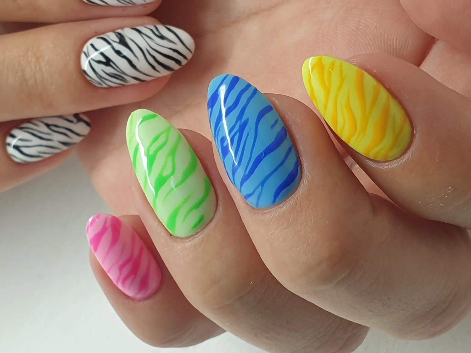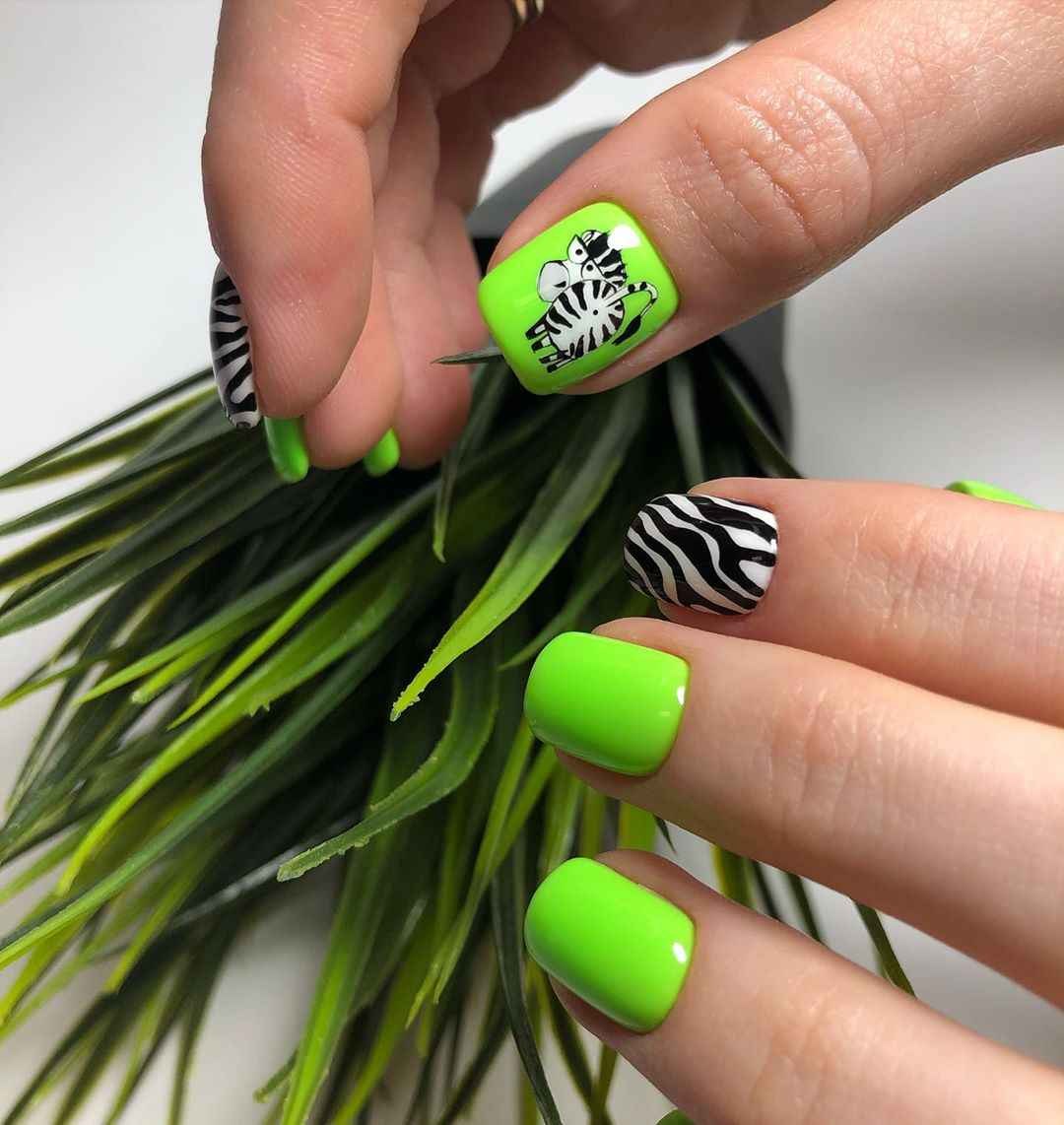 - животный принт: маникюр зебра основан на дизайне, вдохновленном рисунком зебры. Он имитирует черно-белую полосатую шкуру этого животного, что создает стильный и современный образ. Но это и так очевидно, не так ли? А что новенького в этом направлении? Все дело в цветной вариативности проверенного дизайна. Зебровый принт может быть настолько ярким и необычным, насколько вы к этому готовы;