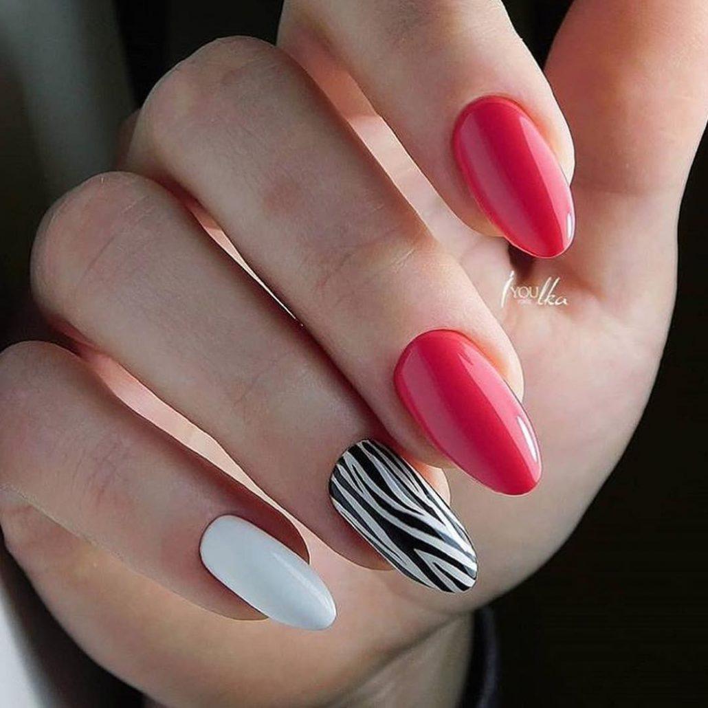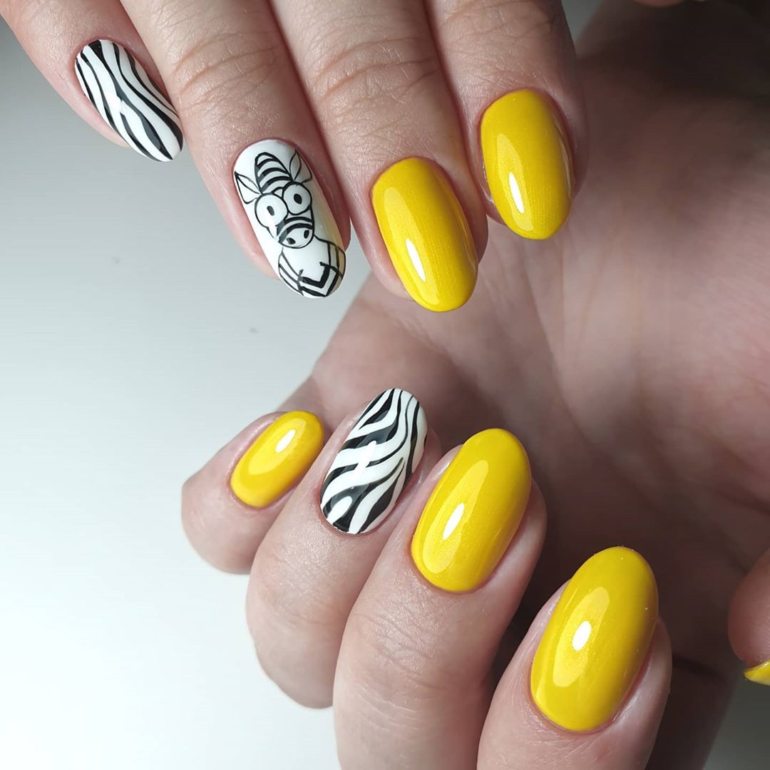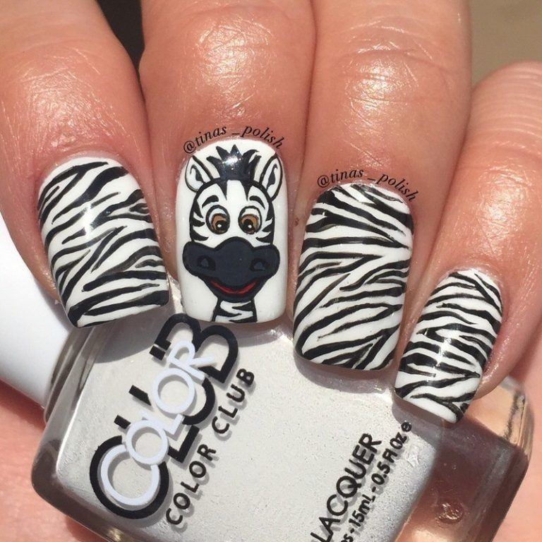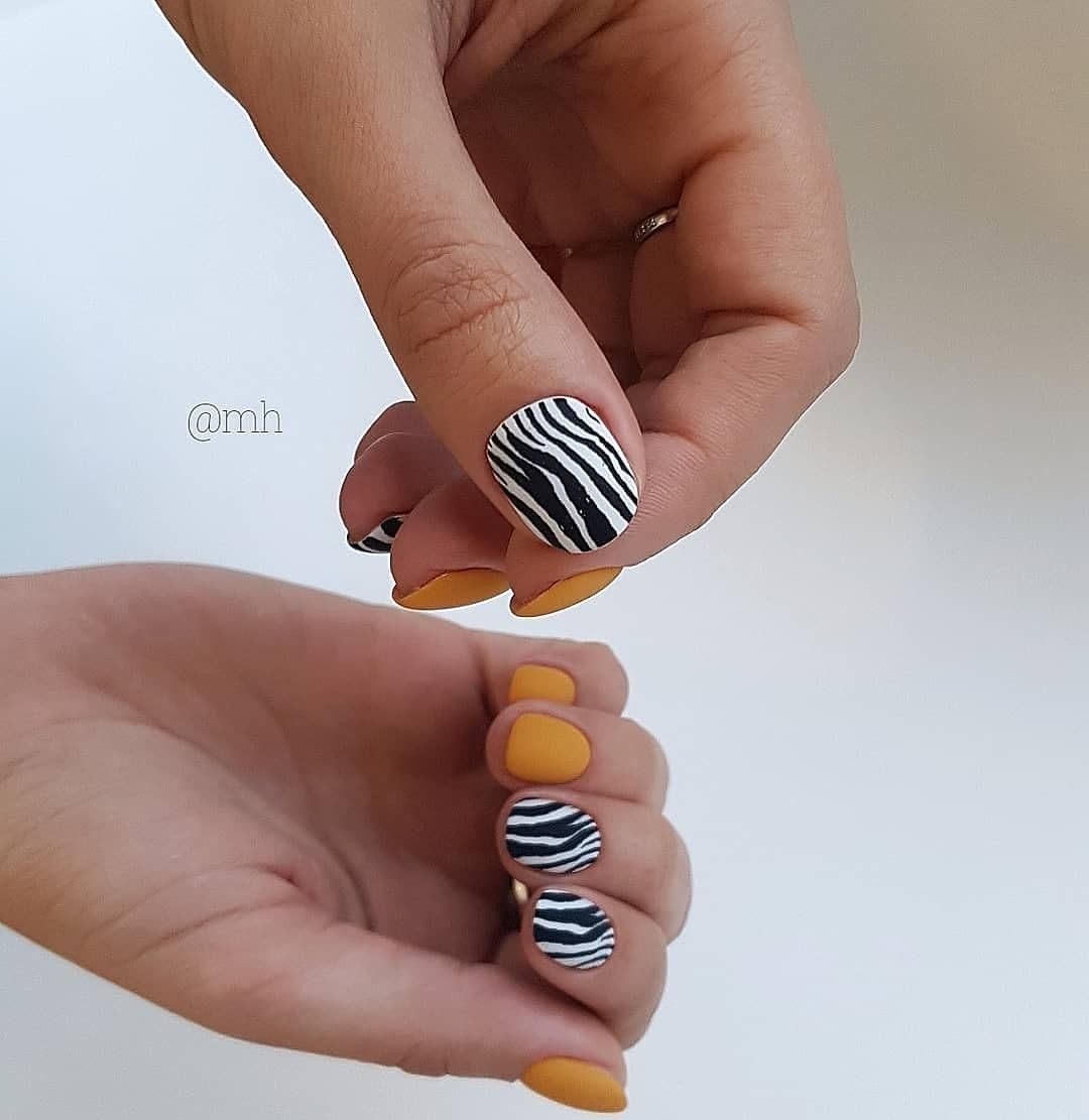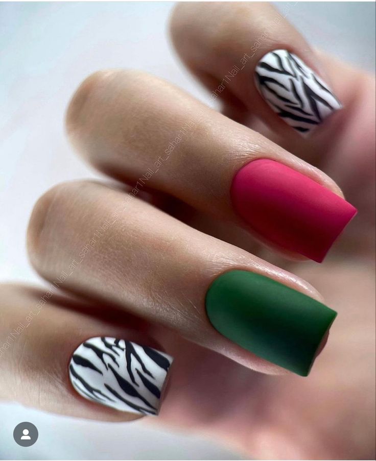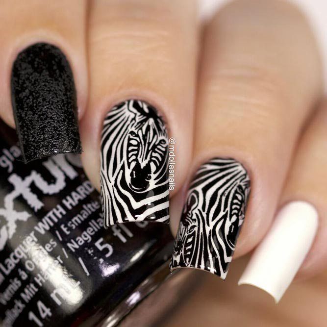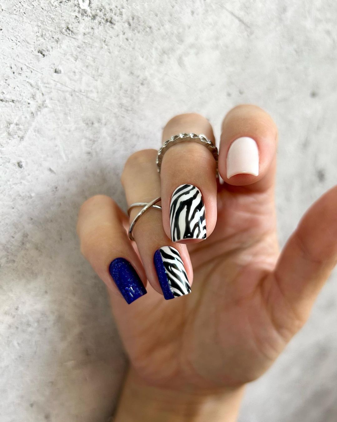 - животный принт: маникюр зебра основан на дизайне, вдохновленном рисунком зебры. Он имитирует черно-белую полосатую шкуру этого животного, что создает стильный и современный образ. Но это и так очевидно, не так ли? А что новенького в этом направлении? Все дело в цветной вариативности проверенного дизайна. Зебровый принт может быть настолько ярким и необычным, насколько вы к этому готовы;