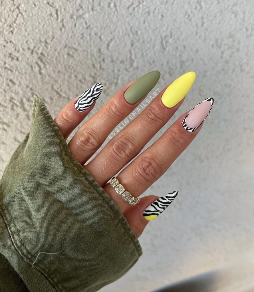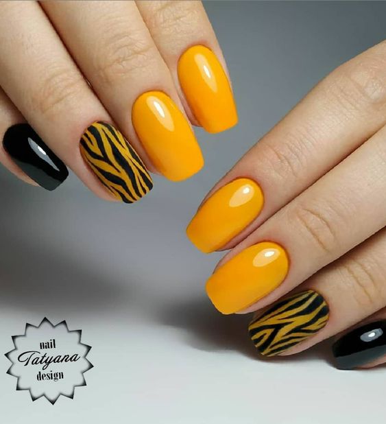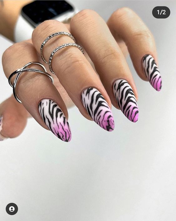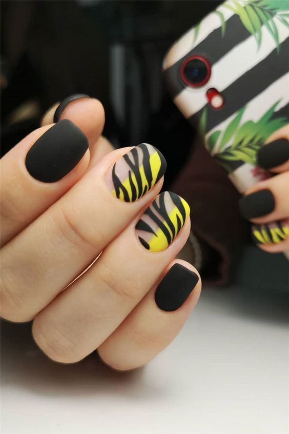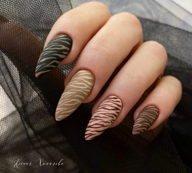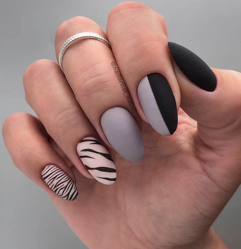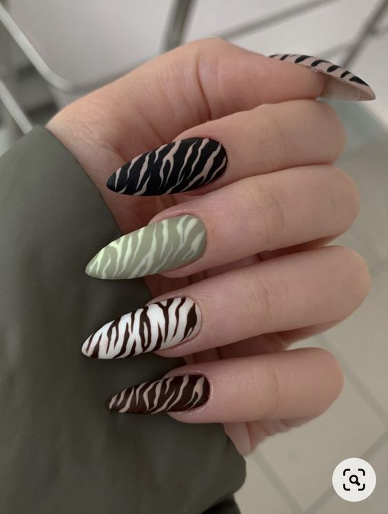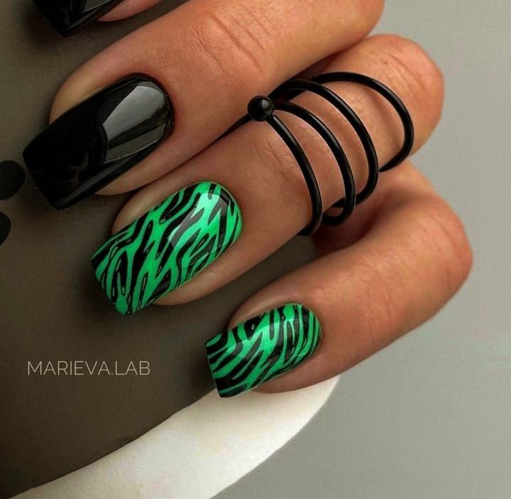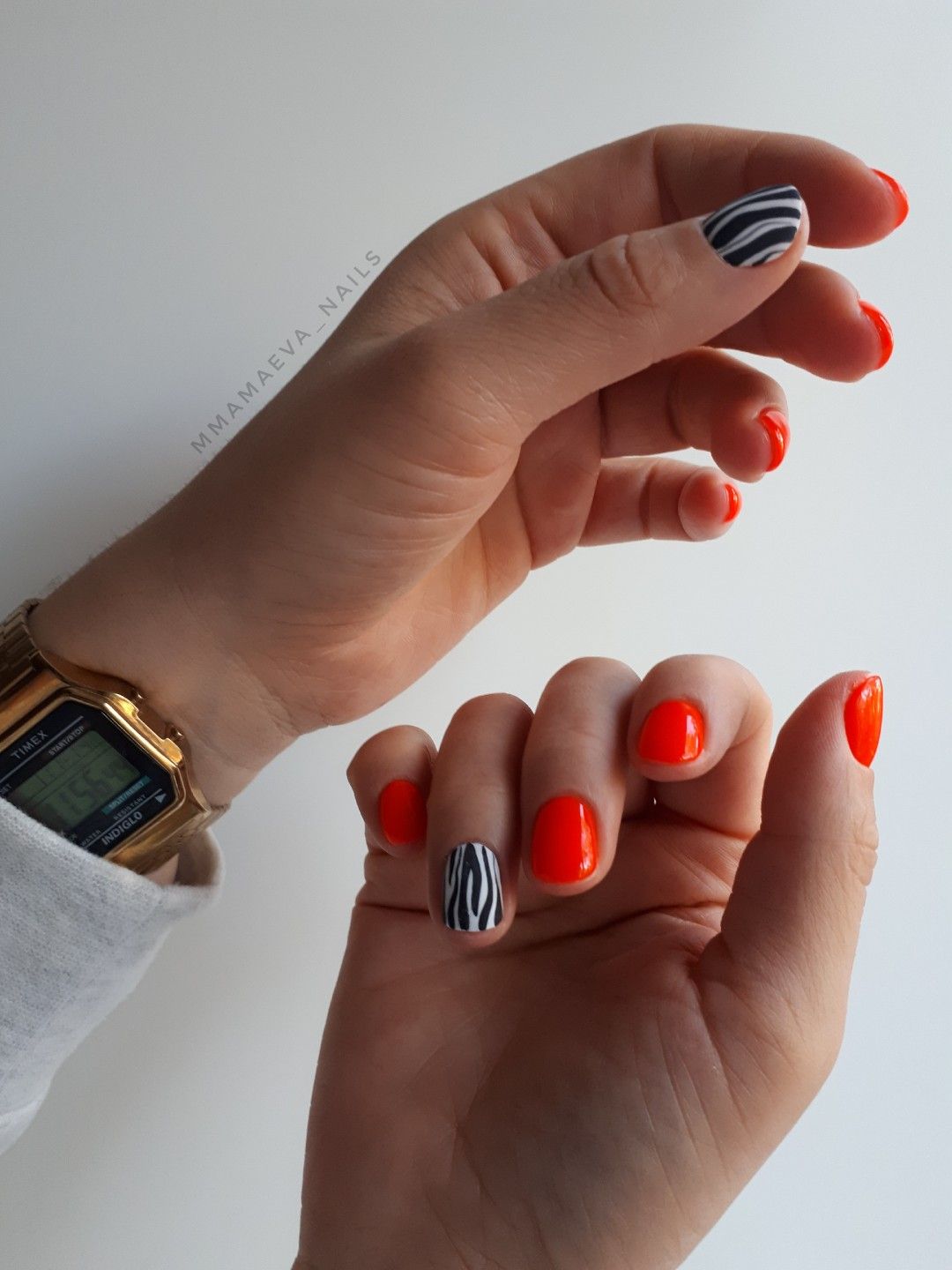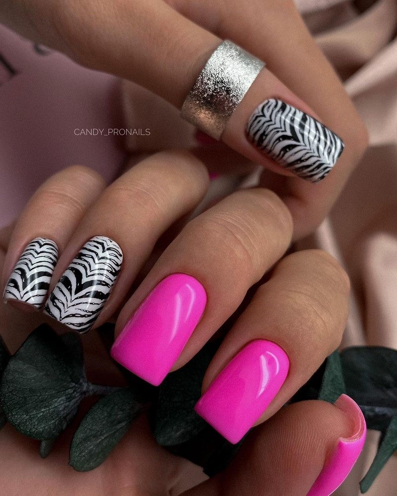 - животный принт: маникюр зебра основан на дизайне, вдохновленном рисунком зебры. Он имитирует черно-белую полосатую шкуру этого животного, что создает стильный и современный образ. Но это и так очевидно, не так ли? А что новенького в этом направлении? Все дело в цветной вариативности проверенного дизайна. Зебровый принт может быть настолько ярким и необычным, насколько вы к этому готовы;
