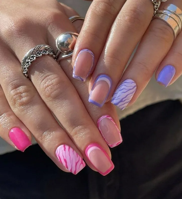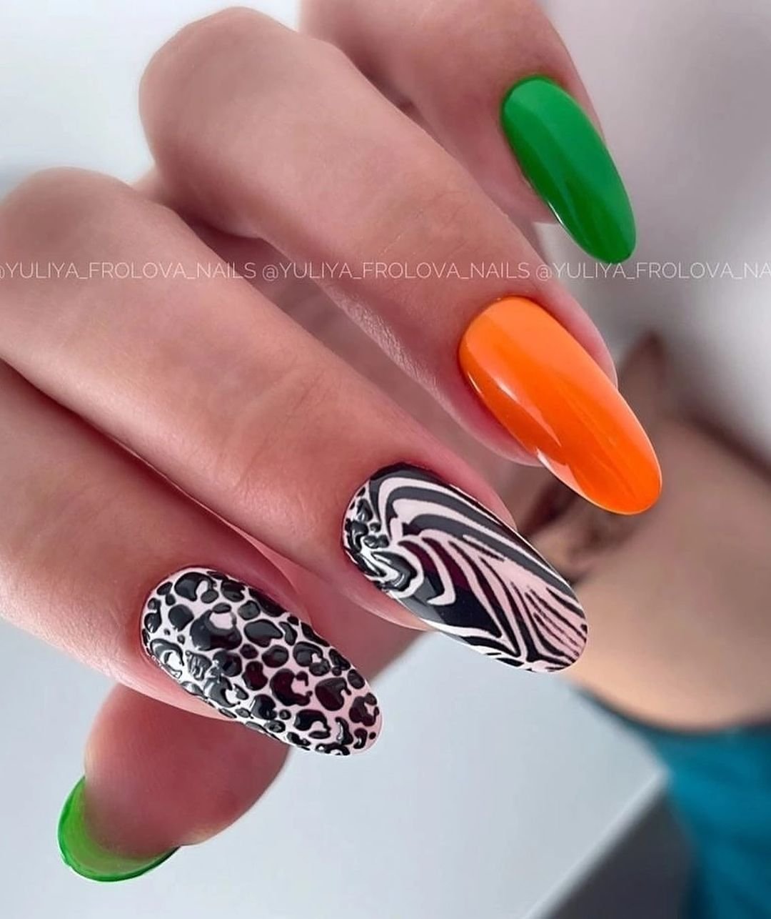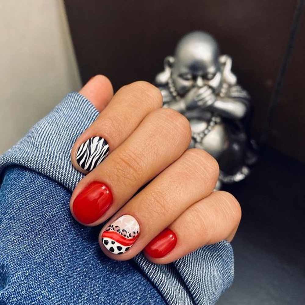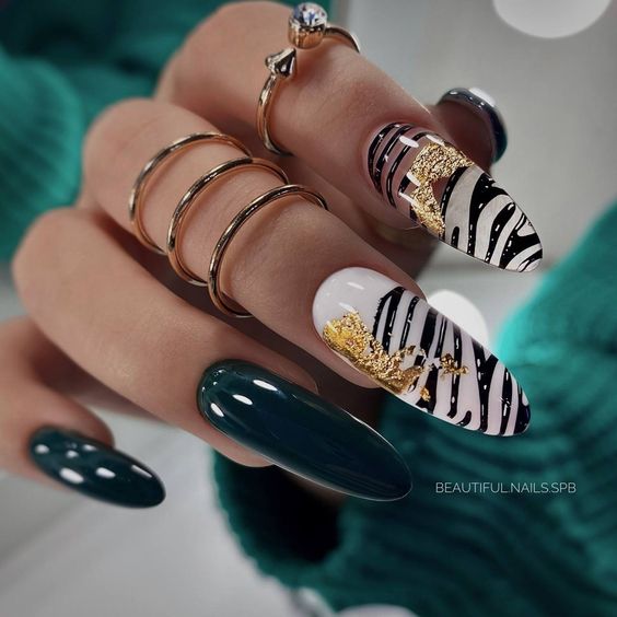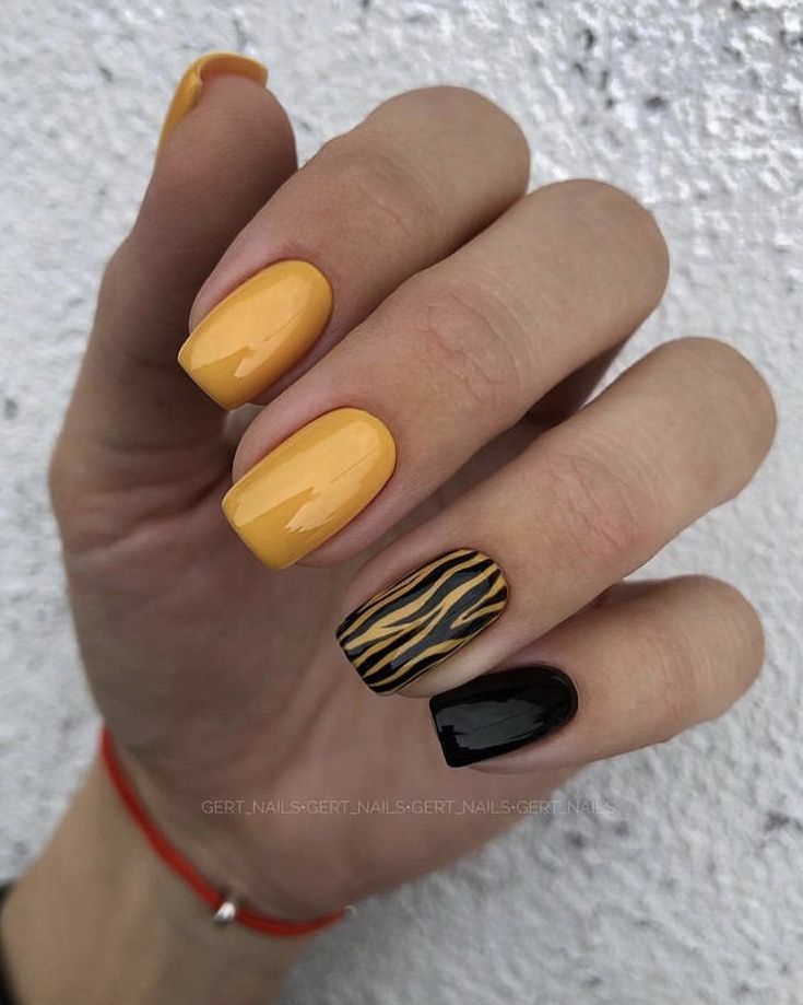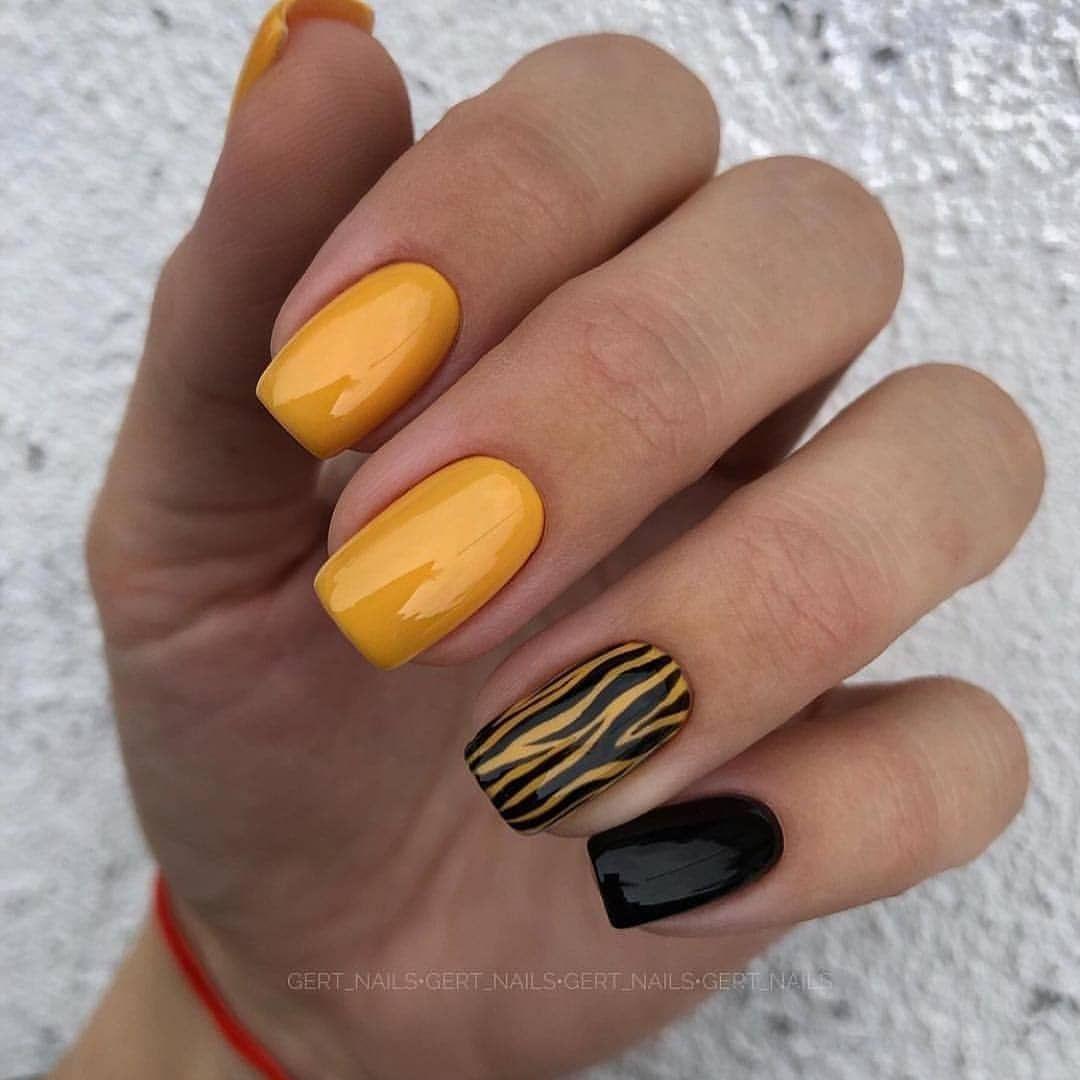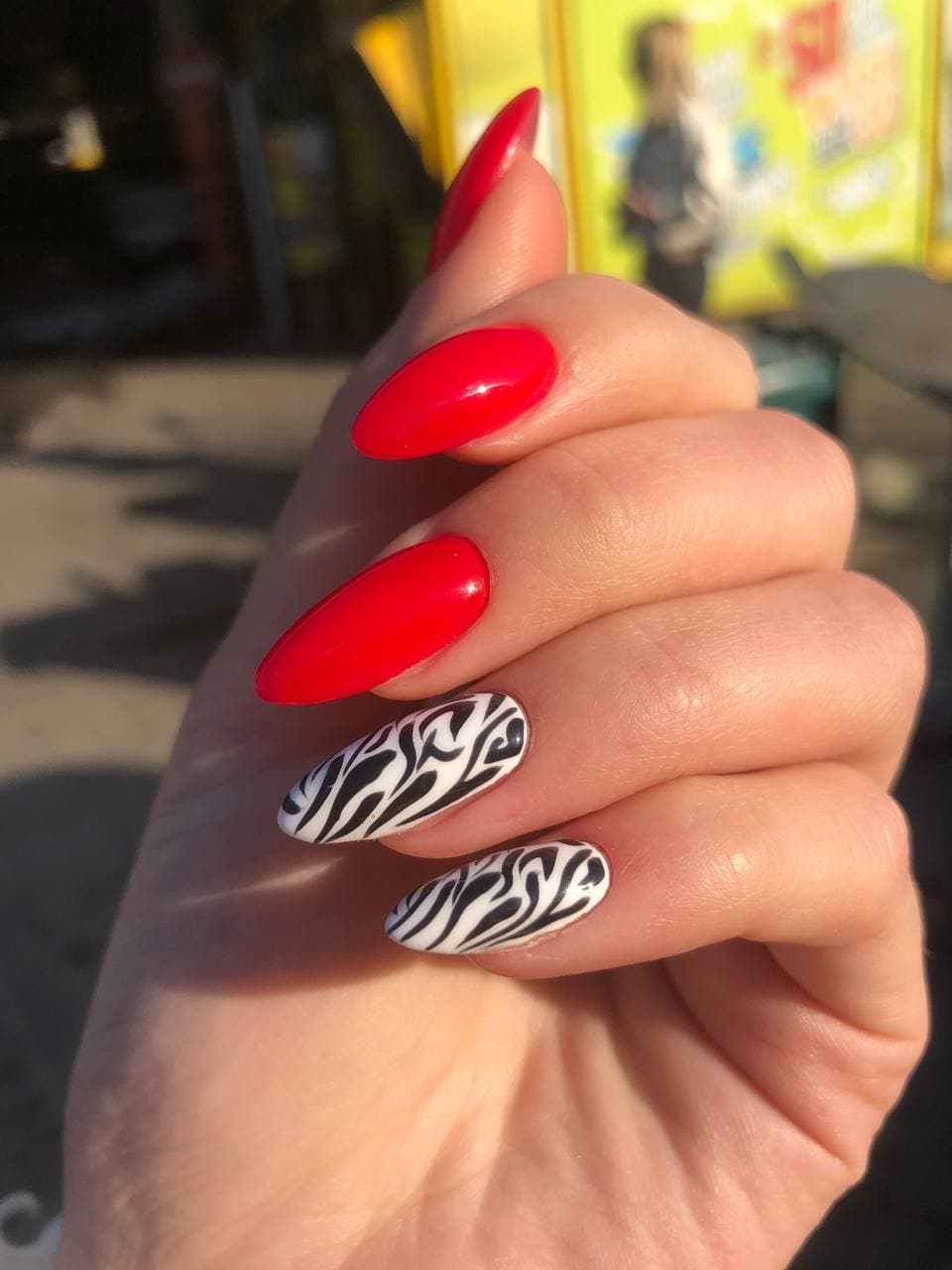 - животный принт: маникюр зебра основан на дизайне, вдохновленном рисунком зебры. Он имитирует черно-белую полосатую шкуру этого животного, что создает стильный и современный образ. Но это и так очевидно, не так ли? А что новенького в этом направлении? Все дело в цветной вариативности проверенного дизайна. Зебровый принт может быть настолько ярким и необычным, насколько вы к этому готовы;