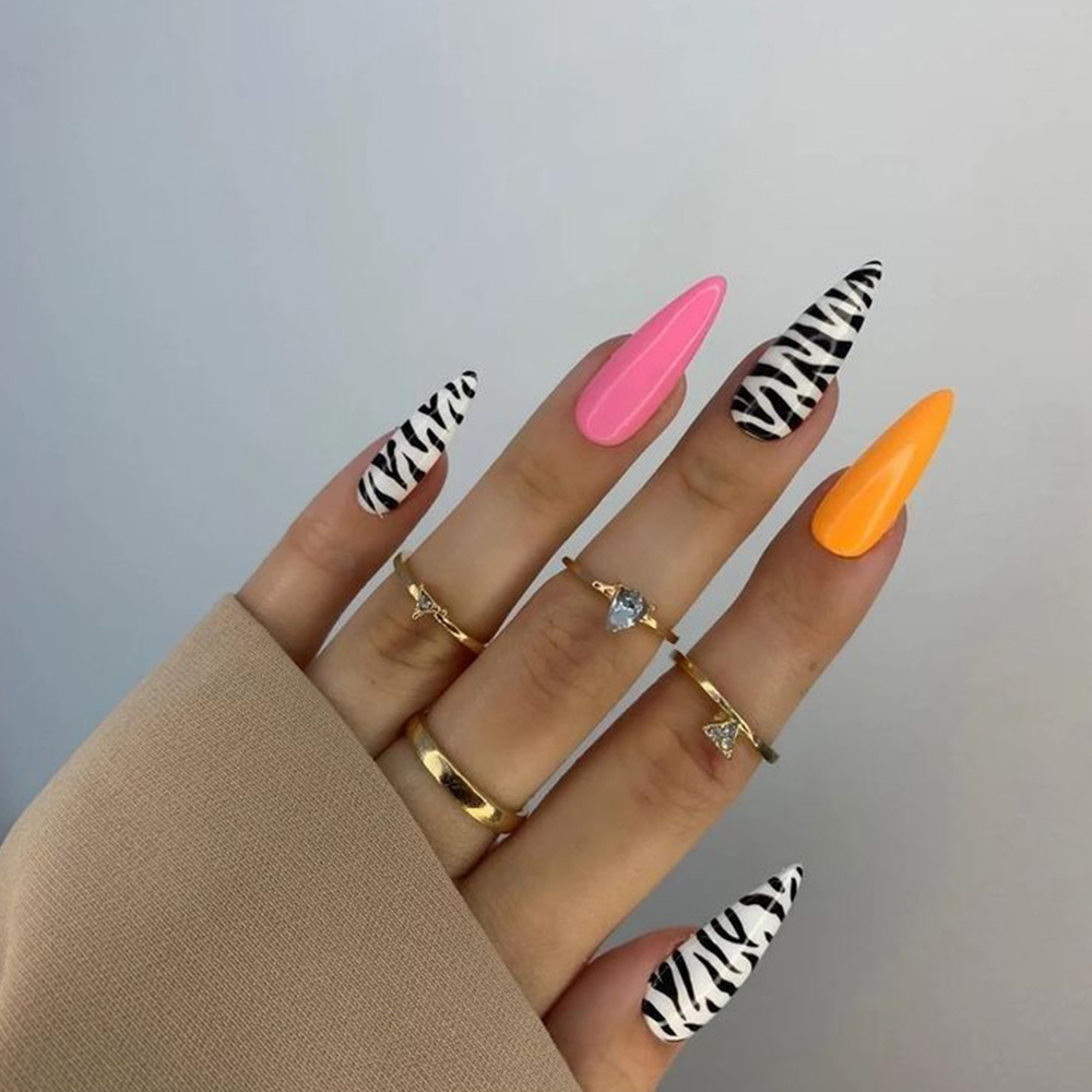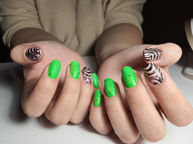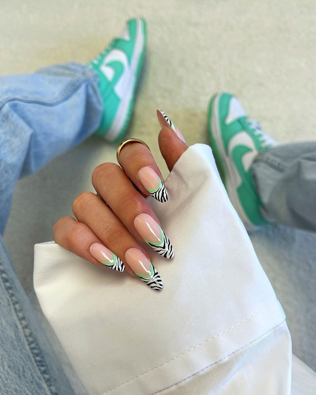 Не забывайте, что сам по себе зебровый принт — это довольно активный дизайн. если вы решили сочетать его с большой длиной, делайте это умеренно и аккуратно. Например, выбирайте акцентный ноготь или цветовую гамму в спокойных тонах.