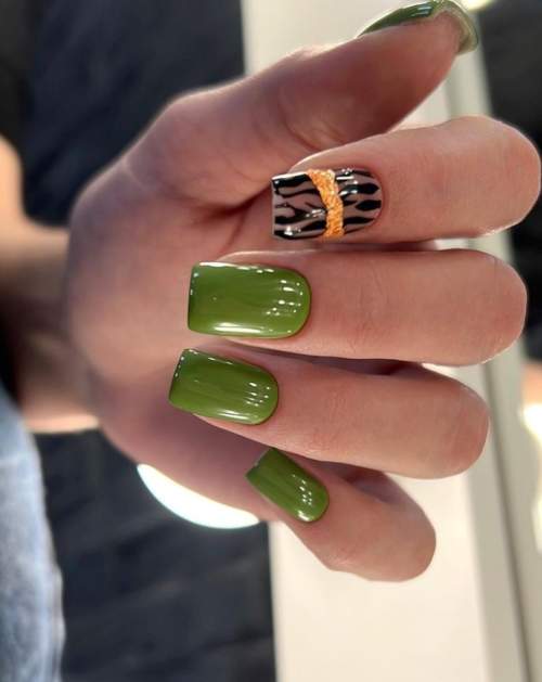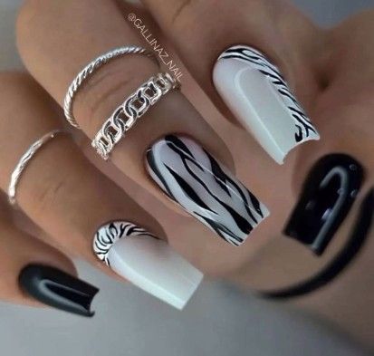 Обычно используются два основных цвета: черный и белый. Белые полосы на черном фоне создают эффект полосатого принта, напоминающего шкуру зебры. Дизайн может быть выполнен на всех ногтях или использован как акцентный элемент на одном или нескольких ногтях. Креативность и мастерство могут добавить различные вариации: использование других ярких цветов, добавление дополнительных узоров или элементов декора, таких как стразы, блестки или 3D-детали. Этот дизайн привлекателен и модный, и может стать стильным акцентом для вашего образа.